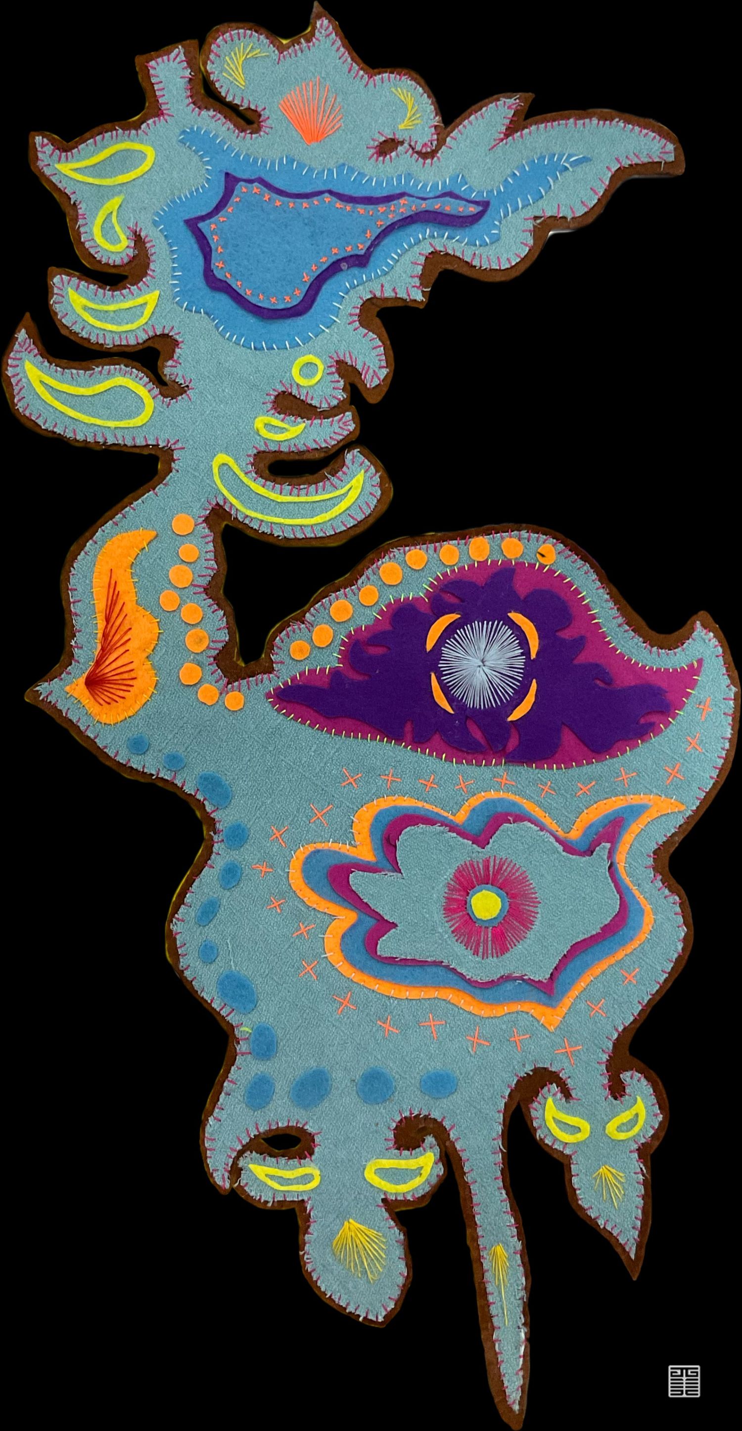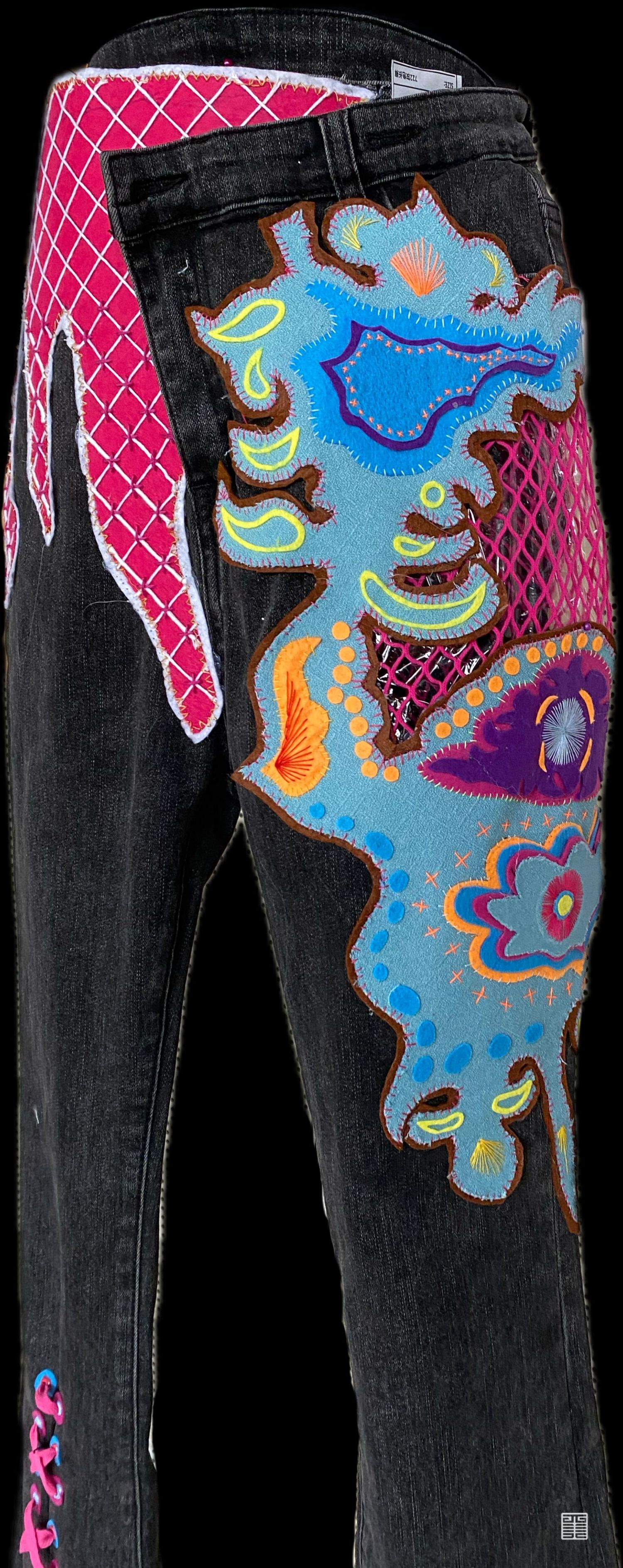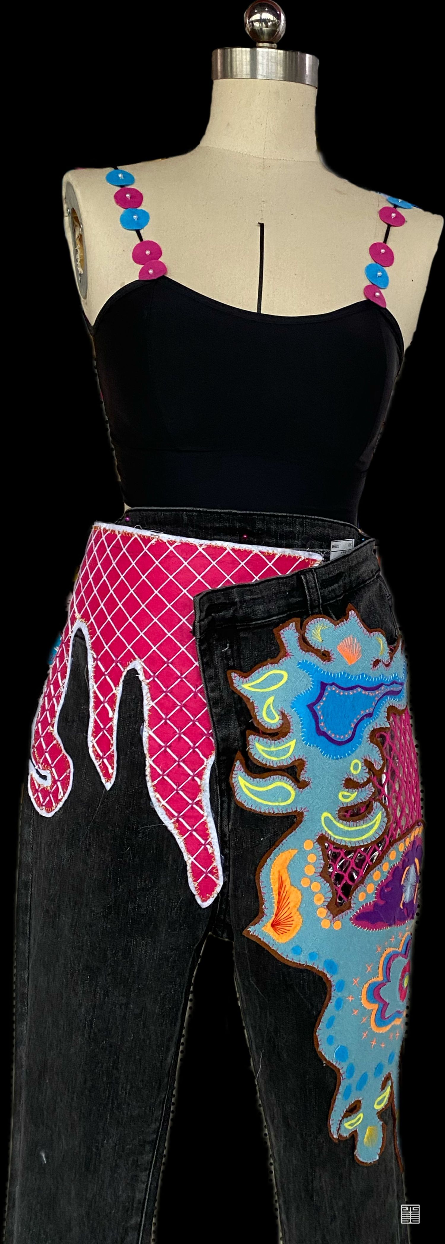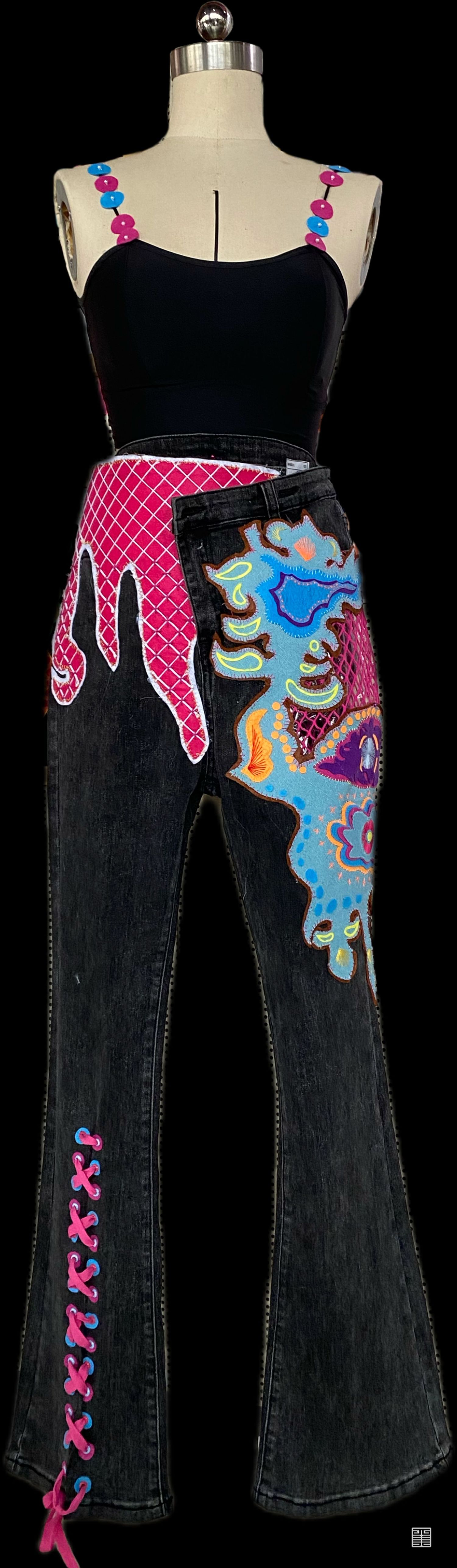 设计说明:从传统工艺布堆画上提取色彩进行搭配,从图形上延伸设计,并添加民间特色纹样进行装饰。另外添加绑带镂空设计使裤子更具有时尚性,裤子选用深灰色丹妮牛仔裤,使设计更为和谐
