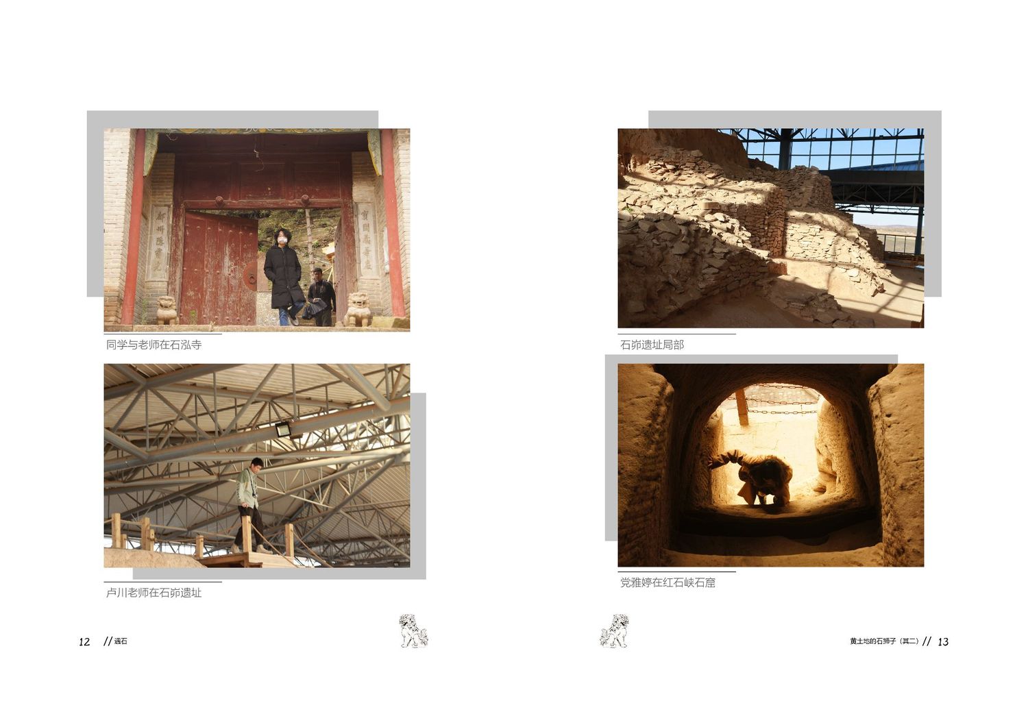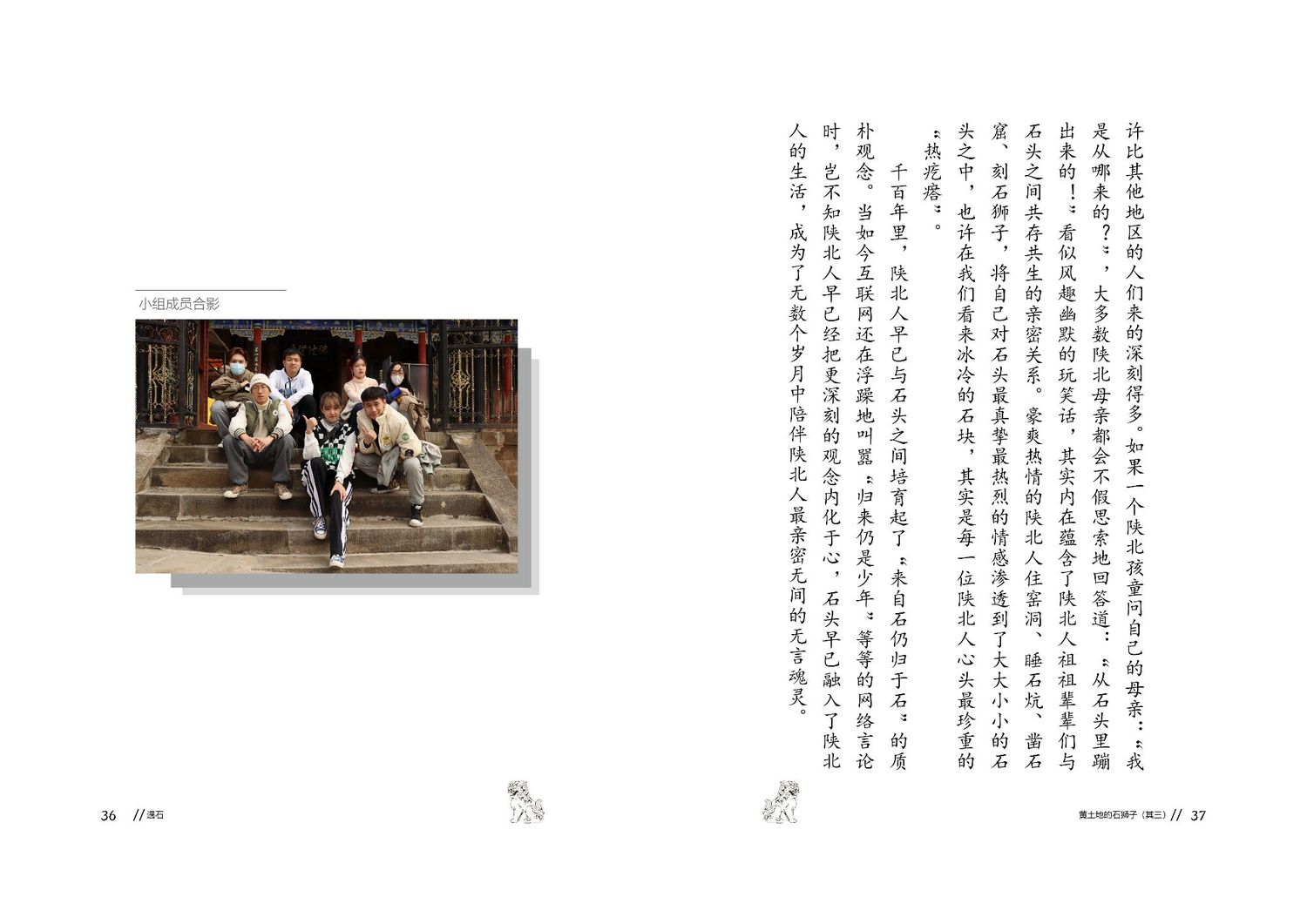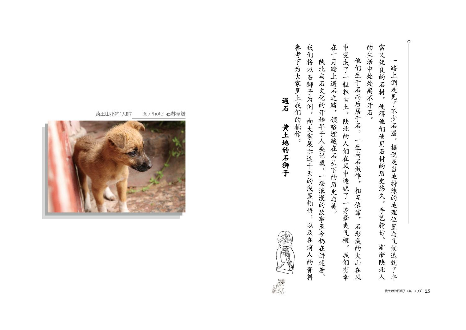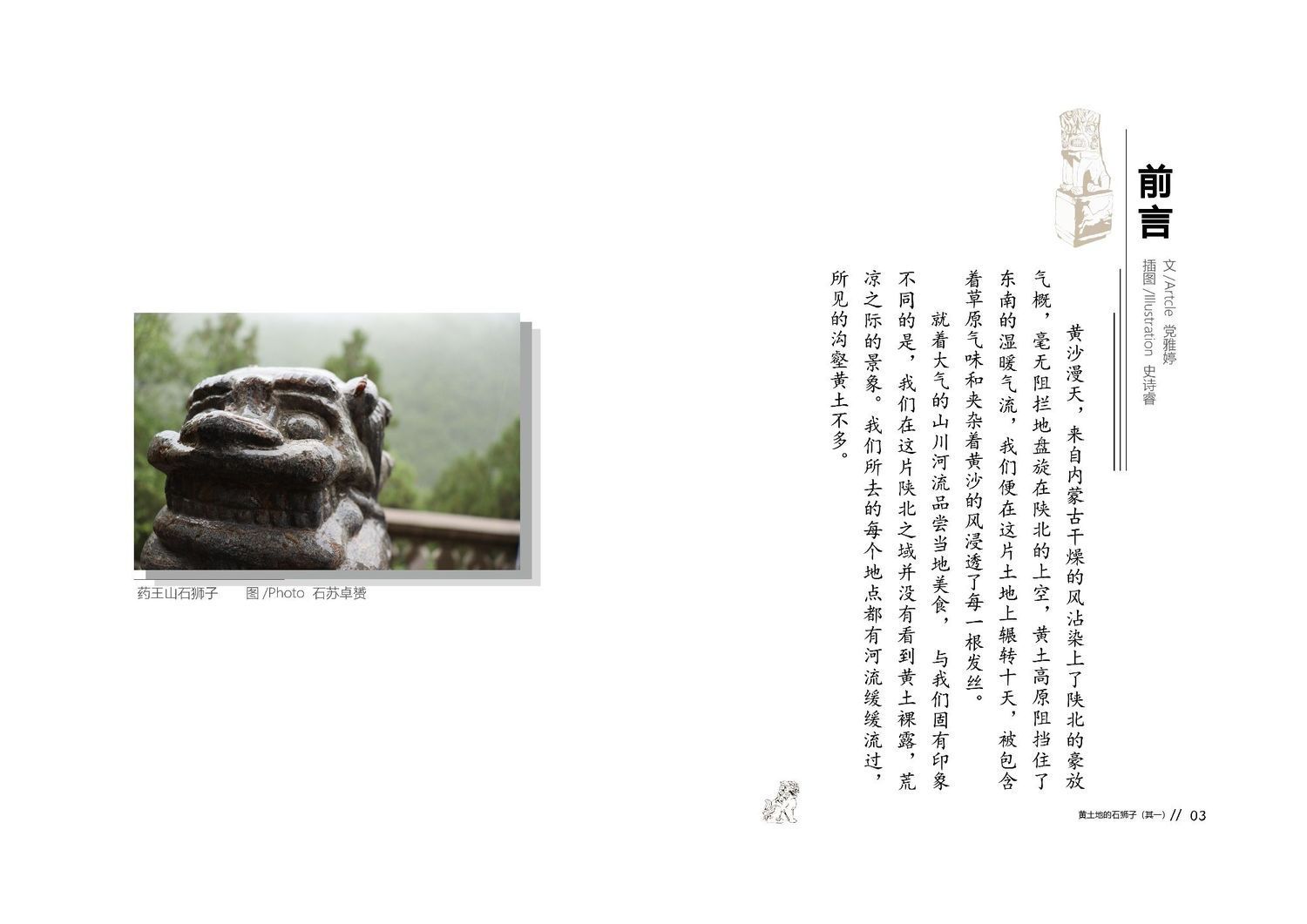 作品以石狮子为核心,通过查阅资料以及写生路上的所见所闻编写而成,全书共七章,前三章主要是陕北的地理生态与人文内容的简介,起到了一个承接下文的作用。而第四到第七章,则介绍了陕北石狮子的历史,种类,文化和现状。文字部分总共为三本书,另一本书为写生影集,记录了写生路上的各种瞬间,四本书拼合起来即为完整作品。因篇幅限制,作品图中仅放入了书籍内容跨页形式的节选,并非完整作品。