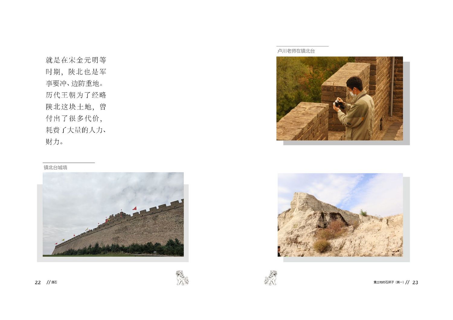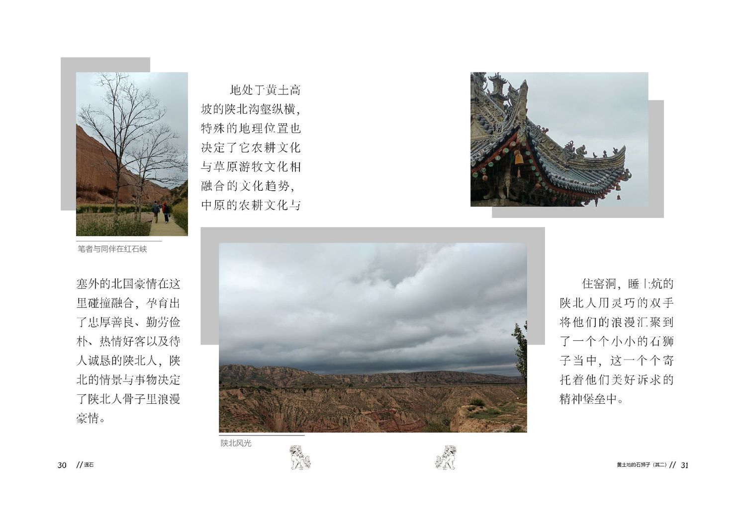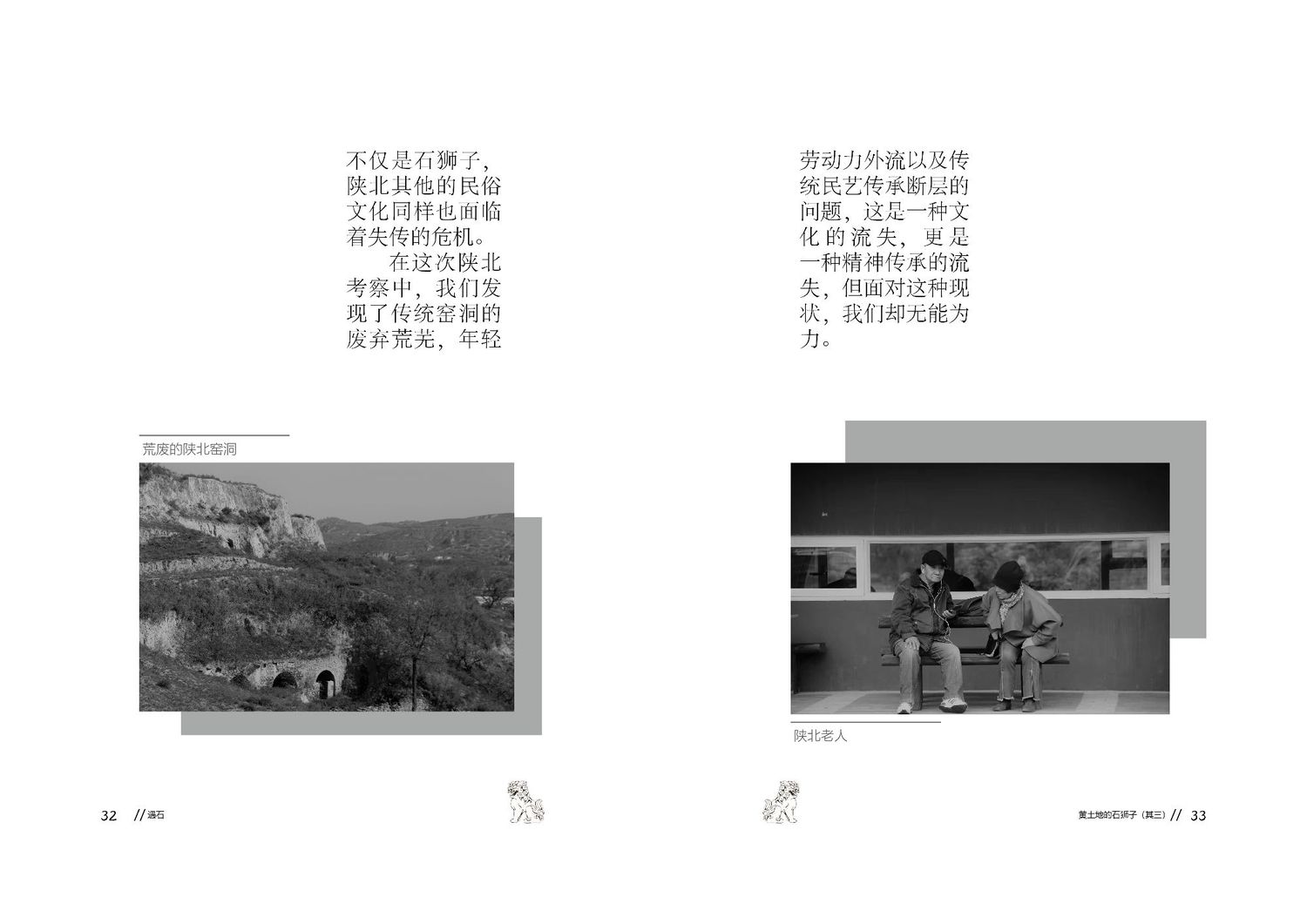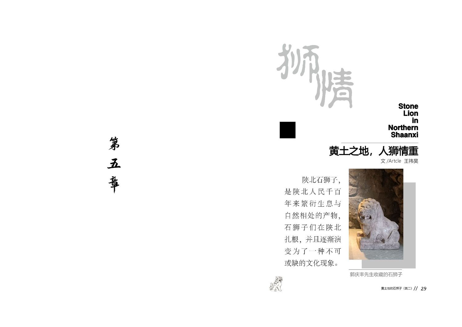 作品以石狮子为核心,通过查阅资料以及写生路上的所见所闻编写而成,全书共七章,前三章主要是陕北的地理生态与人文内容的简介,起到了一个承接下文的作用。而第四到第七章,则介绍了陕北石狮子的历史,种类,文化和现状。文字部分总共为三本书,另一本书为写生影集,记录了写生路上的各种瞬间,四本书拼合起来即为完整作品。因篇幅限制,作品图中仅放入了书籍内容跨页形式的节选,并非完整作品。
