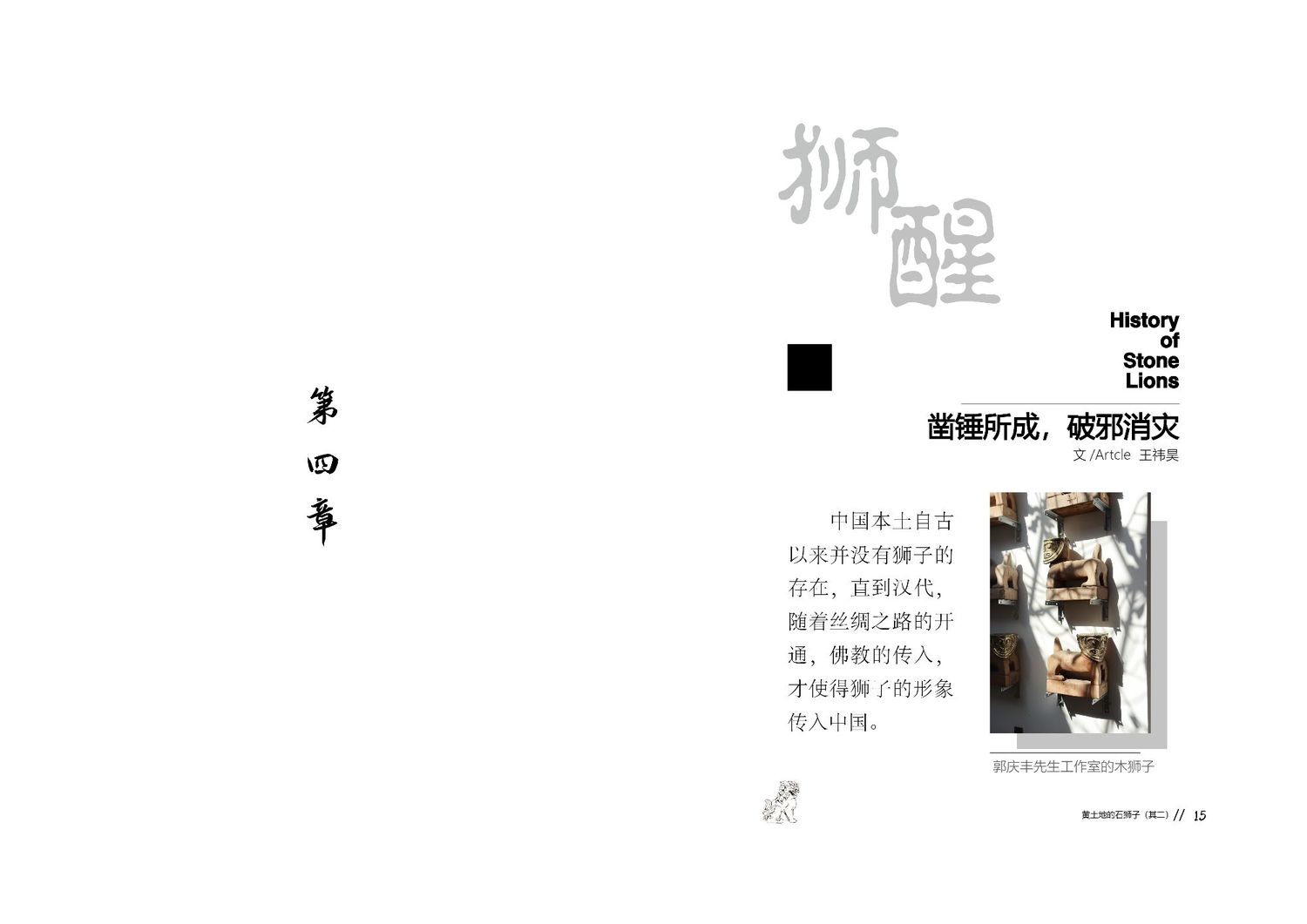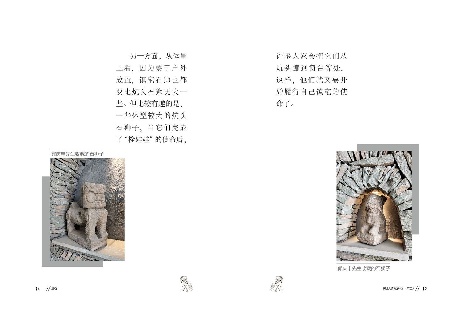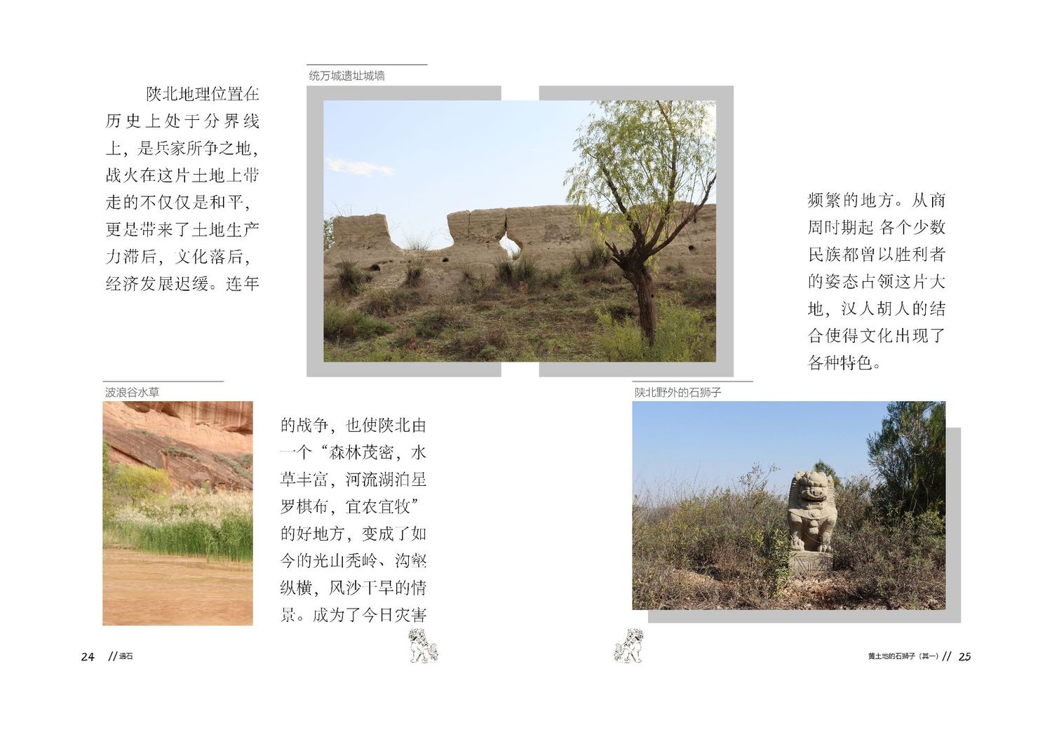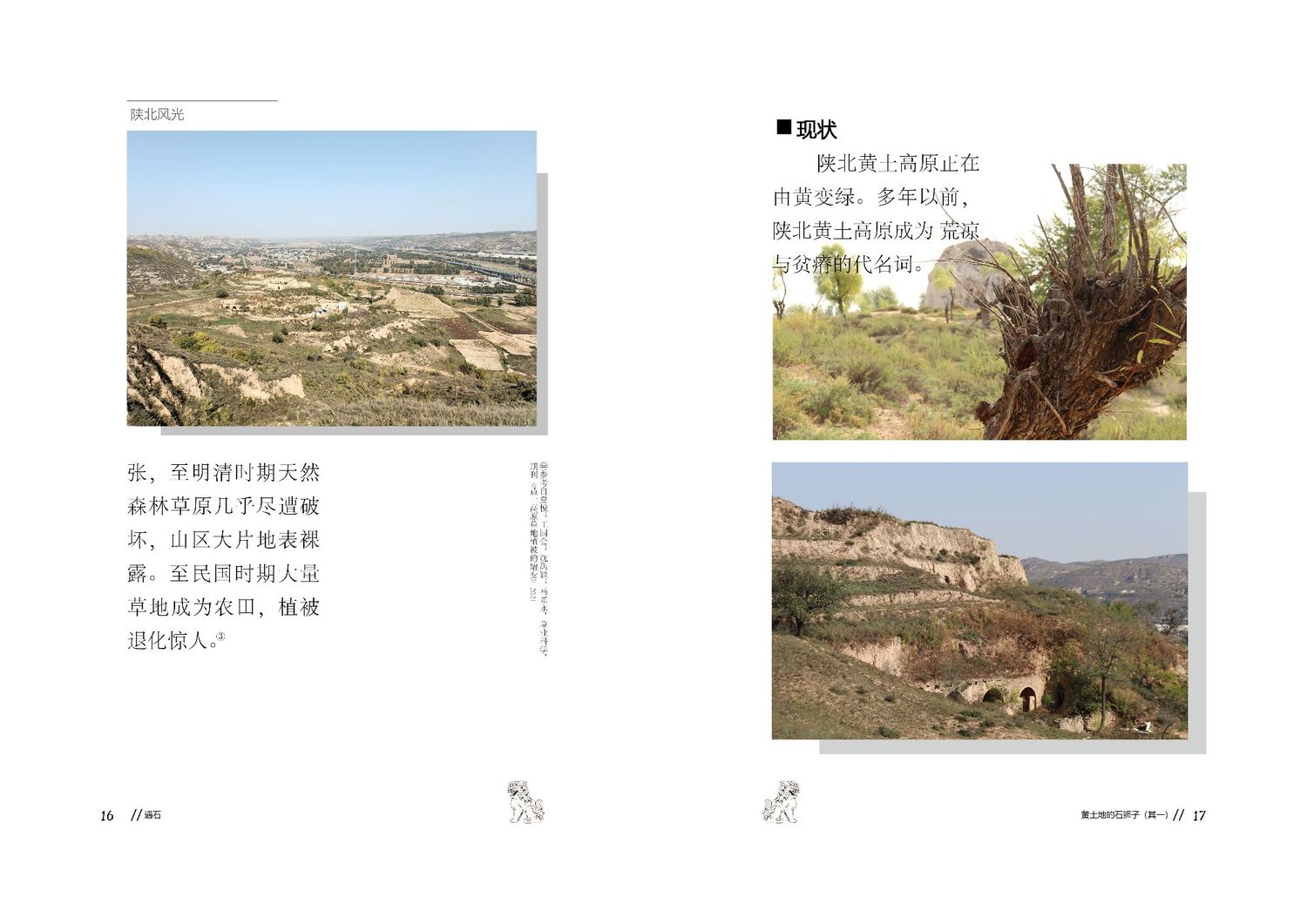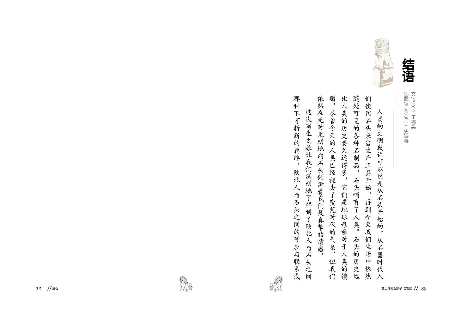 作品以石狮子为核心,通过查阅资料以及写生路上的所见所闻编写而成,全书共七章,前三章主要是陕北的地理生态与人文内容的简介,起到了一个承接下文的作用。而第四到第七章,则介绍了陕北石狮子的历史,种类,文化和现状。文字部分总共为三本书,另一本书为写生影集,记录了写生路上的各种瞬间,四本书拼合起来即为完整作品。因篇幅限制,作品图中仅放入了书籍内容跨页形式的节选,并非完整作品。