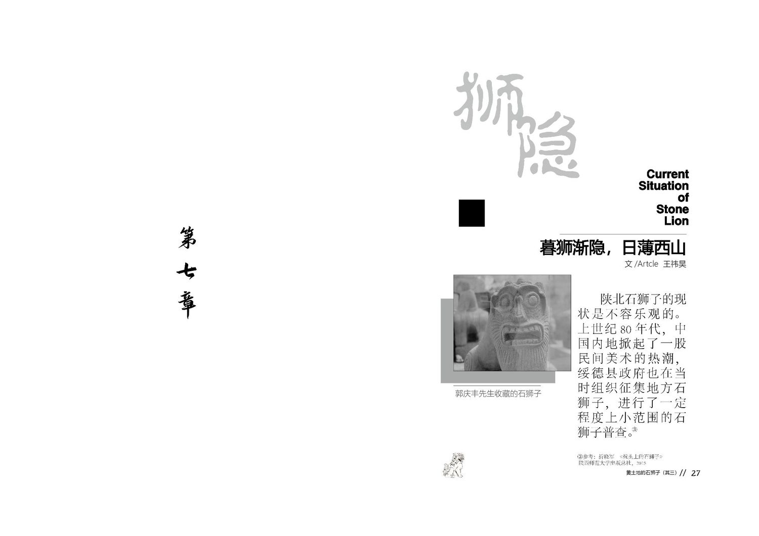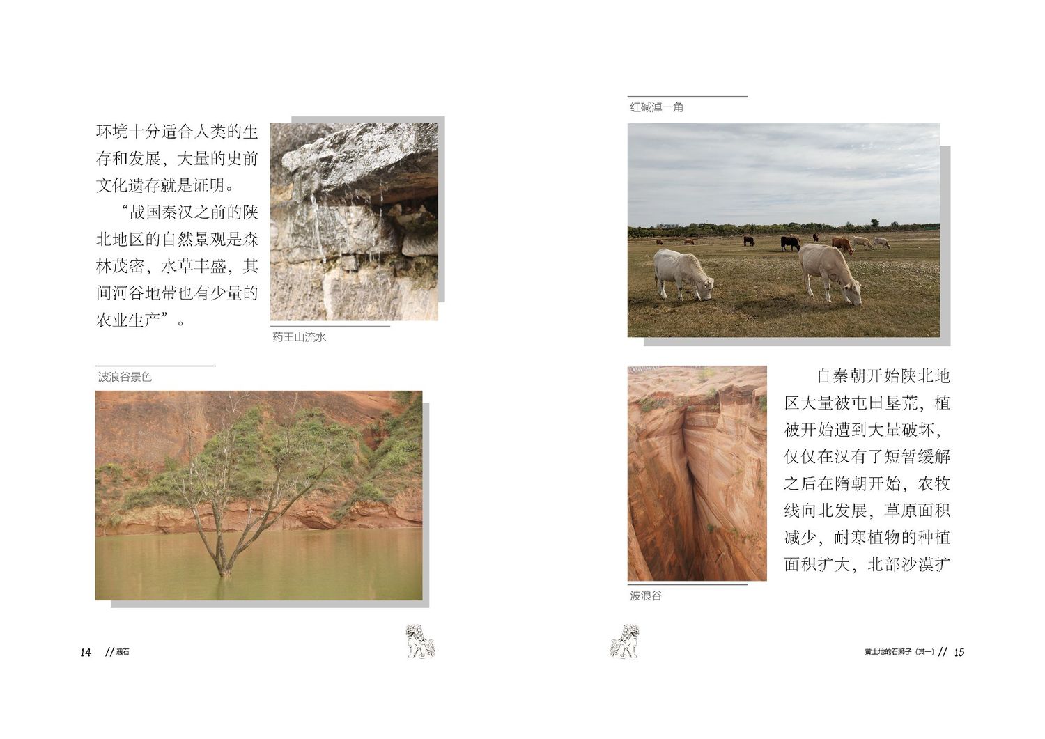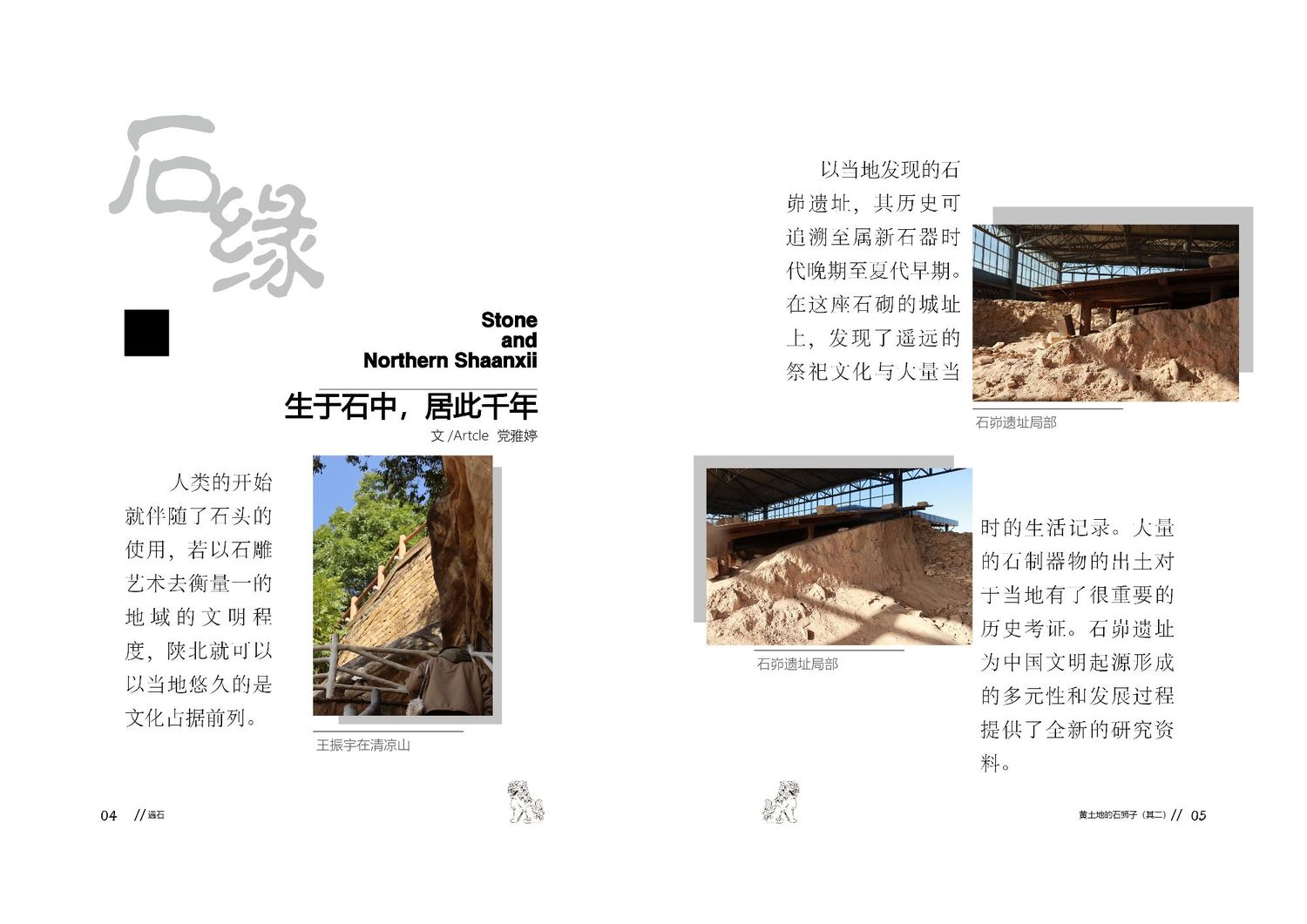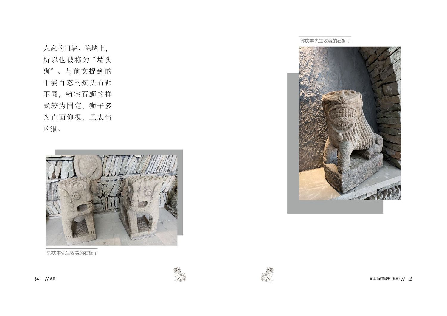 作品以石狮子为核心,通过查阅资料以及写生路上的所见所闻编写而成,全书共七章,前三章主要是陕北的地理生态与人文内容的简介,起到了一个承接下文的作用。而第四到第七章,则介绍了陕北石狮子的历史,种类,文化和现状。文字部分总共为三本书,另一本书为写生影集,记录了写生路上的各种瞬间,四本书拼合起来即为完整作品。因篇幅限制,作品图中仅放入了书籍内容跨页形式的节选,并非完整作品。