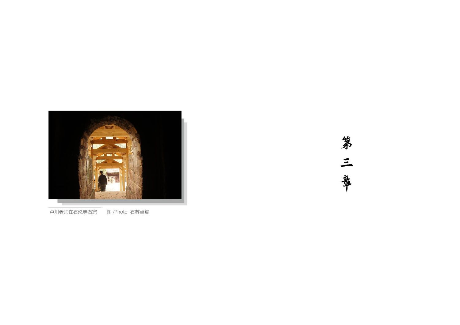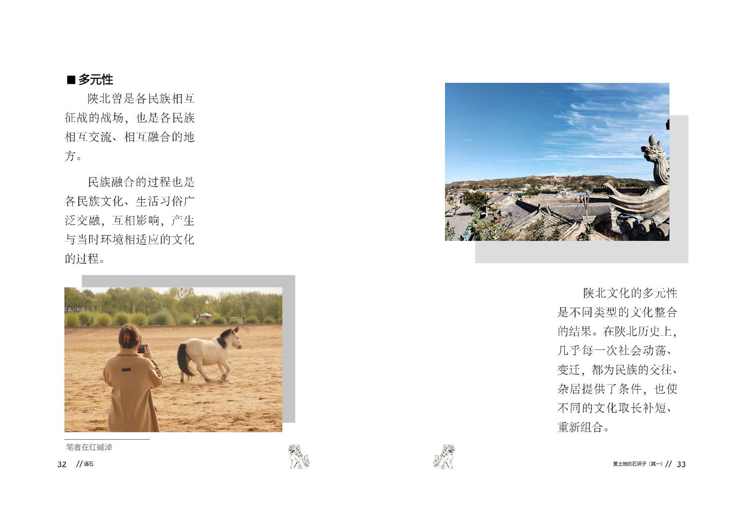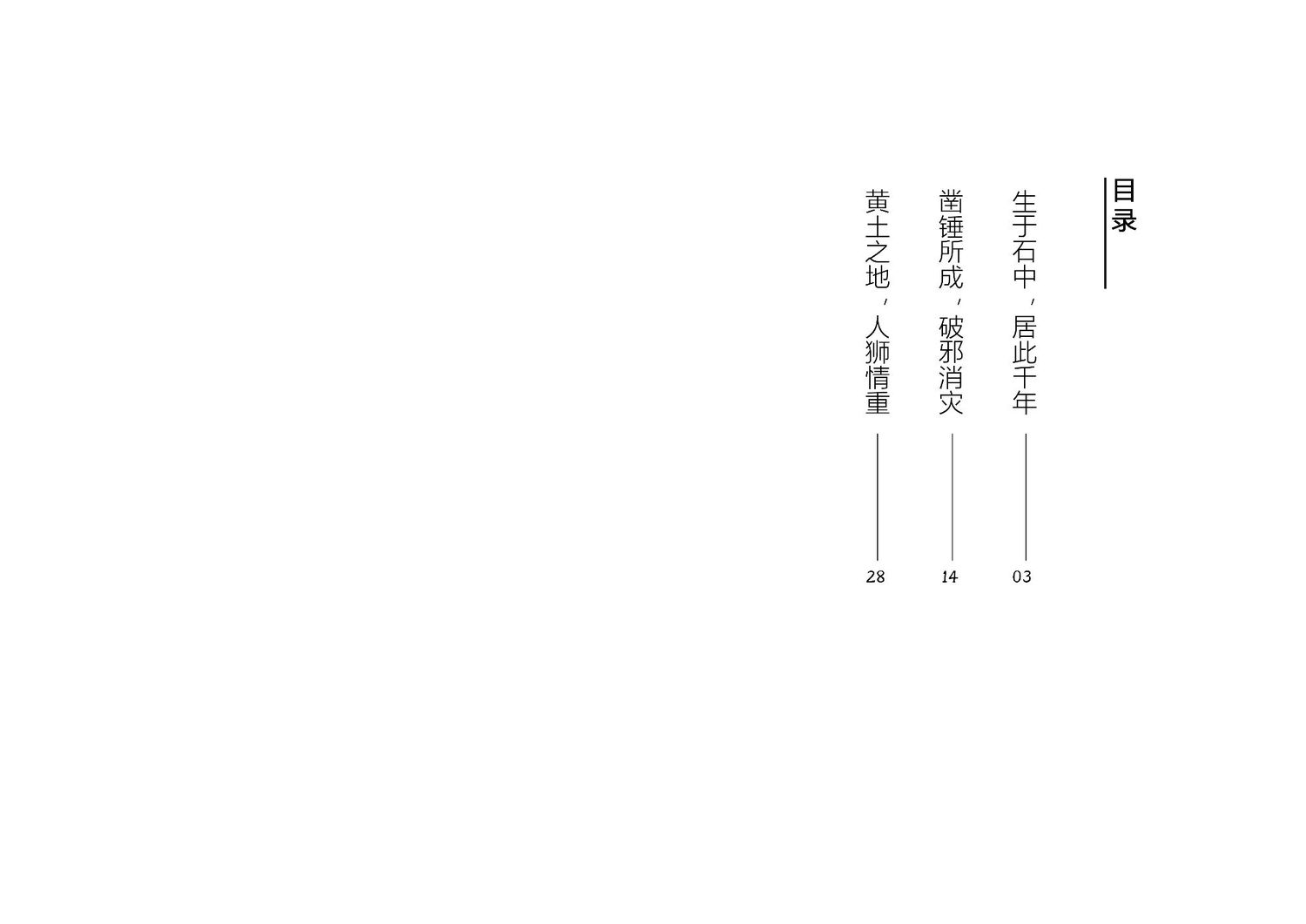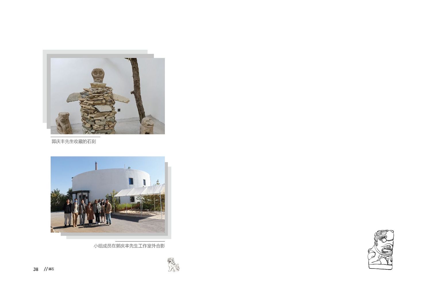 作品以石狮子为核心,通过查阅资料以及写生路上的所见所闻编写而成,全书共七章,前三章主要是陕北的地理生态与人文内容的简介,起到了一个承接下文的作用。而第四到第七章,则介绍了陕北石狮子的历史,种类,文化和现状。文字部分总共为三本书,另一本书为写生影集,记录了写生路上的各种瞬间,四本书拼合起来即为完整作品。因篇幅限制,作品图中仅放入了书籍内容跨页形式的节选,并非完整作品。