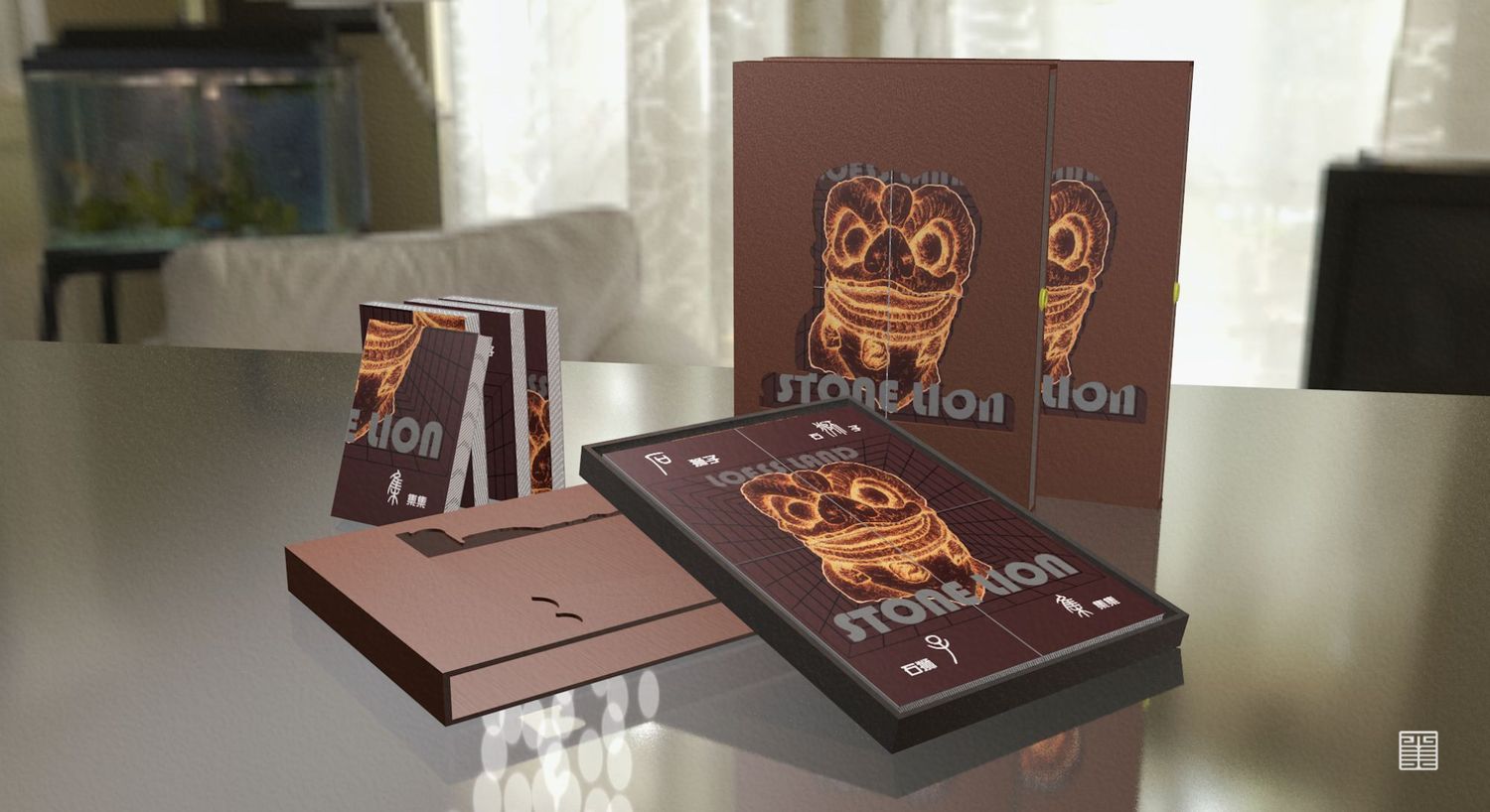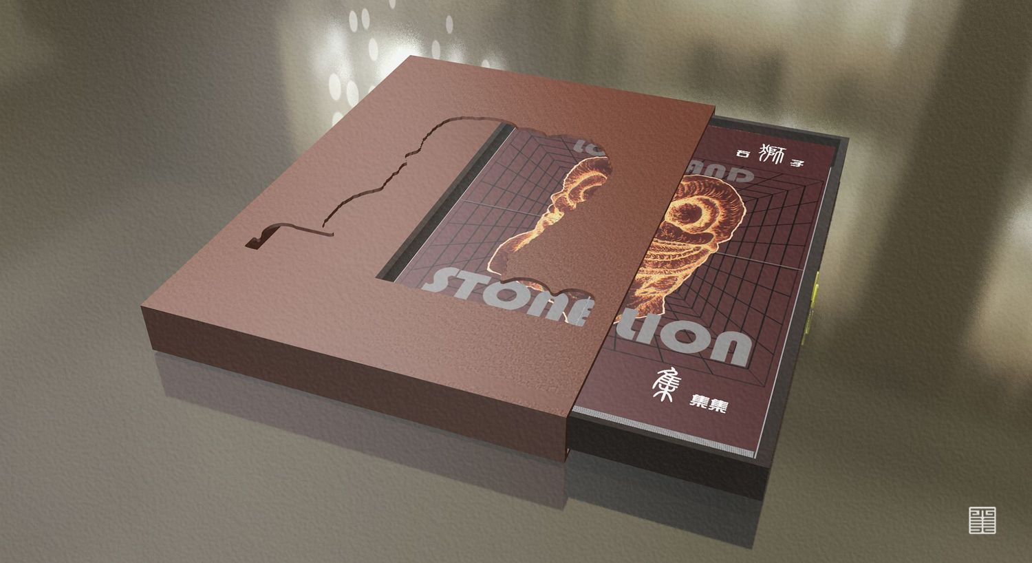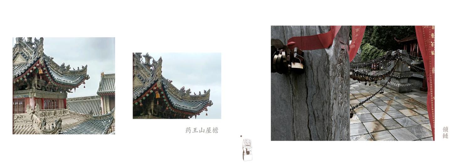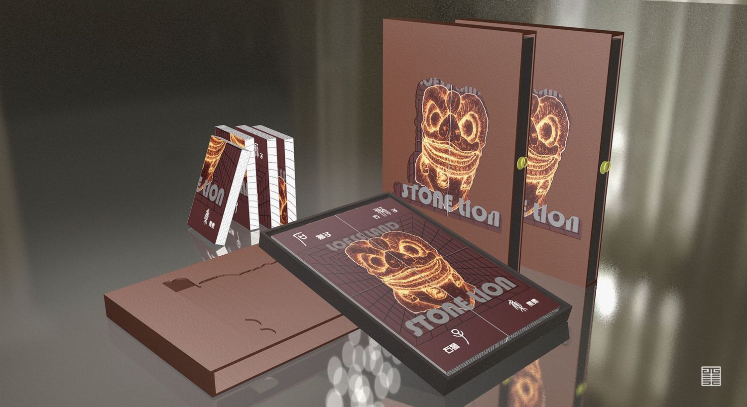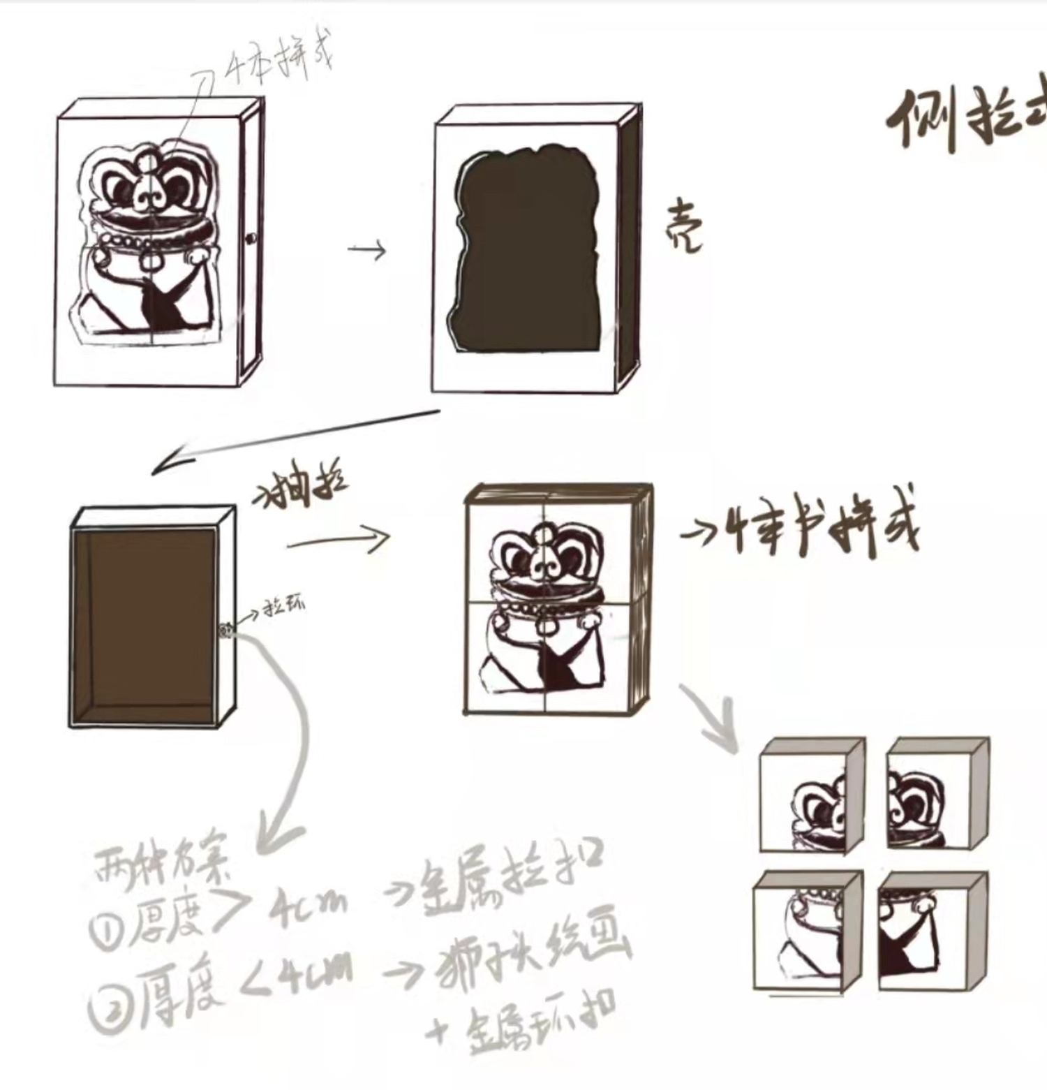 书籍采用拼凑盒装抽拉式的设计思路,我们制作了四本小书,当四本小书拼在一起,它们的封面就会构成一个石狮子的图案,将拼装好的四本小书装盒,推入盒中,镂空的的外壳中又能看到先前由四本小书所拼凑出的石狮子。抽拉式的含义指这次写生之旅是一次发现之旅,我们打开了陕北的“抽屉”,见识到了陕北的风土人情与民俗文化,写生结束后,我们又将自己一路上的所见所闻整合起来,再放入“抽屉”,这既是这本书的设计含义。
