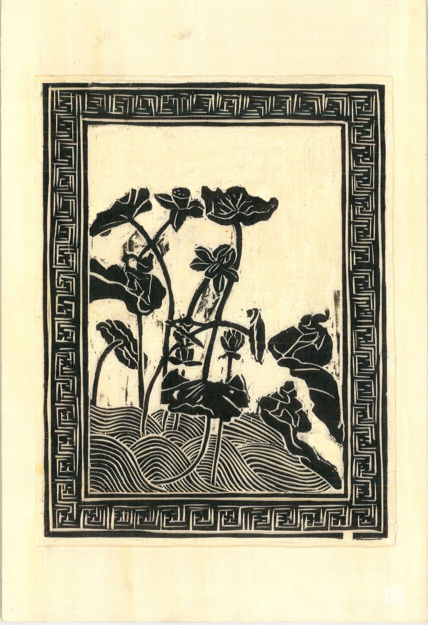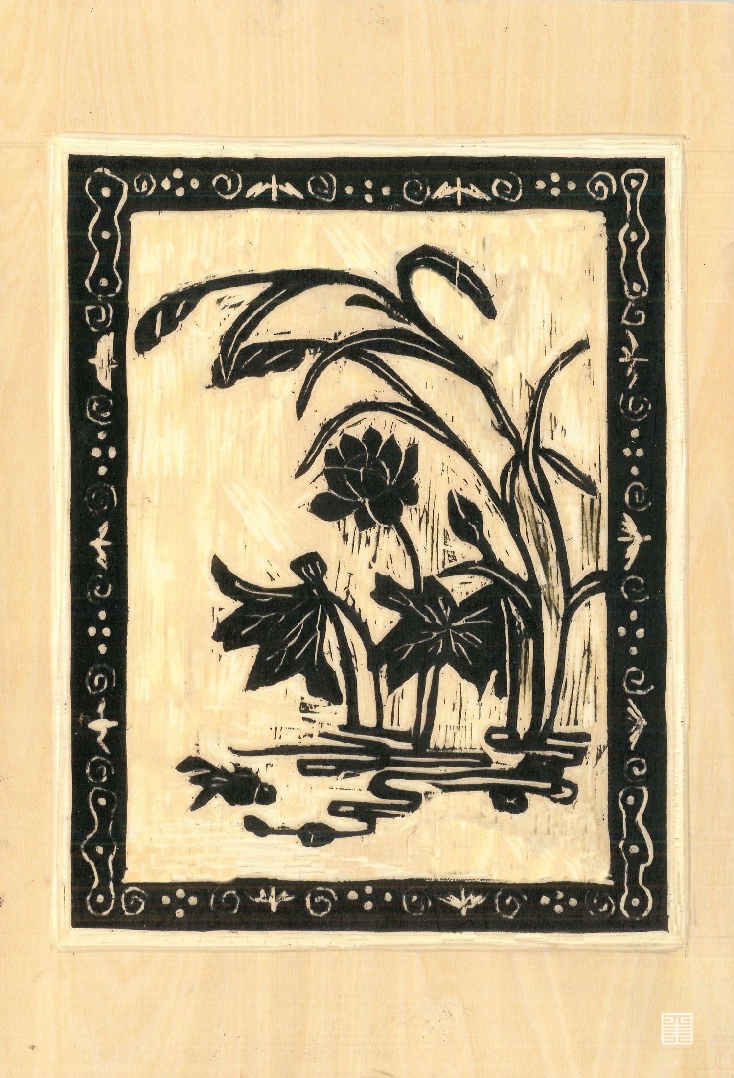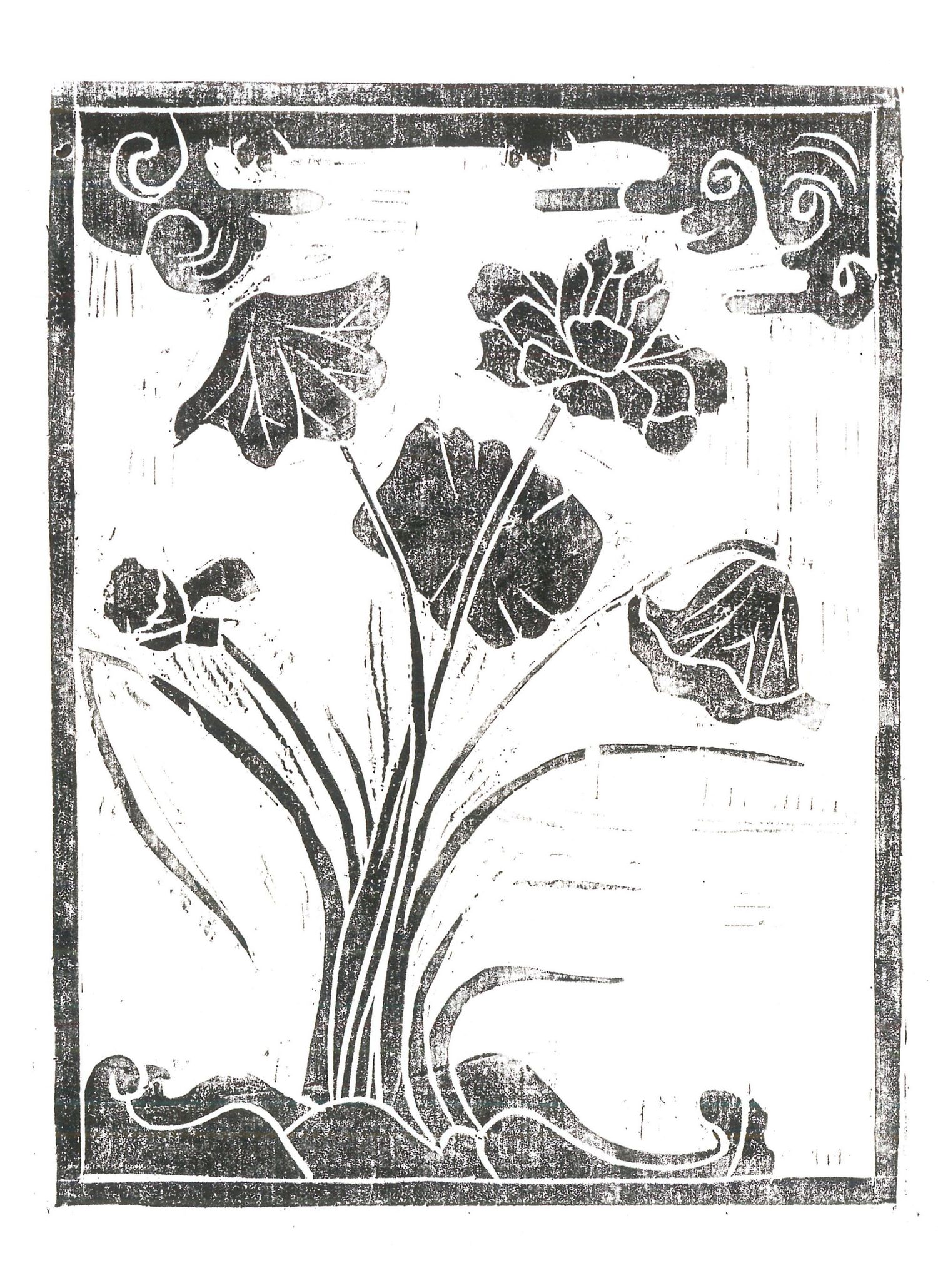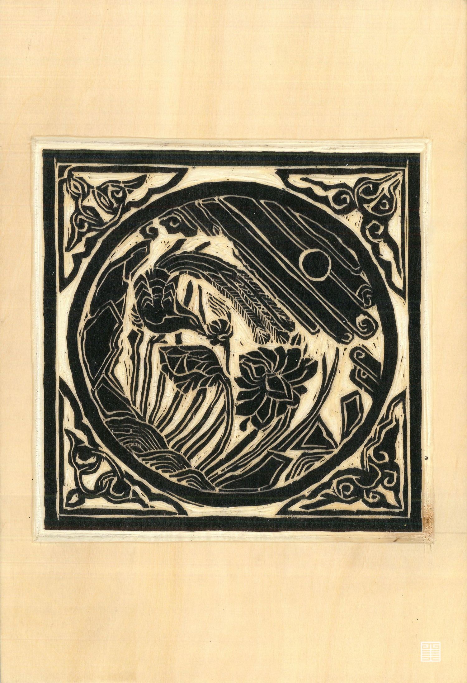 边框一周饰漩涡几何纹及蝠纹,寓意吉祥。图下水面泛涟漪,雕刻精致,水中长有三株莲花、水草及小浮萍,一朵莲花怒放,一朵含苞待放,一花已凋谢,枝头余有莲蓬,莲叶在微风中卷曲,水中游一只金鱼,圆腹长尾,整幅图布局巧妙,清逸脱俗。此图寓意家中物资丰富、生活富裕、连年有余。“莲”与“连”谐音,“鱼”与“余”谐音,称之为“连年有余”,又叫“年年有余”。“连年有余”是称颂祝贺之词,以示来年丰收,直到今天,这种习俗还常见于平常百姓之家。