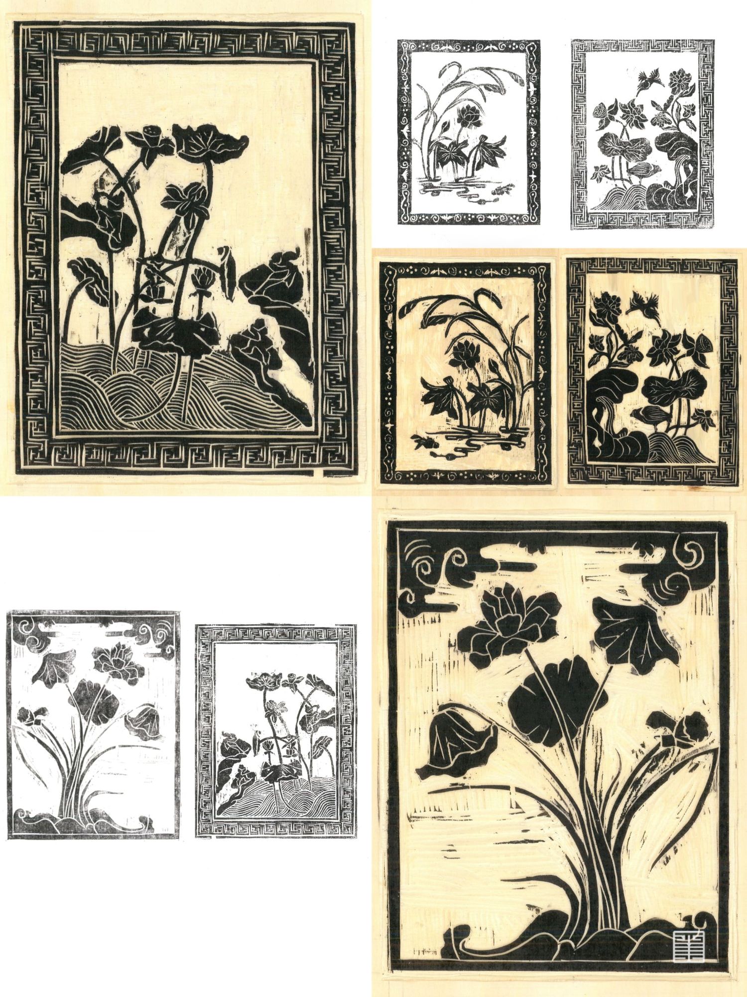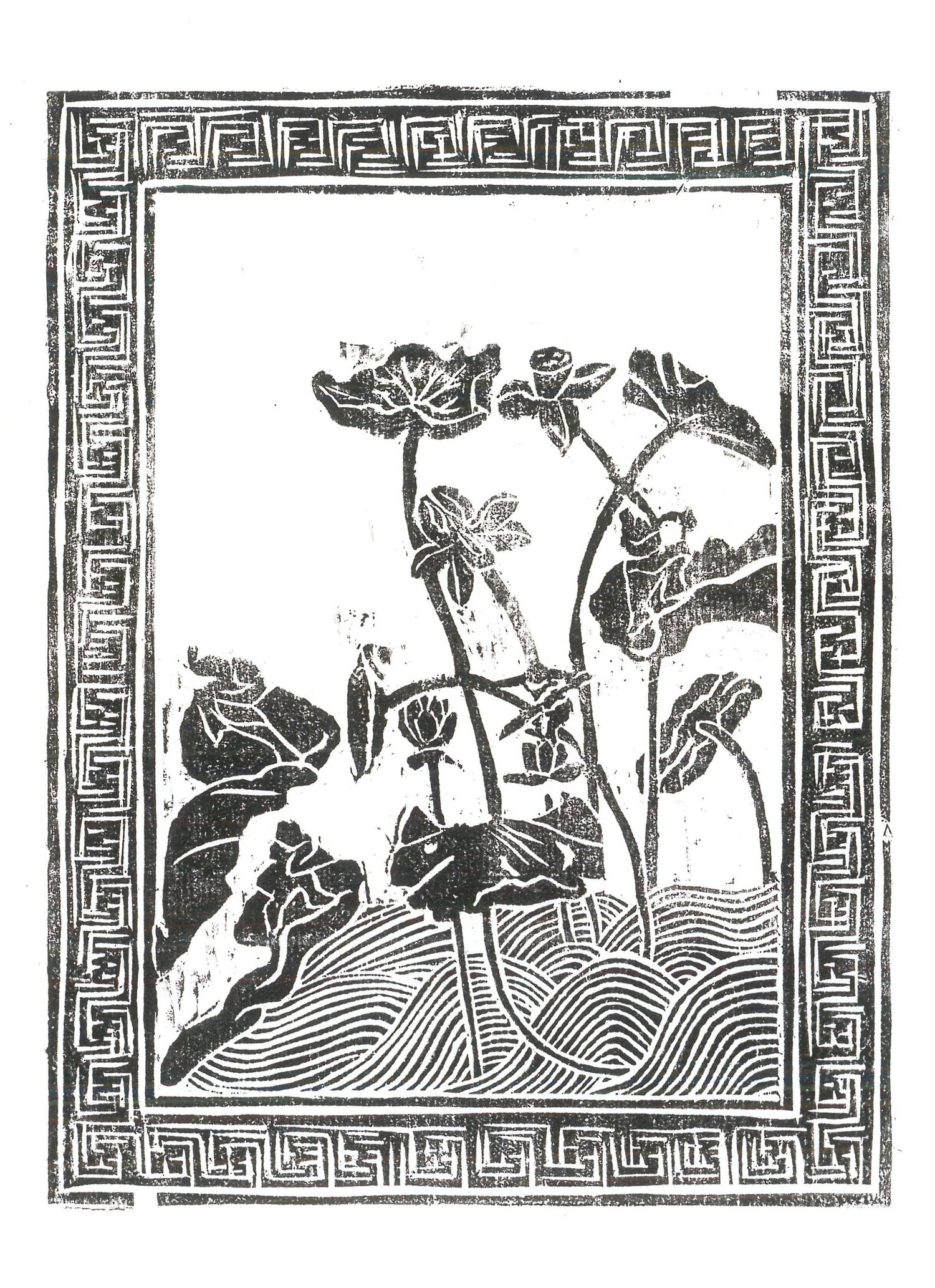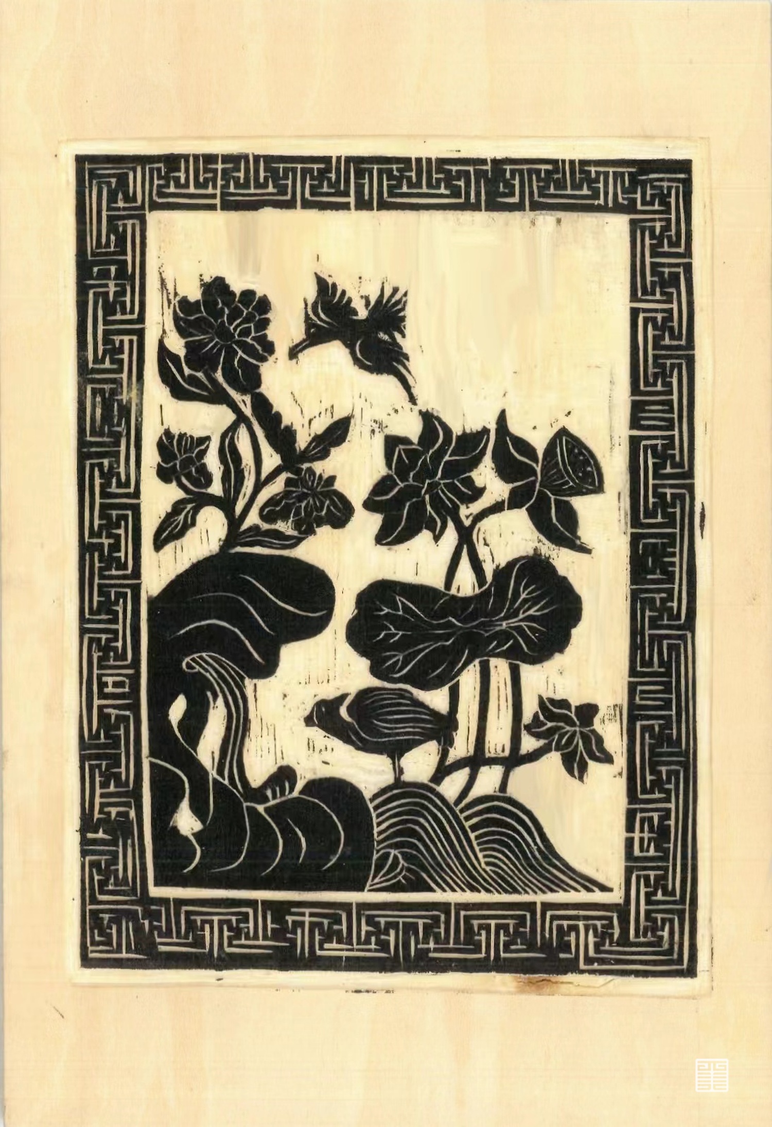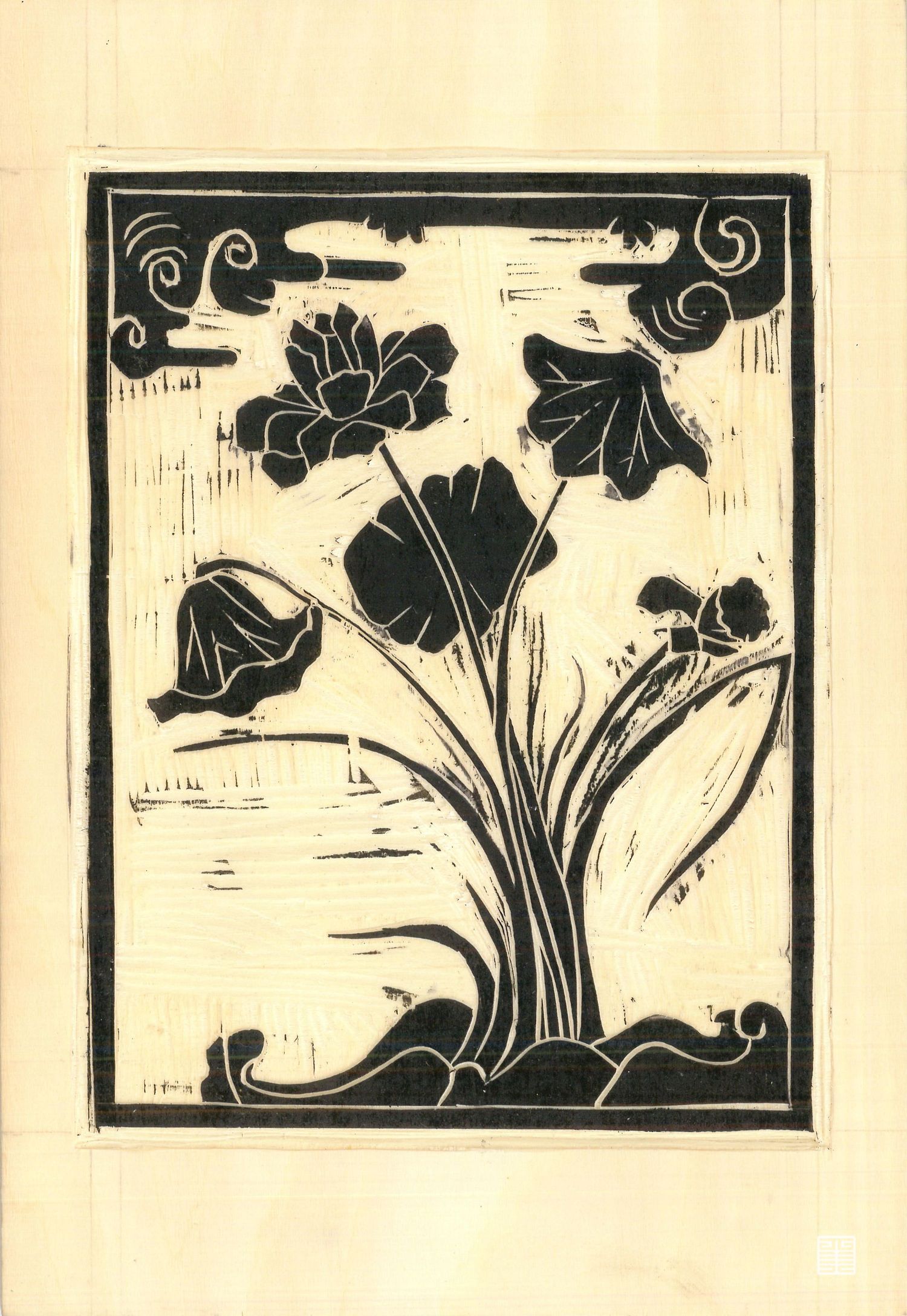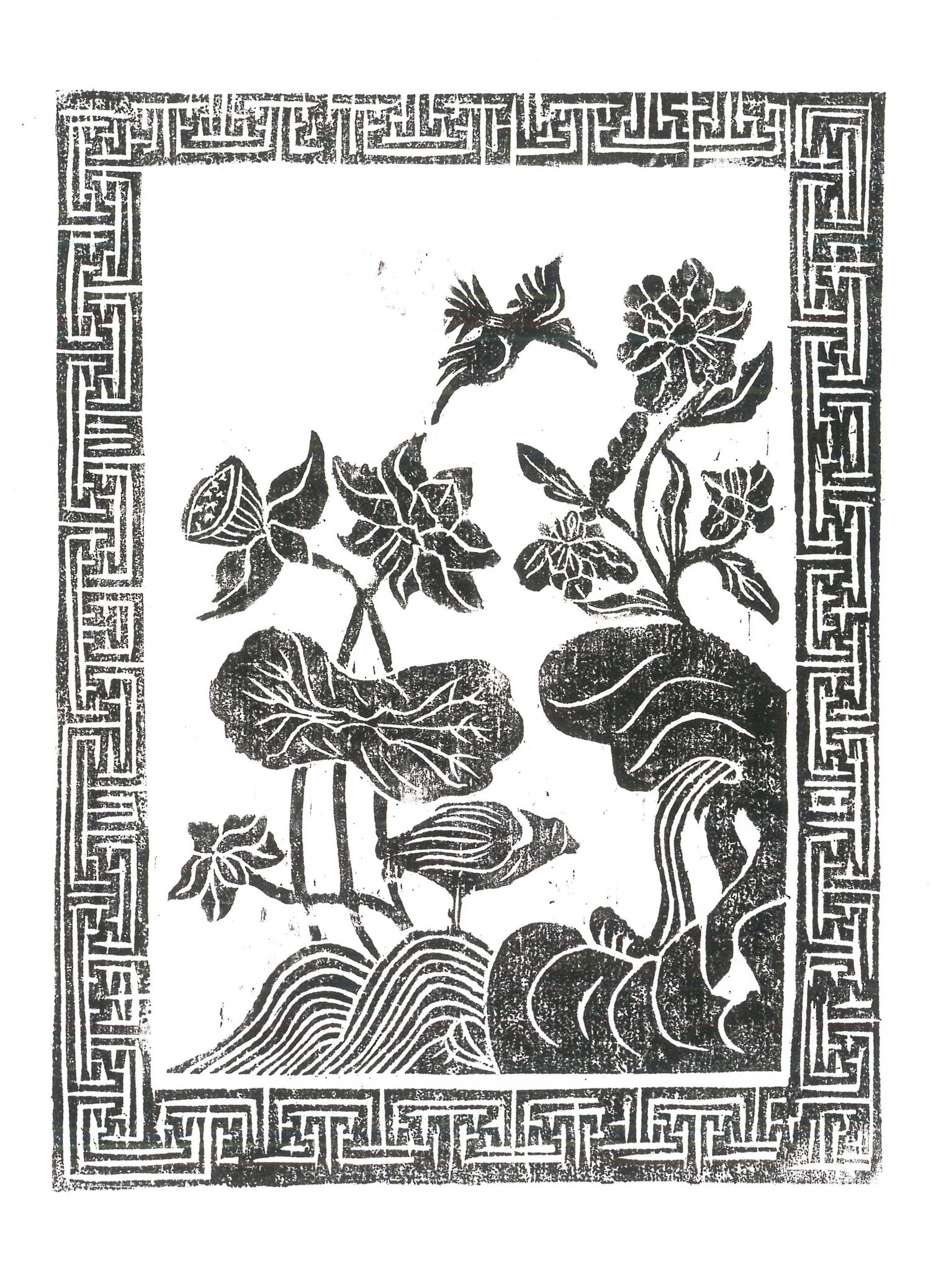 边框一周饰漩涡几何纹及蝠纹,寓意吉祥。图下水面泛涟漪,雕刻精致,水中长有三株莲花、水草及小浮萍,一朵莲花怒放,一朵含苞待放,一花已凋谢,枝头余有莲蓬,莲叶在微风中卷曲,水中游一只金鱼,圆腹长尾,整幅图布局巧妙,清逸脱俗。此图寓意家中物资丰富、生活富裕、连年有余。“莲”与“连”谐音,“鱼”与“余”谐音,称之为“连年有余”,又叫“年年有余”。“连年有余”是称颂祝贺之词,以示来年丰收,直到今天,这种习俗还常见于平常百姓之家。