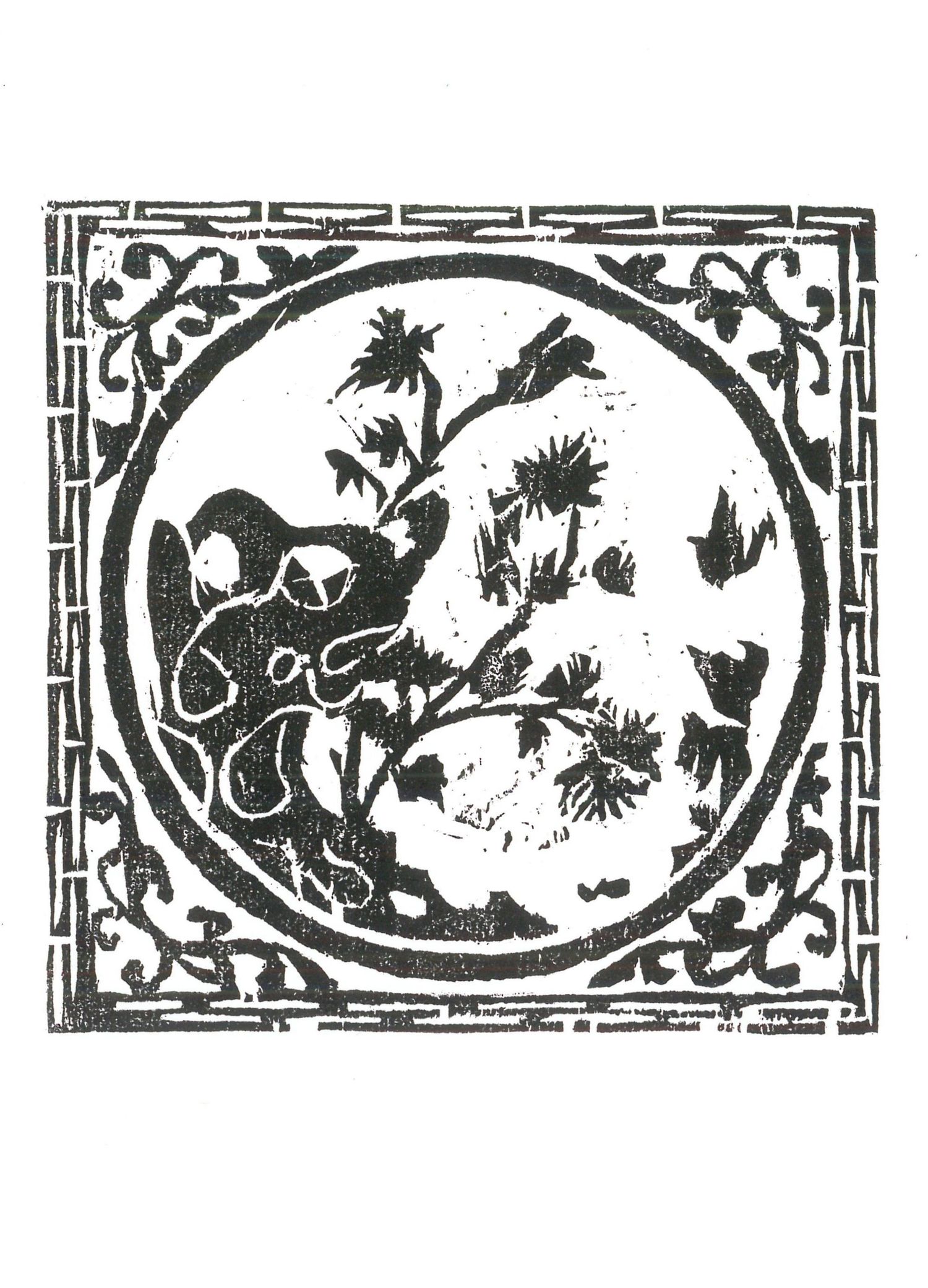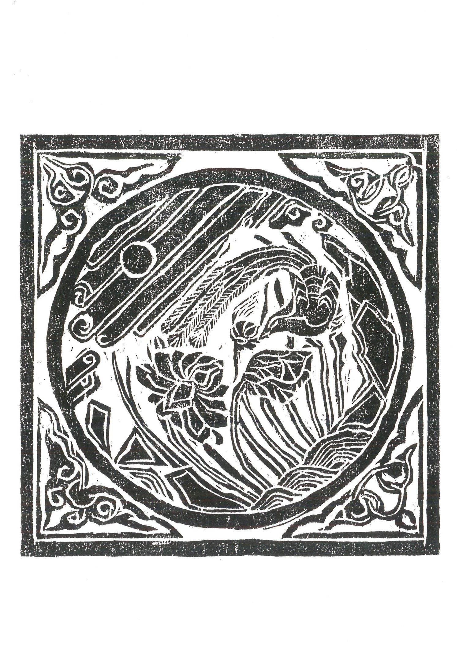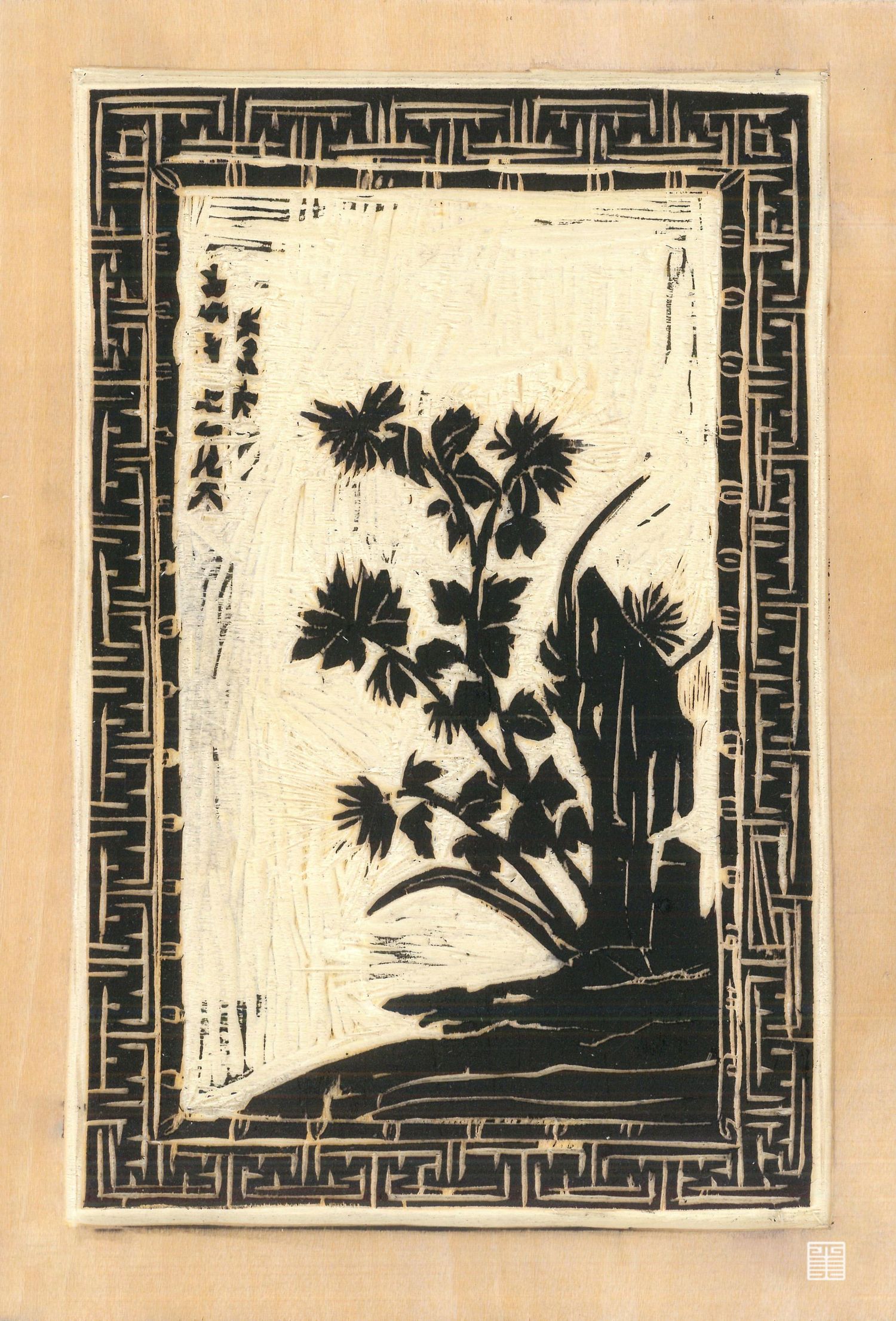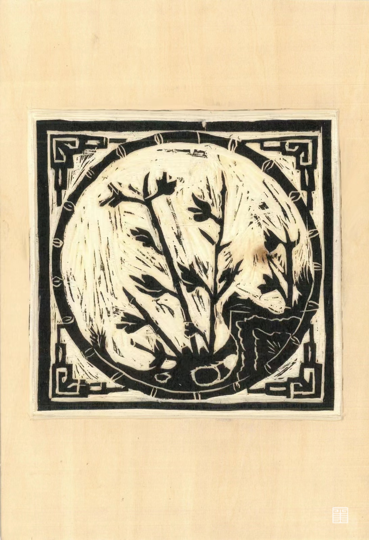 边框一周饰漩涡几何纹及蝠纹,寓意吉祥。图下水面泛涟漪,雕刻精致,水中长有三株莲花、水草及小浮萍,一朵莲花怒放,一朵含苞待放,一花已凋谢,枝头余有莲蓬,莲叶在微风中卷曲,水中游一只金鱼,圆腹长尾,整幅图布局巧妙,清逸脱俗。此图寓意家中物资丰富、生活富裕、连年有余。“莲”与“连”谐音,“鱼”与“余”谐音,称之为“连年有余”,又叫“年年有余”。“连年有余”是称颂祝贺之词,以示来年丰收,直到今天,这种习俗还常见于平常百姓之家。