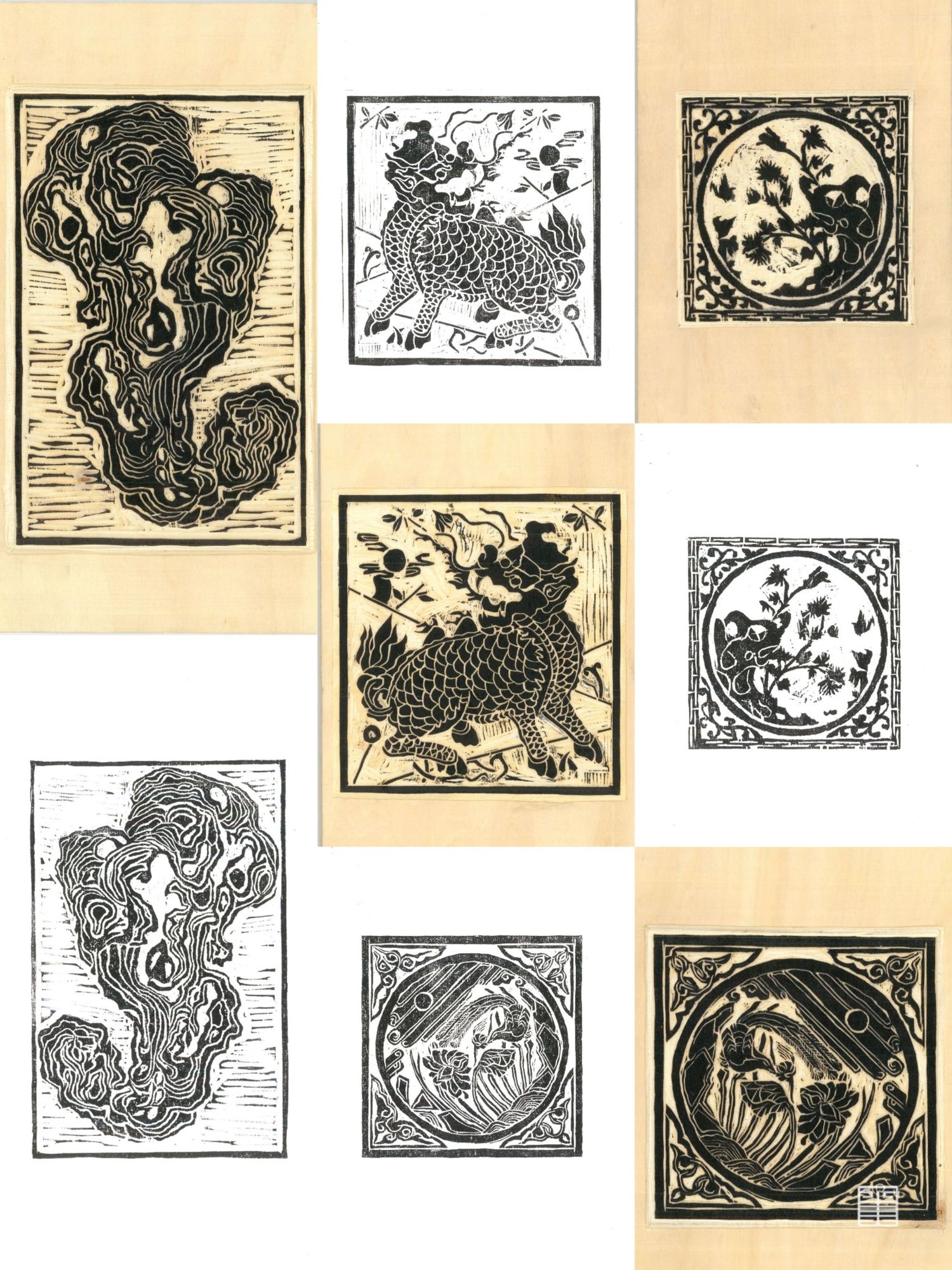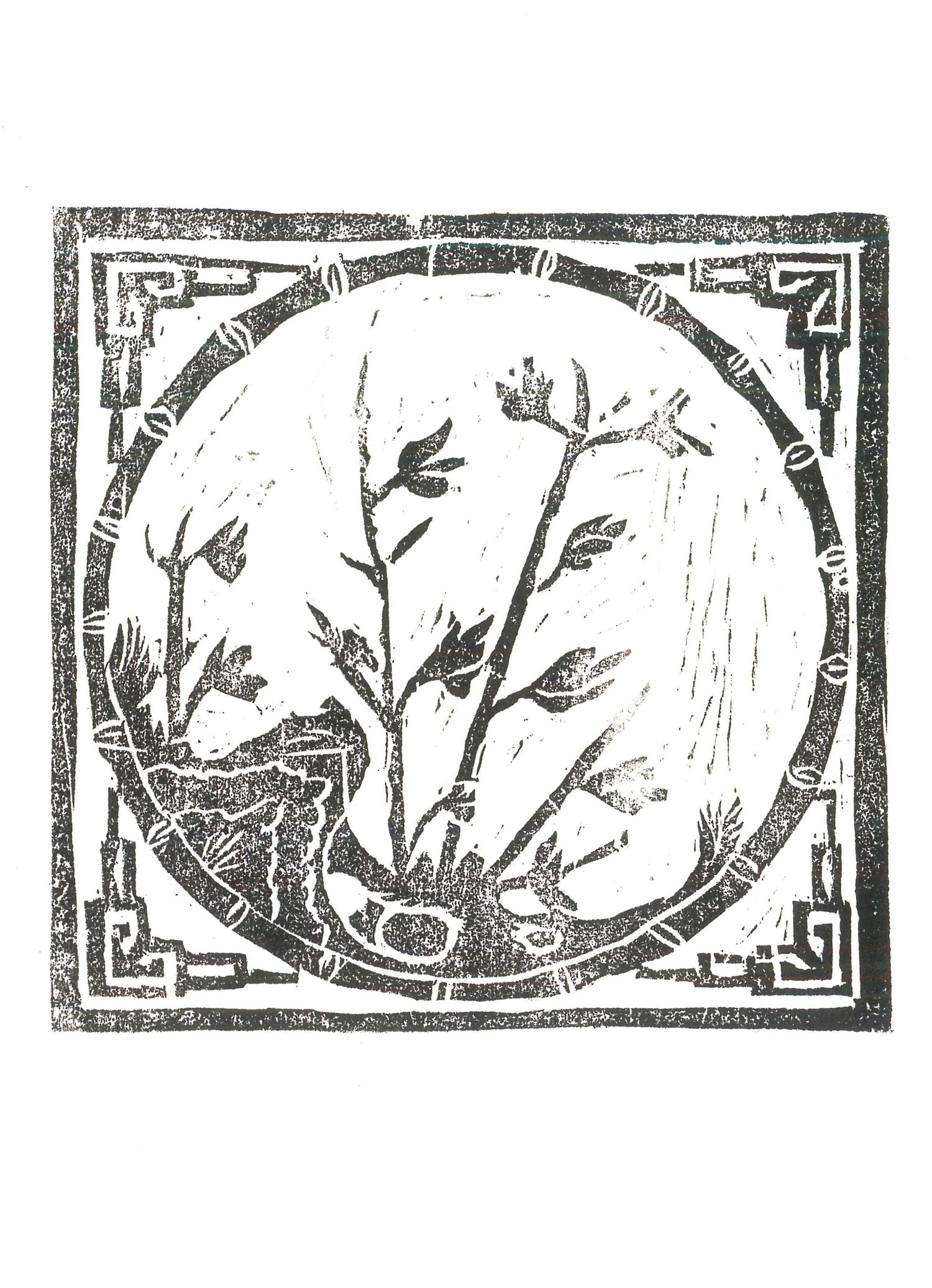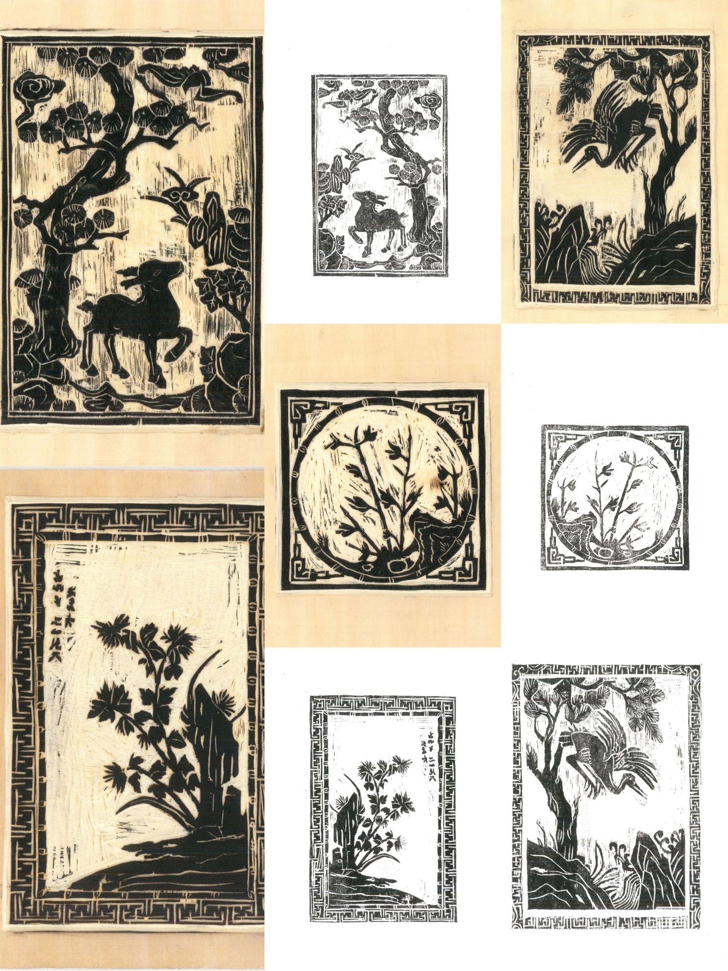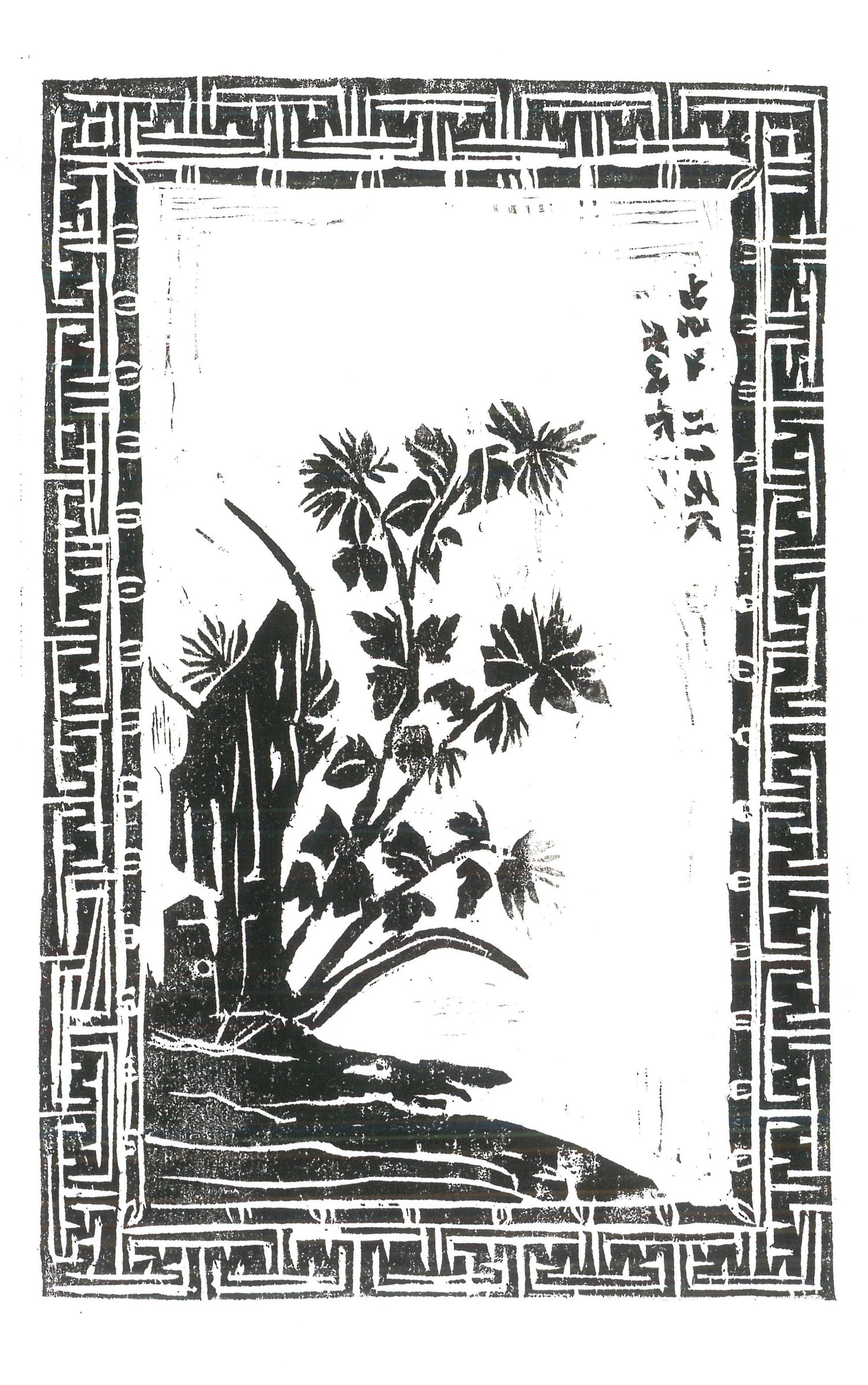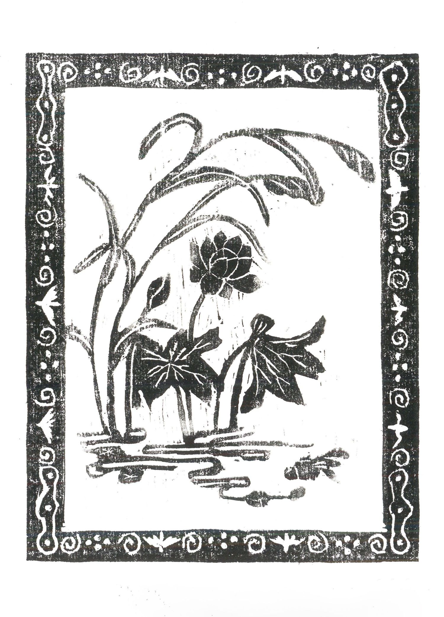 边框一周饰漩涡几何纹及蝠纹,寓意吉祥。图下水面泛涟漪,雕刻精致,水中长有三株莲花、水草及小浮萍,一朵莲花怒放,一朵含苞待放,一花已凋谢,枝头余有莲蓬,莲叶在微风中卷曲,水中游一只金鱼,圆腹长尾,整幅图布局巧妙,清逸脱俗。此图寓意家中物资丰富、生活富裕、连年有余。“莲”与“连”谐音,“鱼”与“余”谐音,称之为“连年有余”,又叫“年年有余”。“连年有余”是称颂祝贺之词,以示来年丰收,直到今天,这种习俗还常见于平常百姓之家。