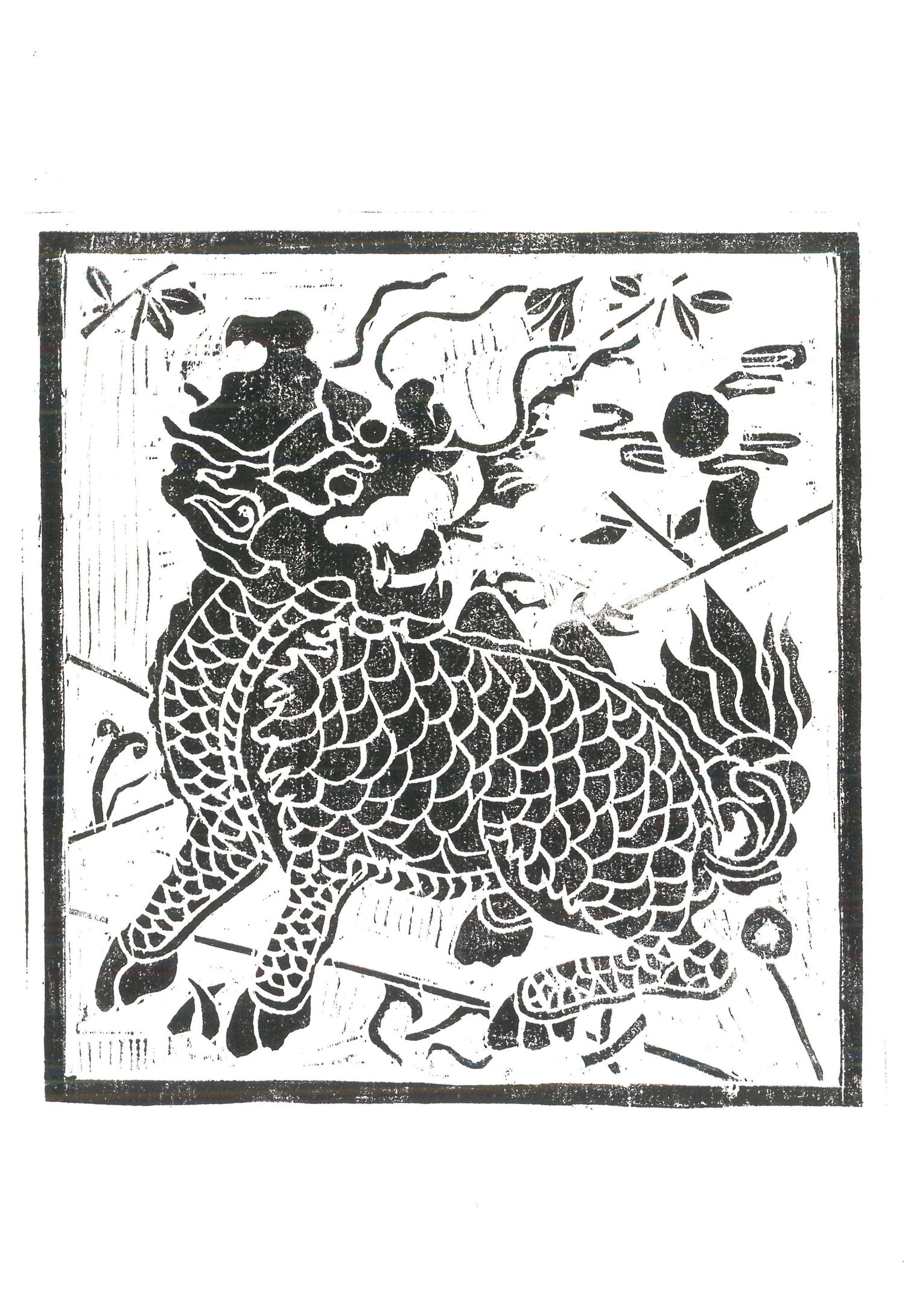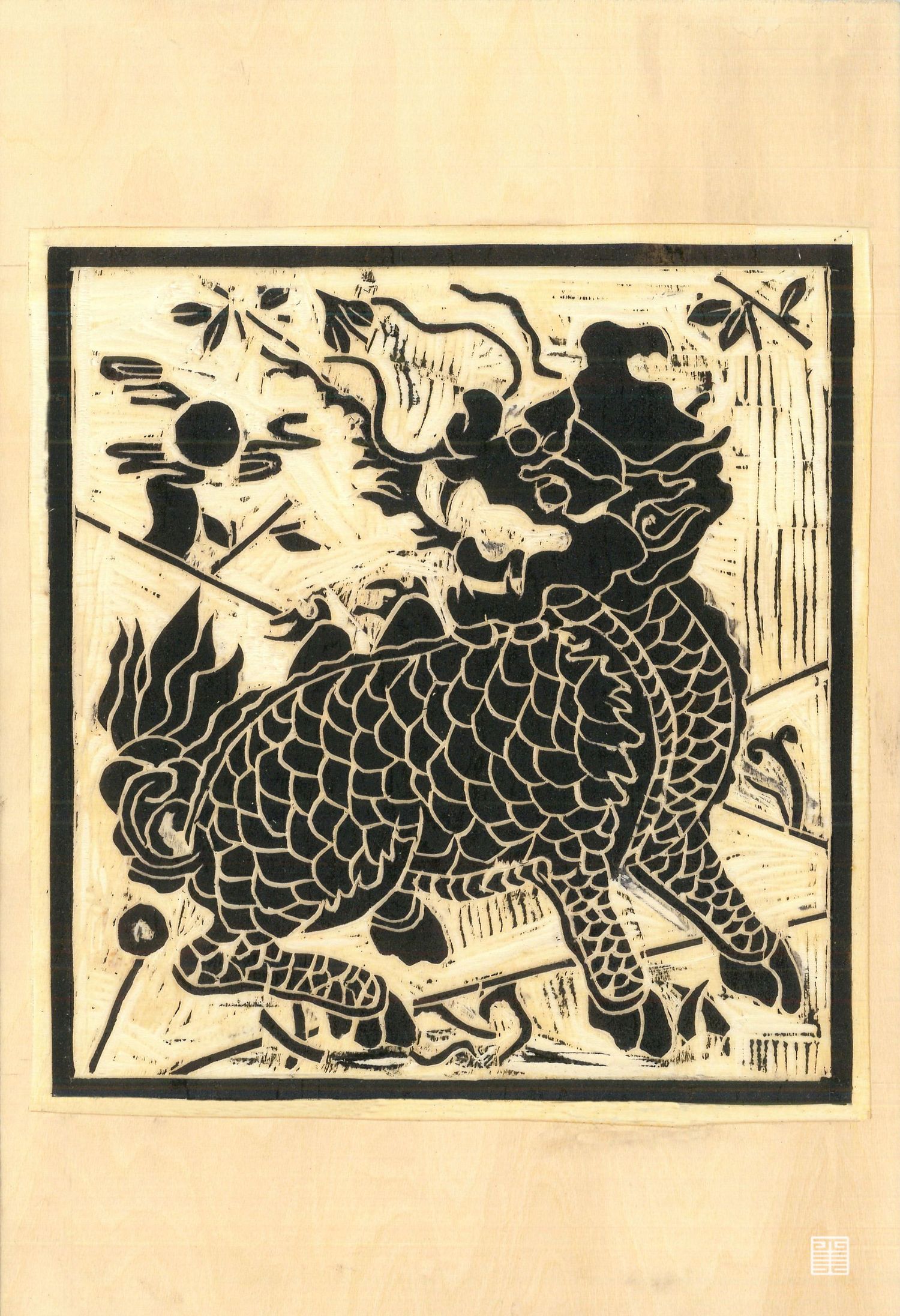 砖雕图案为两嵌套正方形,外层正方形雕饰连续不断菱形花朵纹,大小相连,以花形纹饰点缀其间。其内四角置卷叶纹样,中间正方形竹节纹,内雕蹲卧麒麟,巨目宽鼻,张口伸舌,鬃发上扬,翘尾,蹲卧,体有鳞纹,火焰纹由肩与后腿上飘,回首望空中的太阳,,即“回首望日”,上漂浮云朵,周围杂宝,四角各饰花。整体显示出麒麟的威武。麒麟威而不害,不践生灵,不折草木,沐浴在光辉之中,是人们心目中的祥瑞神兽,有镇宅辟邪的作用。