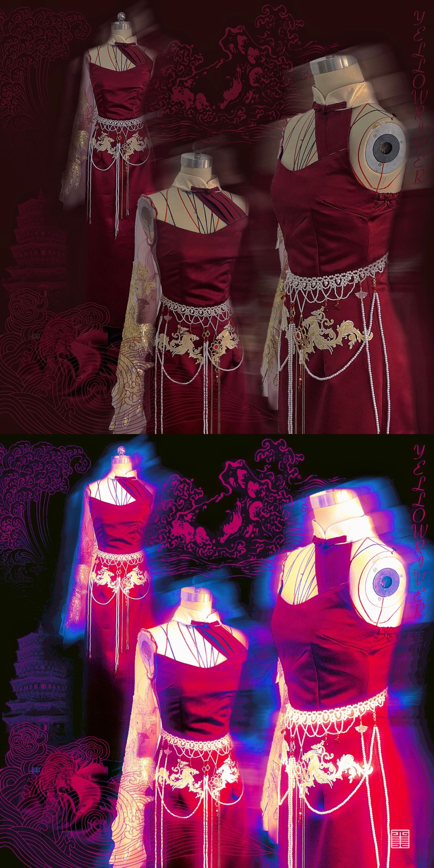 该作品的领子采用中式立领的版型,领扣是旗袍扣。立领与上胸片是采用褶皱的方式链接,整个衣身是枣红色布料,腰部有凤凰图案刺绣与纺制珍珠编制的腰饰。右袖上缝制了一个大型刺绣布贴为凤凰图案,后摆参考了古代嫁衣的超长圆形拖地后摆。