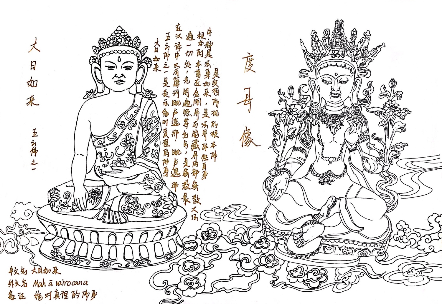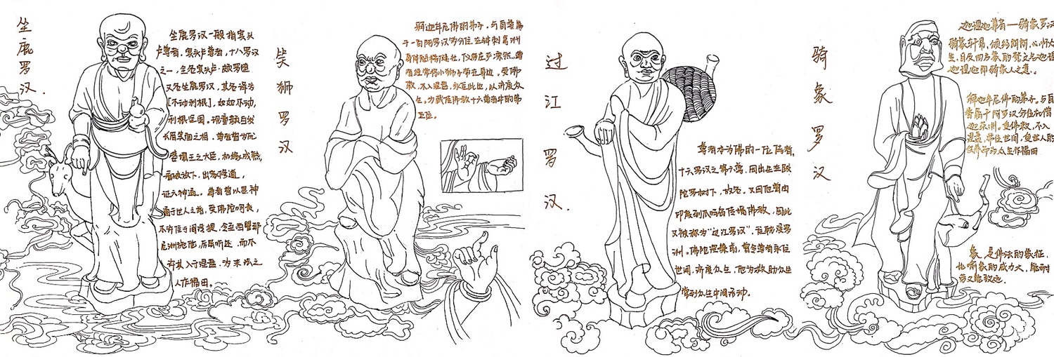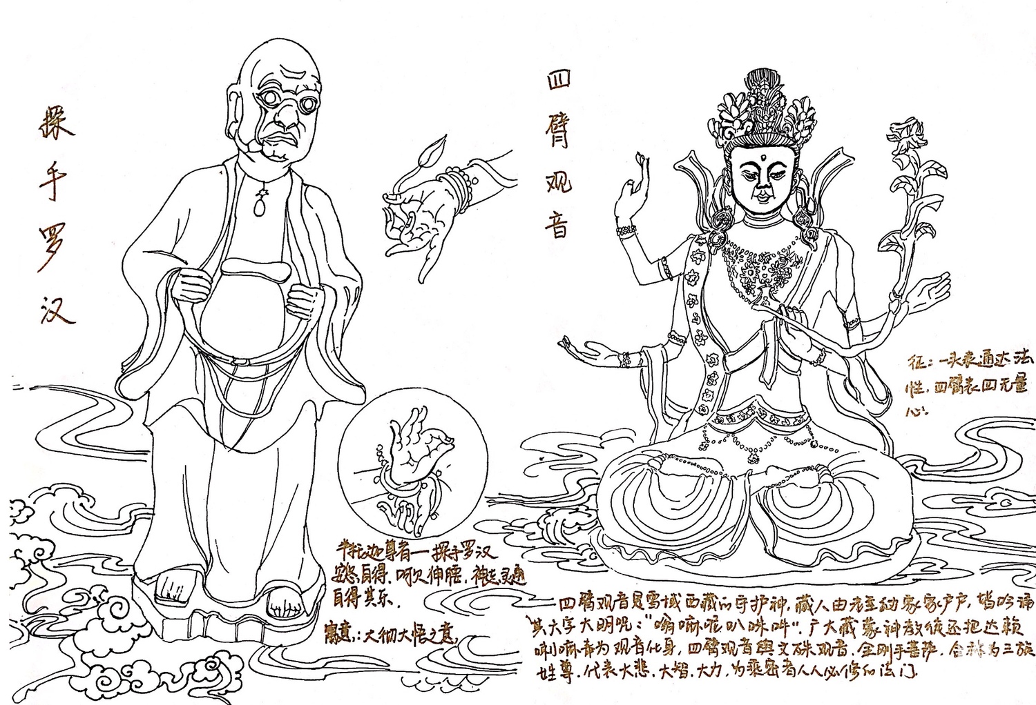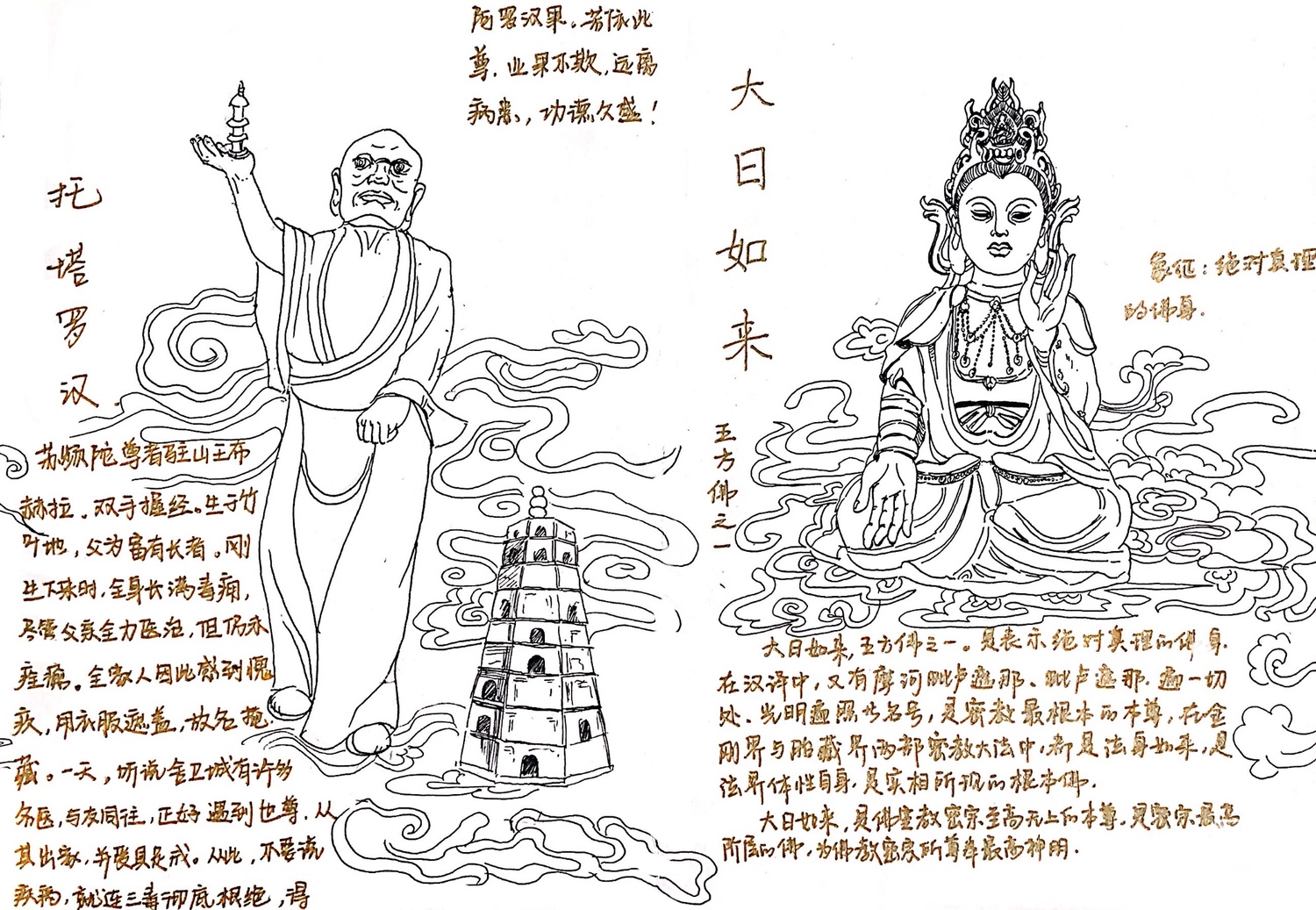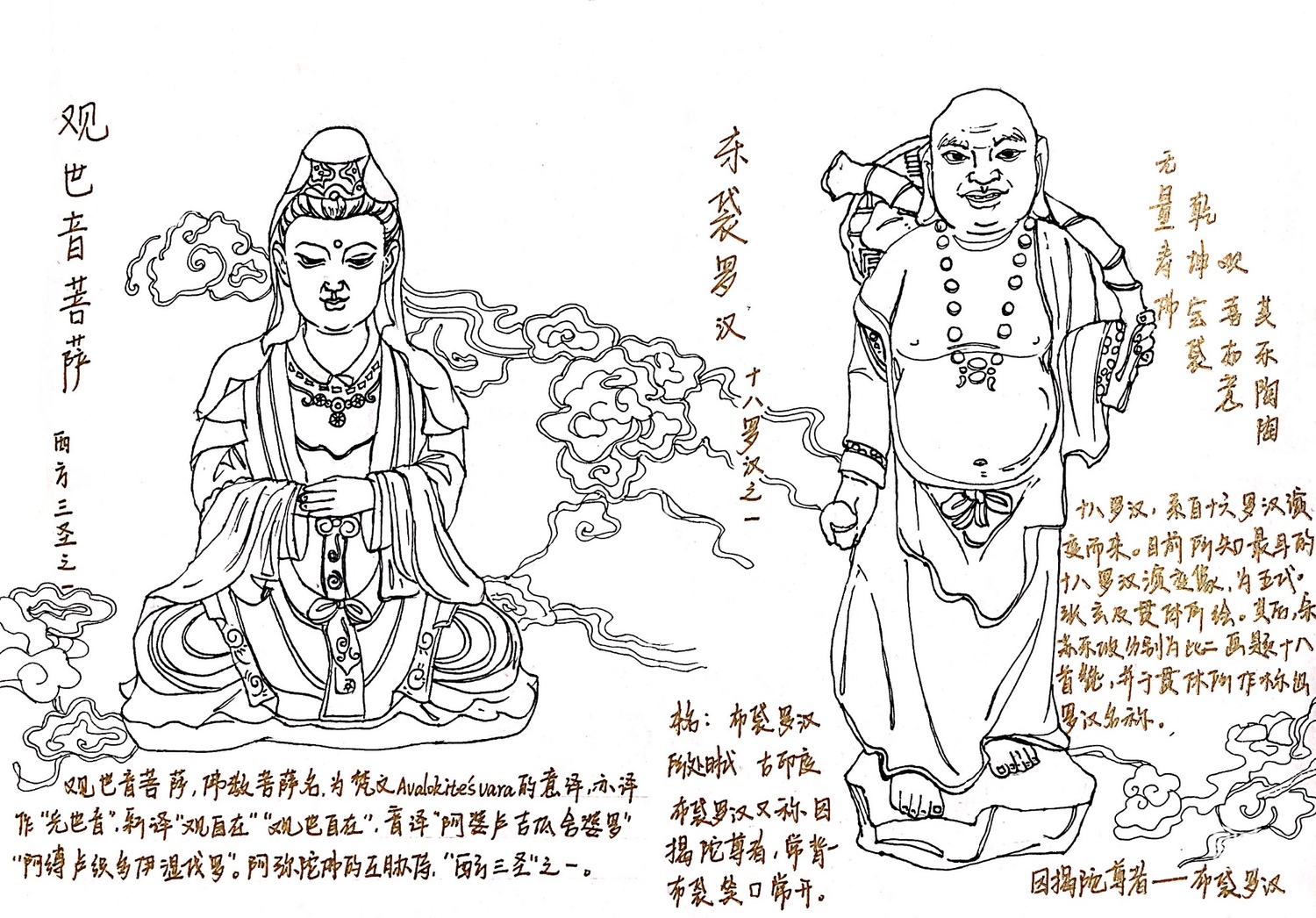 此佛像绘于关中民俗博物院佛像群,里面包含了大日如来、玄奘、释迦牟尼、观世音菩萨、度母像、布袋罗汉、托塔罗汉等等。经过此次写生旅程,对佛家的手印、坐骑、衣纹、面部神情特征有了初步了解。在描绘佛像的同时也让我们静下心来参悟人生的哲理。