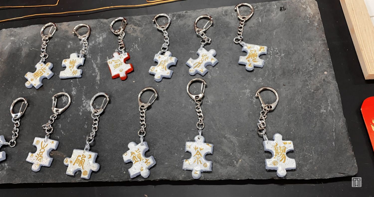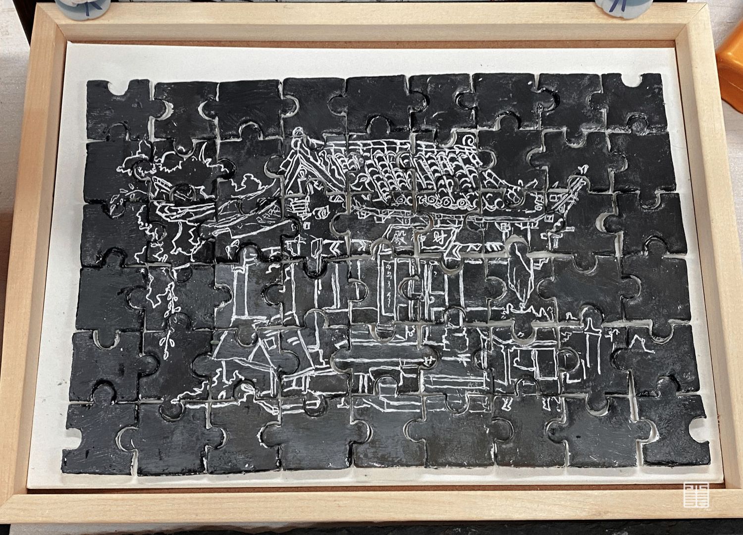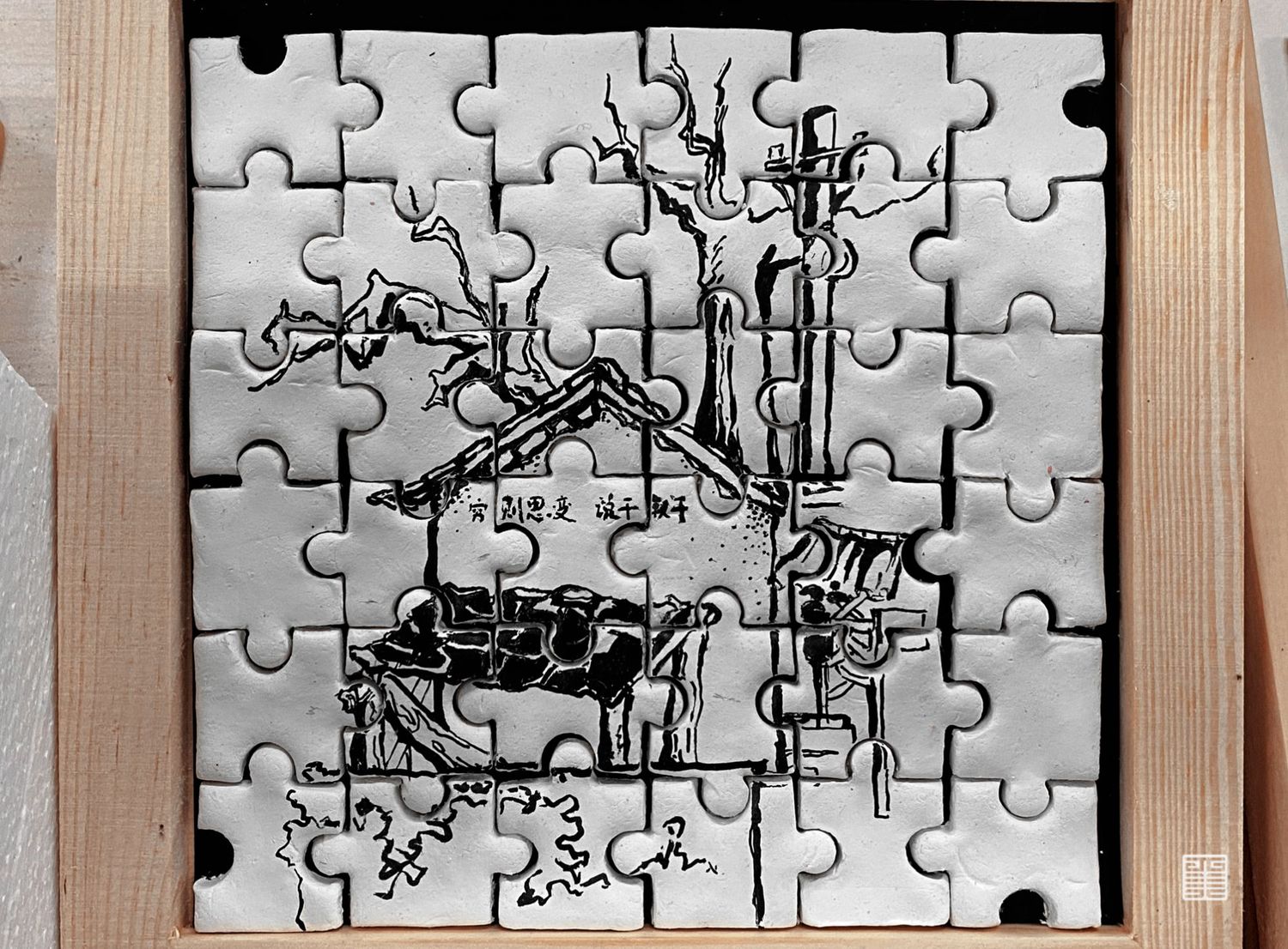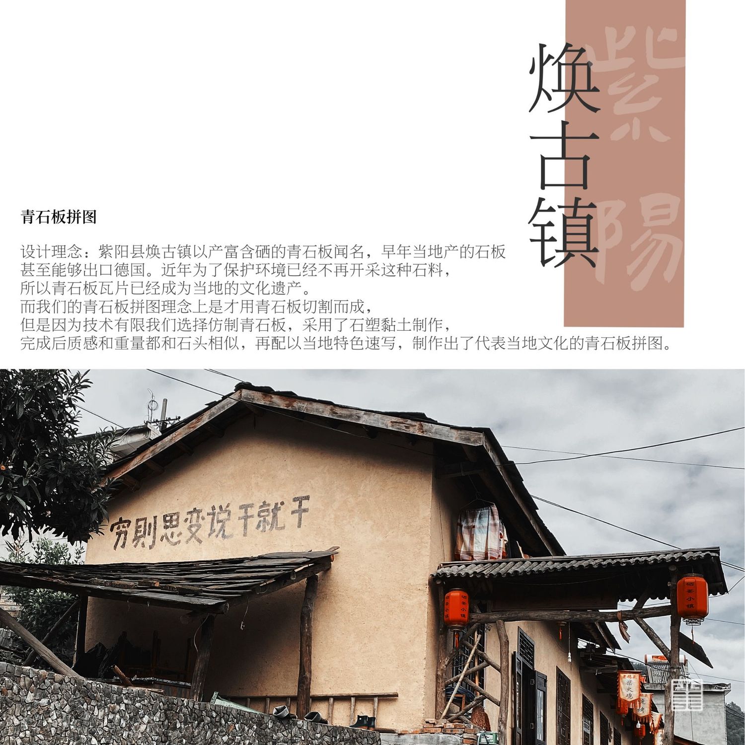 紫阳县焕古镇以产富含硒的青石板闻名,早年当地产的石板甚至能够出口德国。紫阳人利用板石创造生活已有几千年历史。据考证,早在先秦时期,紫阳人就用树木立柱横梁,用石板挡风盖房,用石头做桌、椅、凳等家用物件。近年为了保护环境已经不再开采这种石料,所以青石板瓦片已经成为当地的文化遗产。而我们的青石板拼图理念上是用青石板切割而成,但是因为时间短,技术有限,我们选择仿制青石板,采用了石塑黏土制作,完成后质感和重量都和石头相似,再配以当地特色速写,留下属于我们对于紫阳的记忆,制作出了代表当地文化的青石板拼图。让青石板拥有除去建筑物材料以外的价值。