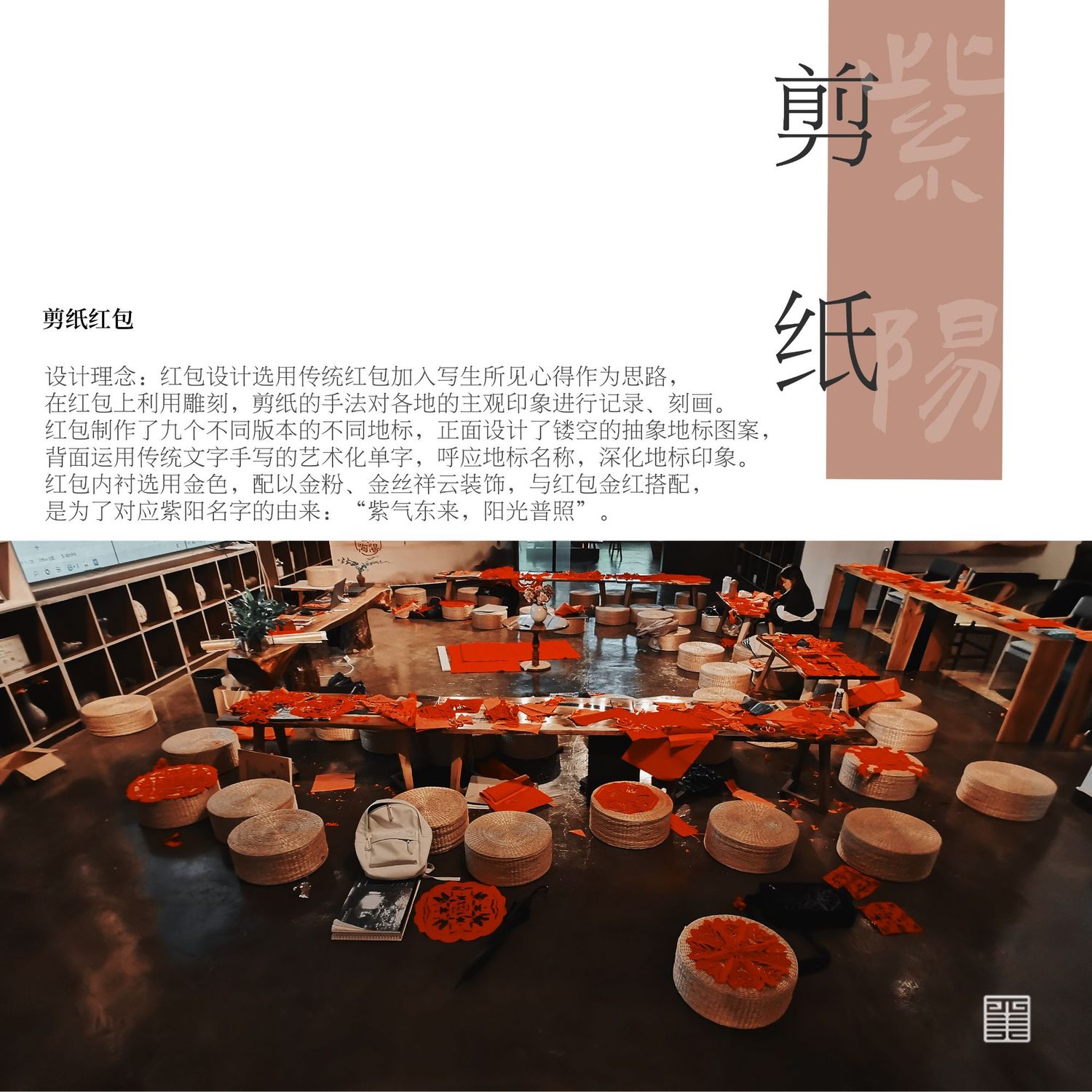 红包设计选用传统红包加入写生所见心得作为思路,记录下乡期间对于紫阳的回忆。在红包上利用雕刻,剪纸的手法对各地的主观印象进行记录、刻画。制作处九个不同版本的不同地标,展现紫阳当地独有的风情和文化。如:报恩塔,文笔山,焕古镇,向阳茶厂,半亩茶园,瓦房店等等。正面设计了镂空的抽象地标图案,背面运用传统文字手写的艺术化单字,呼应地标名称,深化地标印象,以别样的方式凸显紫阳映像。在数字媒体盛行的21世纪,红包已不是当年每逢过年必备的重要物件。现如今的数字红包,手机转账依旧能实现过年给红包的目的,微信抢红包也能给节日中的人们带来欢乐,但是却缺少了小时候的年味。没有了每逢过年家人们对于红包的推搡,过年时亲戚之间聊着家长里短的喧闹。年味不应只是冰冷的数字信息,此次的剪纸红包的设计不仅仅展现这紫阳的文化,也是对于过年印象的一种回忆。