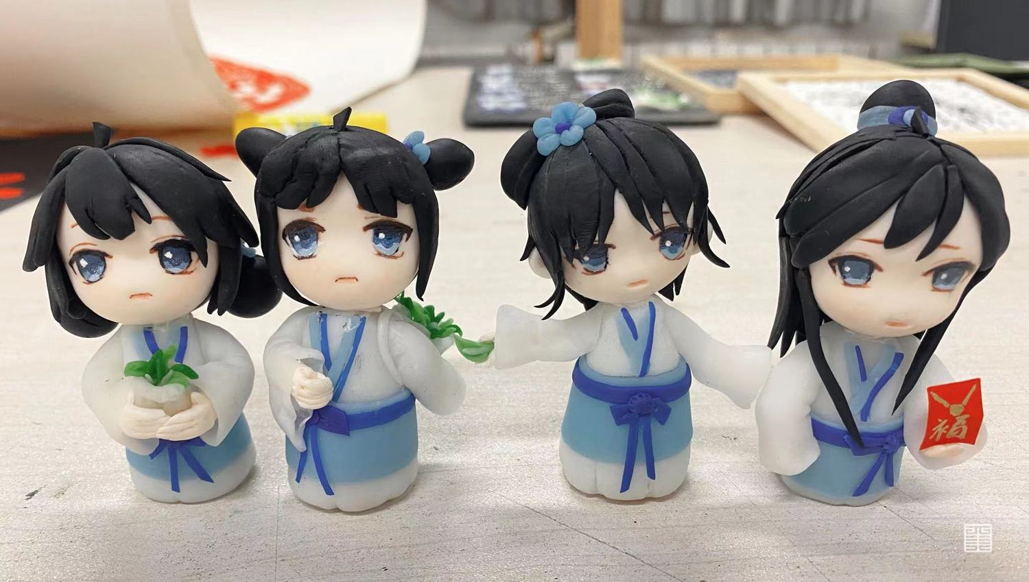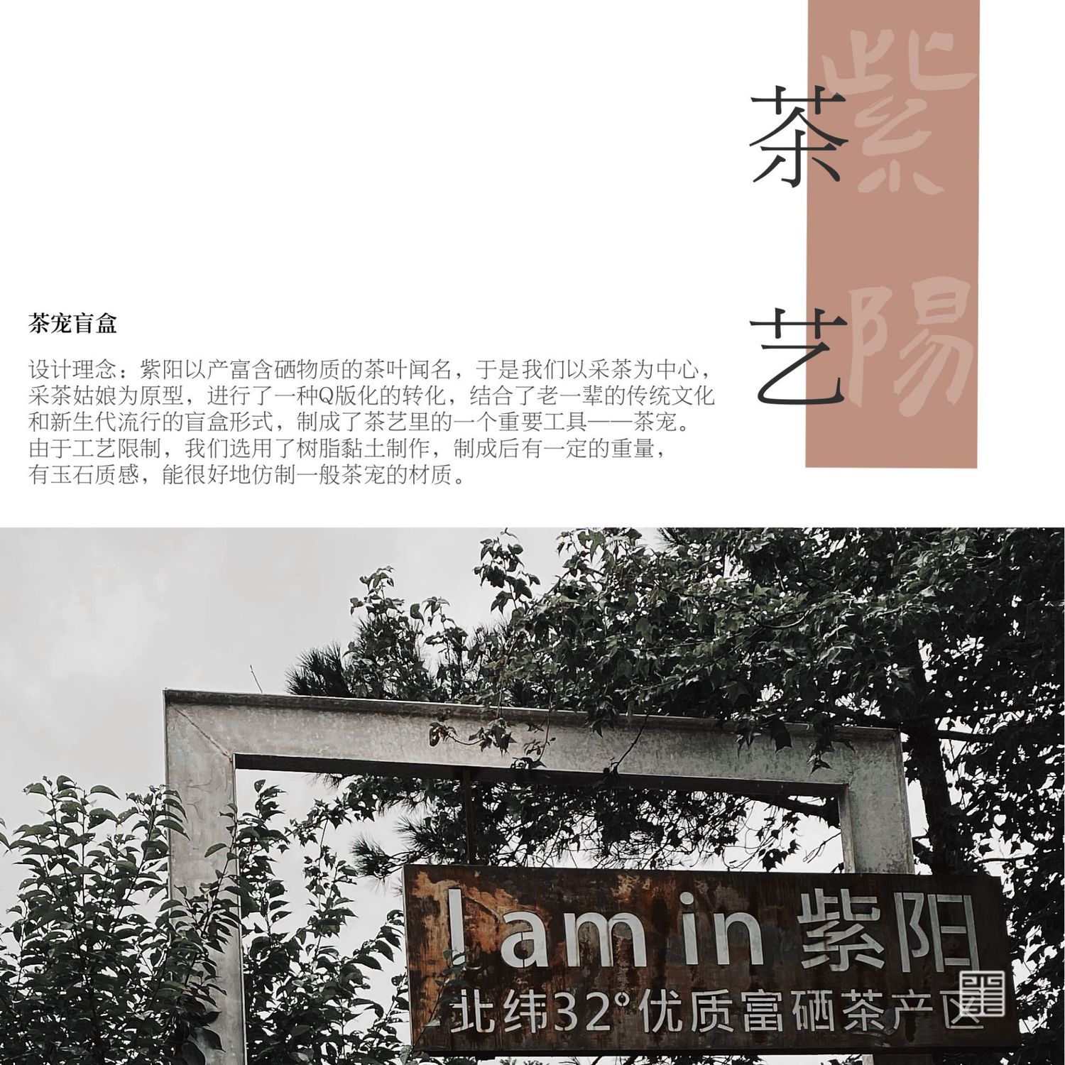 紫阳县所在的安康市产茶历史悠久,至少有3000多年的历史。富硒地区让微量元素硒被茶树吸收转变为有机硒蛋白,具有特种保健功效。到2012年,紫阳县全县茶叶栽植面积逾17万亩,年产茶总量达到3800吨,而紫阳茶叶产量的不断增值,离不开当地茶农的辛勤努力。于是我们以采茶为中心,采茶姑娘为原型,进行Q版的转化,顺应了当代年轻人对于盲盒喜爱的热潮, 结合老一辈的茶文化,将传统文化和新生代潮流进行融合,制成饮茶品茗时把玩之物——茶宠。材料的选择上,我们选取树脂黏土作为制作的主要材料,制成后拥有一定的质量和玉石质感,手感也很是不错,是不错的仿制茶宠的材料。
