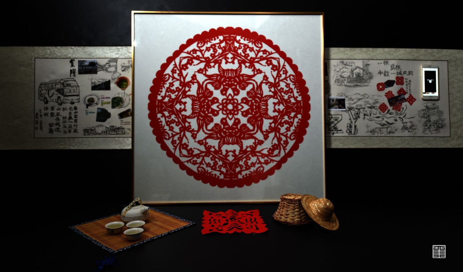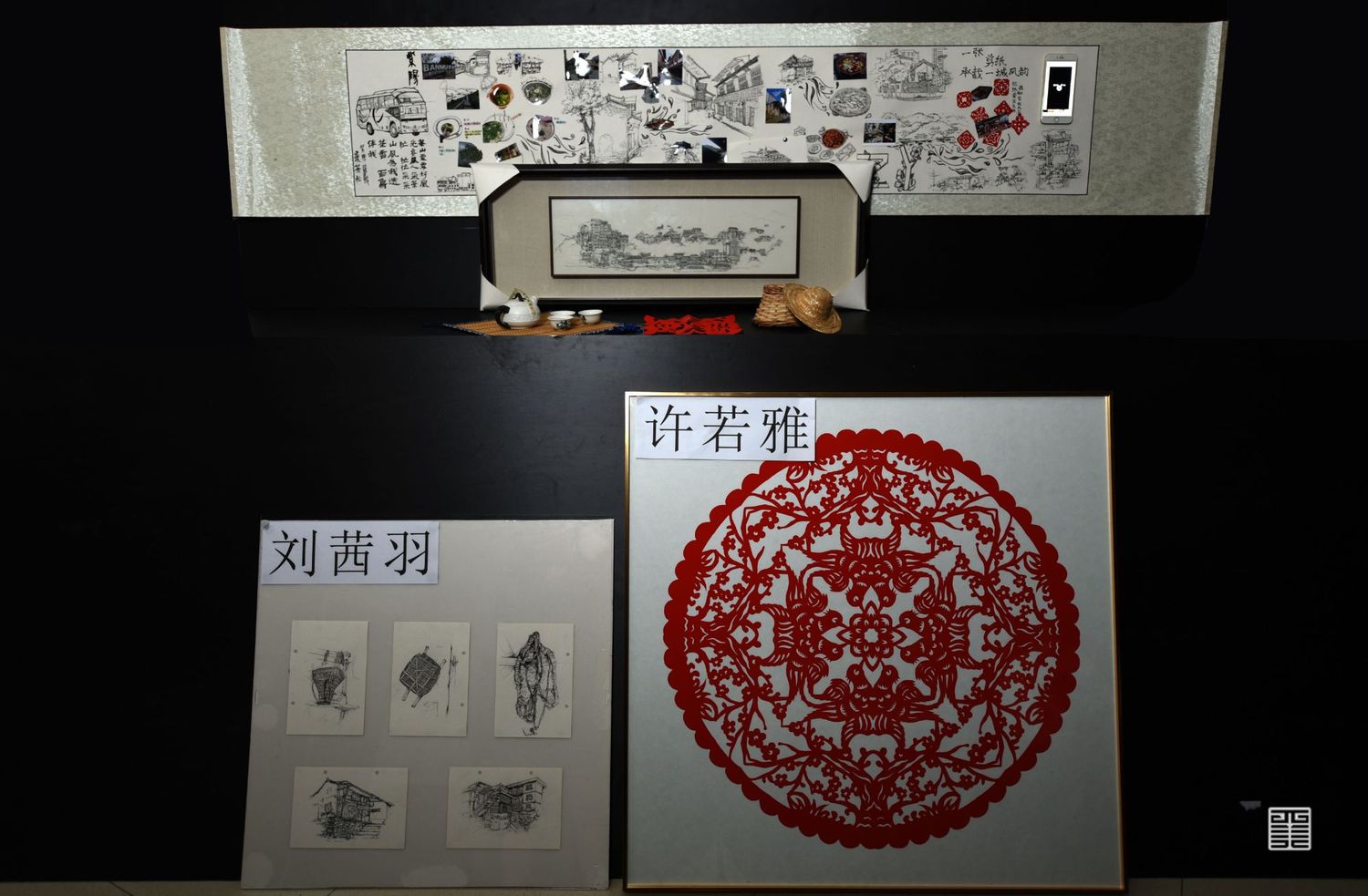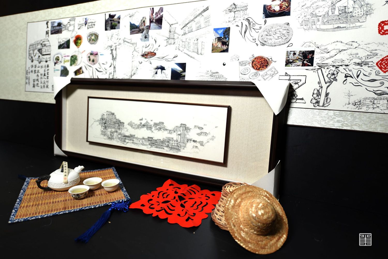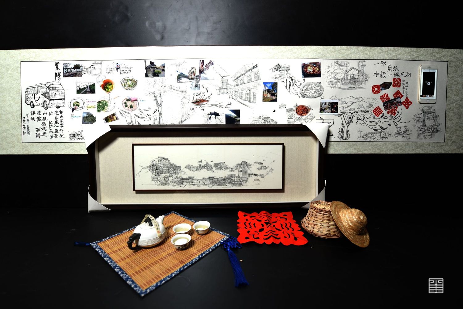 本组的灵感来自于随行日记。利用照片剪贴,剪纸,针管笔平替毛笔,作于长卷轴模拟试卷轴的形式来记录在紫阳写生的九天每一天的行程日记。照片主要为紫阳风景,活动记录,紫阳建筑,甚至是美食等。再增加一些剪纸,书法,文字来活跃丰富画面。平桌上我们选择了茶壶茶杯,采茶帽以及采茶篓来体现紫阳茶叶的民俗特色。