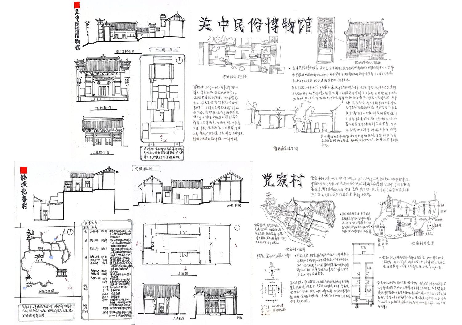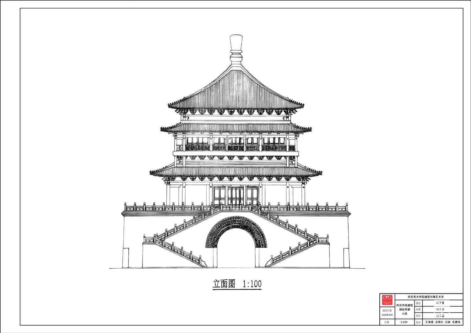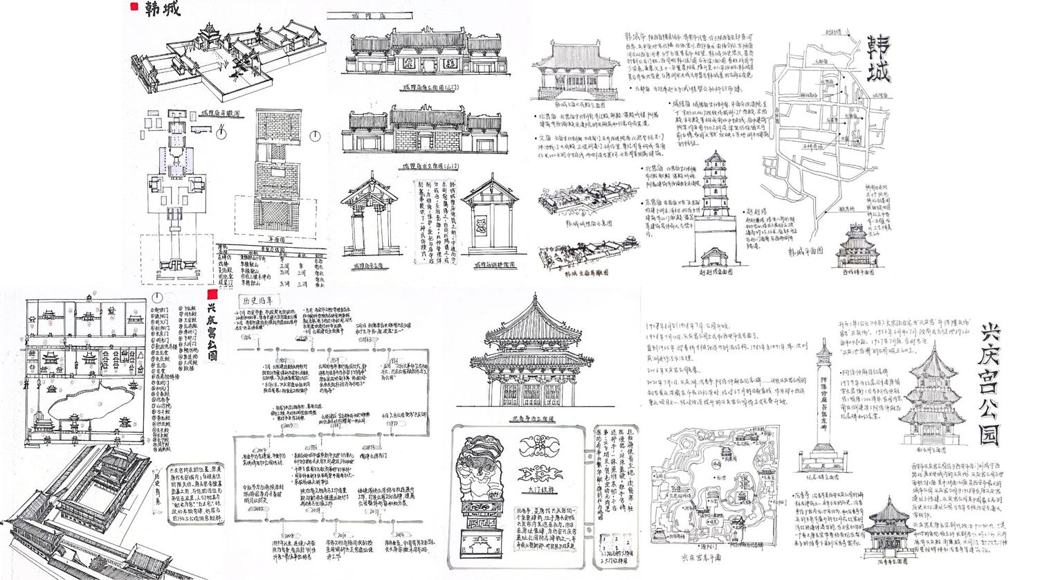 西安传统建筑测绘考察小组工作主要围绕考察、测绘西安城区内历史保护建筑、传统建筑形式公共建筑、校区内传统形式建筑的空间维和形式、平立剖特点、建筑空间细节尺度。测绘考察建筑有西安钟楼、陕西历史博物馆、兴庆宫公园、关中民俗博物院,结合网上长安城、党家村、梁代村芮国遗迹博物馆的资料收集,综合线上线下的测绘考察资料,掌握中国传统建筑历史发展沿革墩、地域人文特色、综合环境要素、功能技术以及艺术形式等全方位多层次的分析研究学习。