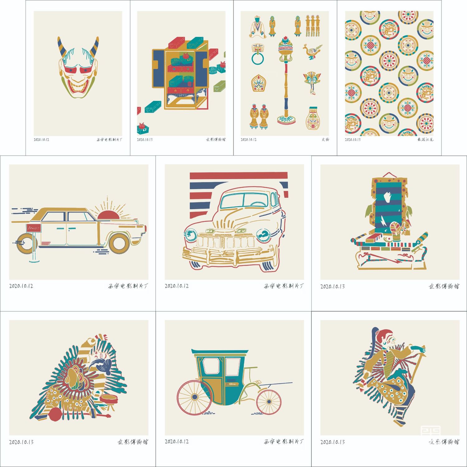 我们将专业考察的见闻用海报册子藏书票 贴纸的形式创作了出来。我们运用了点线面色彩概括的手法,将我们在考察途中的所见所闻如西影厂里的古董老爷车,黄包车,茂陵博物馆里的石人石像,西汉明清皮影艺术博物馆里的人物,山海经里的怪物等,将他们用童趣诙谐的色彩与形状演绎在纸面之上,往这些本不会活动的事物注入生命的活力,以此来带给人们一些俏皮生动的乐趣。