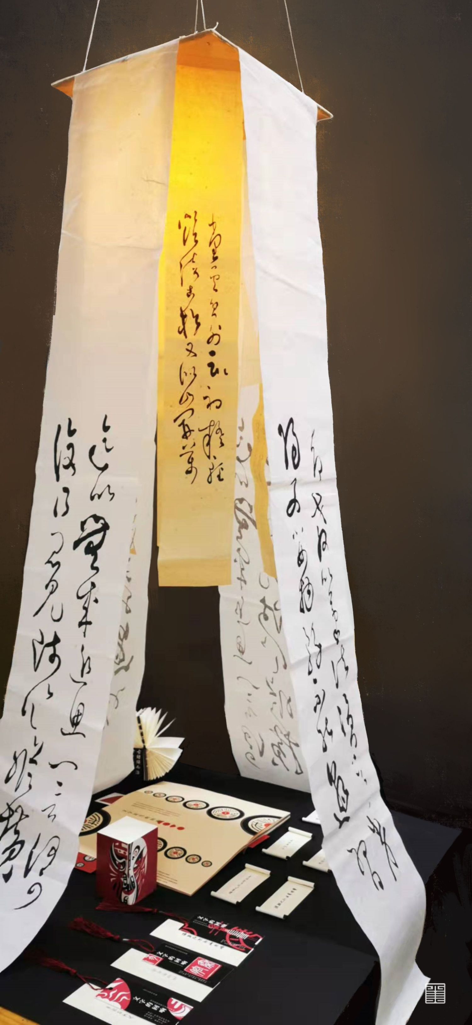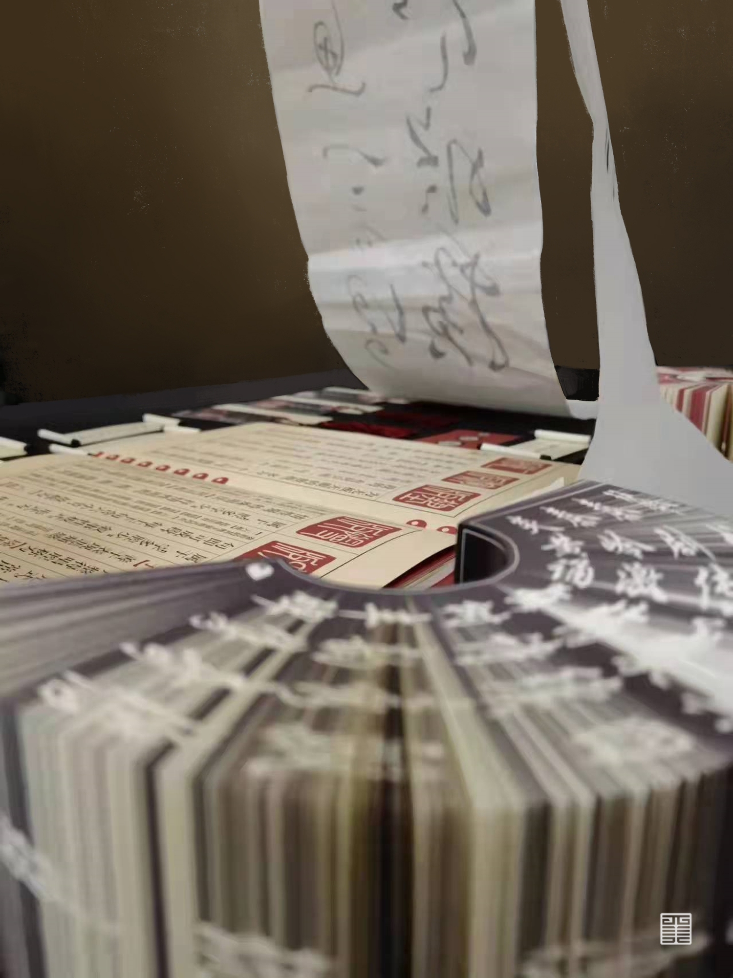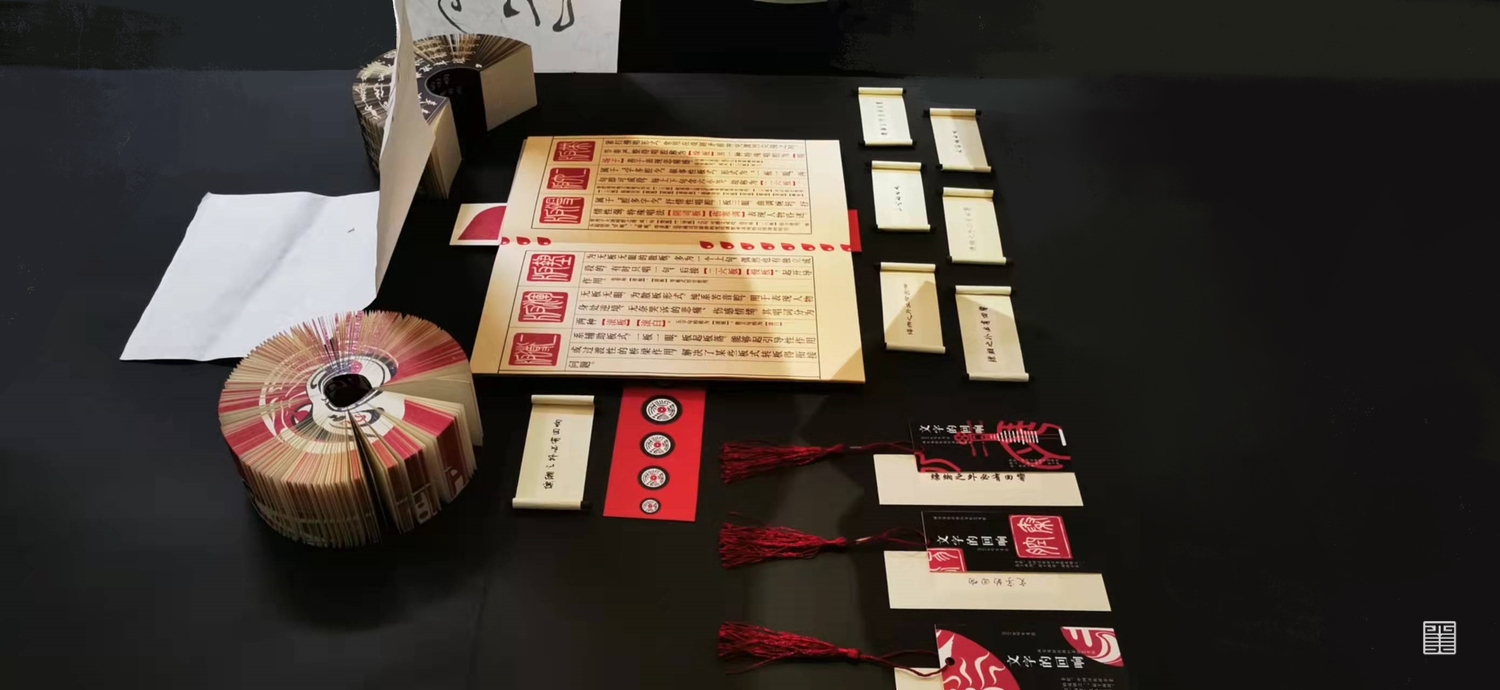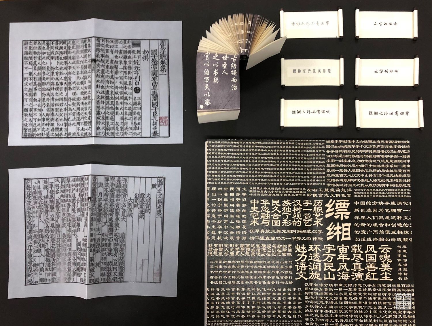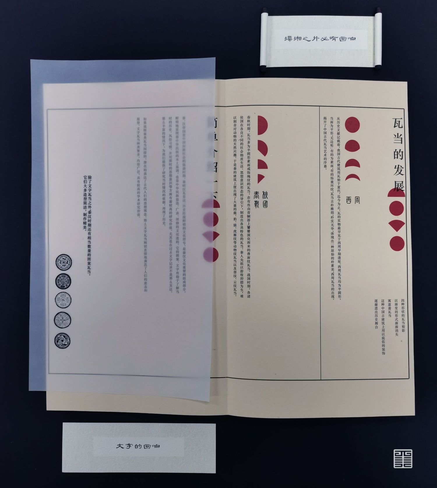 展馆中所陈列的各具气质的古籍文字,刻在秦砖汉瓦上的装饰性的文字,秦腔中唱出来的文字,一方特色的音律,遂以文字为切入点,主题是“文字的回响”,即缥缃之外必有回响,它们不单是刻在书本上的文字,做文化历史的传承,做修身养性的书法,也可以装饰,多变,附美好寄托于檐上瓦当,也可以是一方言语特色音律,富有感情色彩,声声传唱。回顾历史所积淀的文字之美。