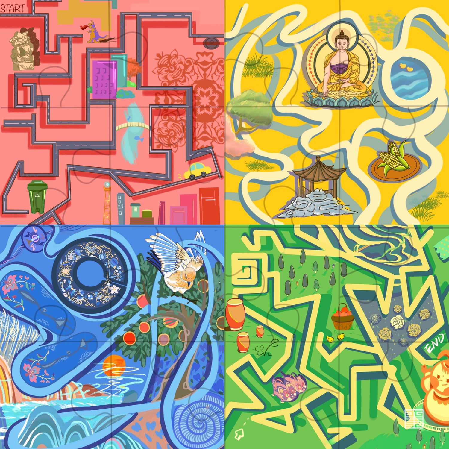 以陕北独特的颜色作为四个色块,根据此次写生所去的地方,分为四个不同的场景进行画面创作。将陕北元素与拼图相结合,希望人们可以从拼图的乐趣中体会独特的陕北风情。