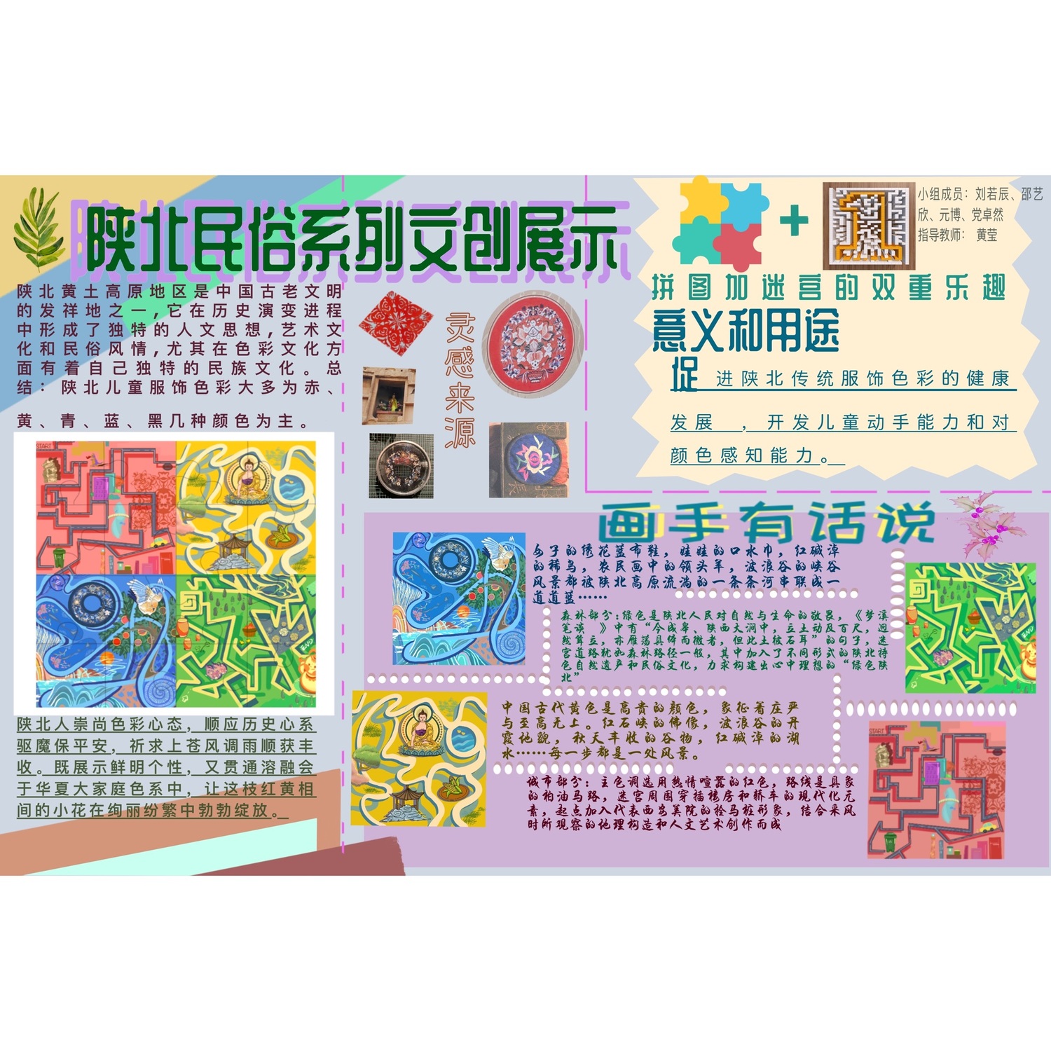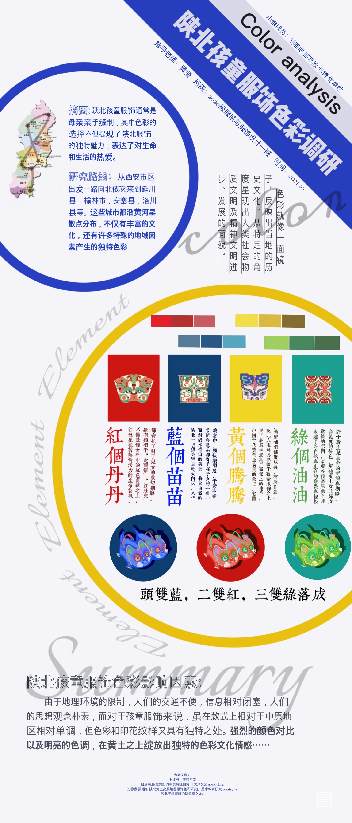 通过对陕北孩童服饰色彩调研,发现大多以红,黄,蓝,绿,黑几种颜色为主。选取色彩与采风所见相结合,如孩童服饰中口水巾,红石峡的佛像,抓髻娃娃,安塞腰鼓,陕北剪纸等多种元素进行绘图,最后以拼图的形式呈现,希望促进陕北传统服饰的发展,开发孩童的动手能力和对色彩的感知能力。