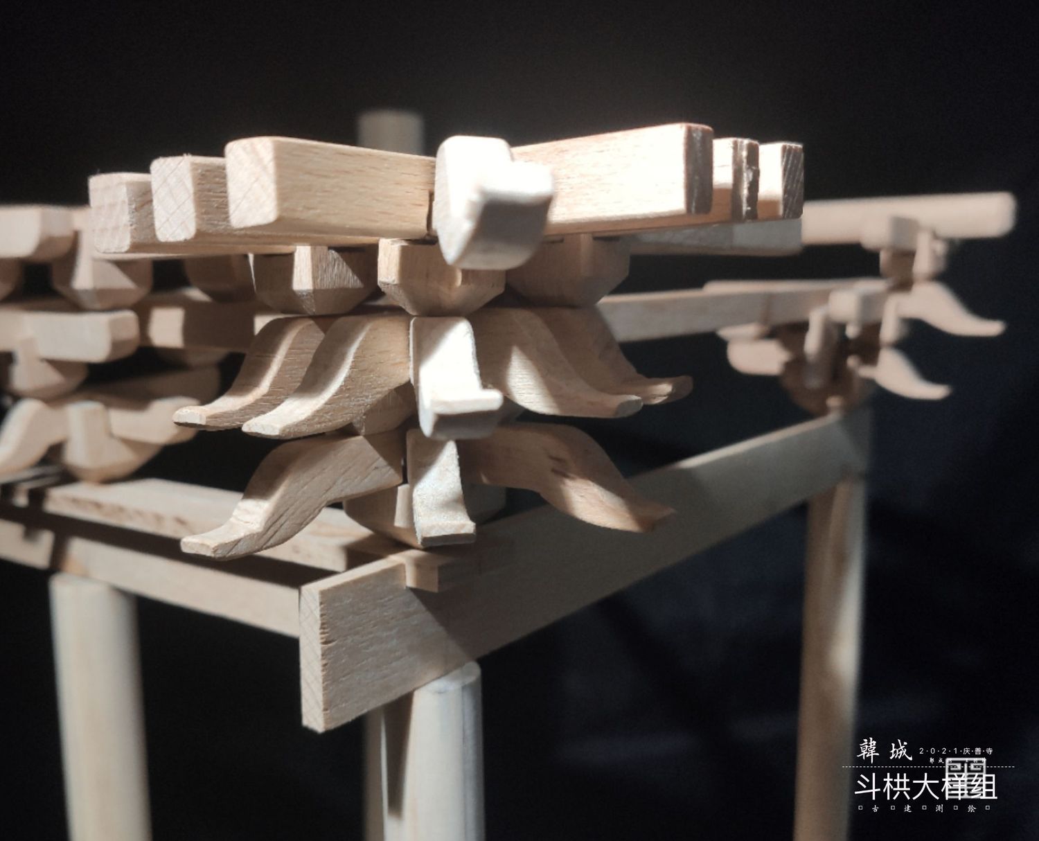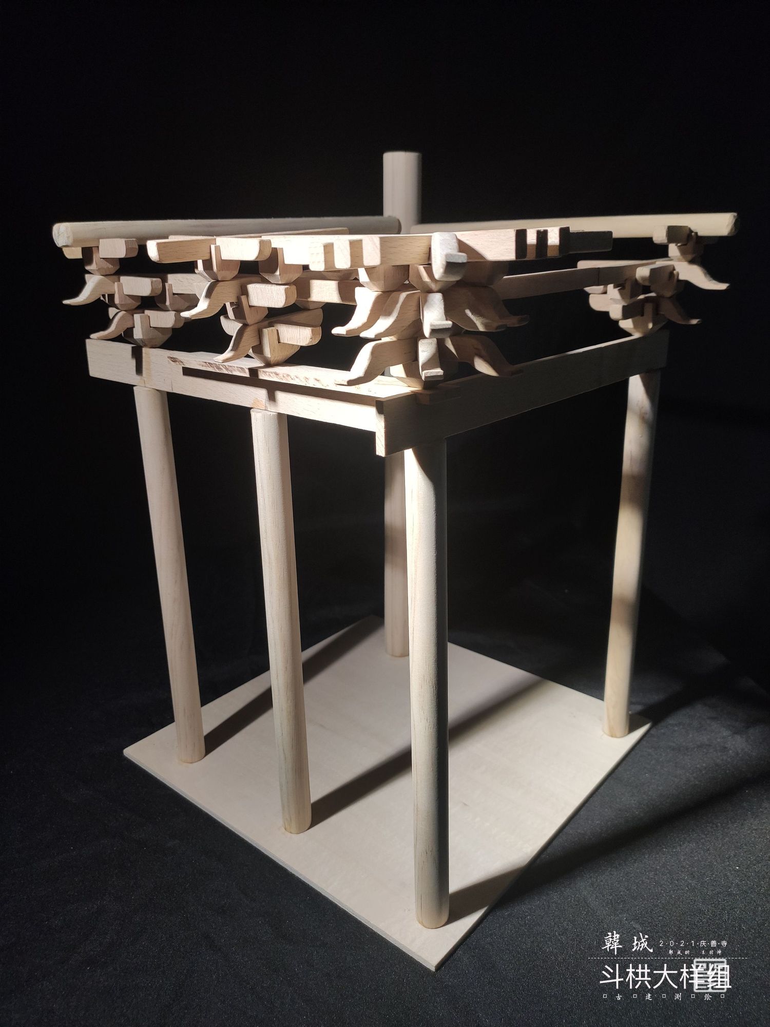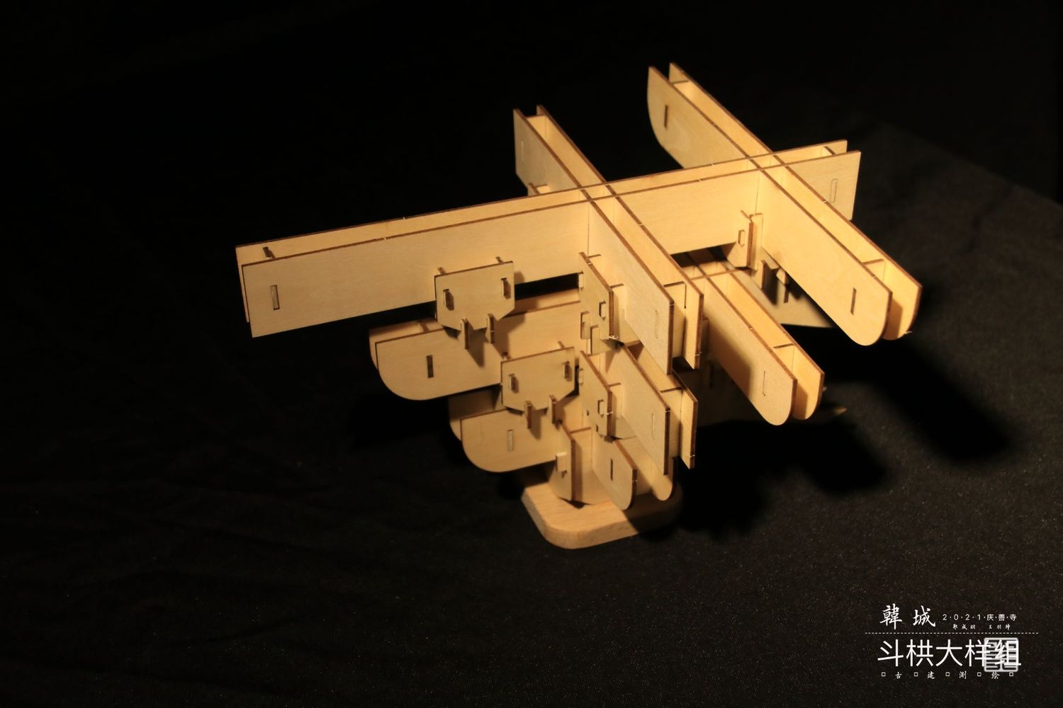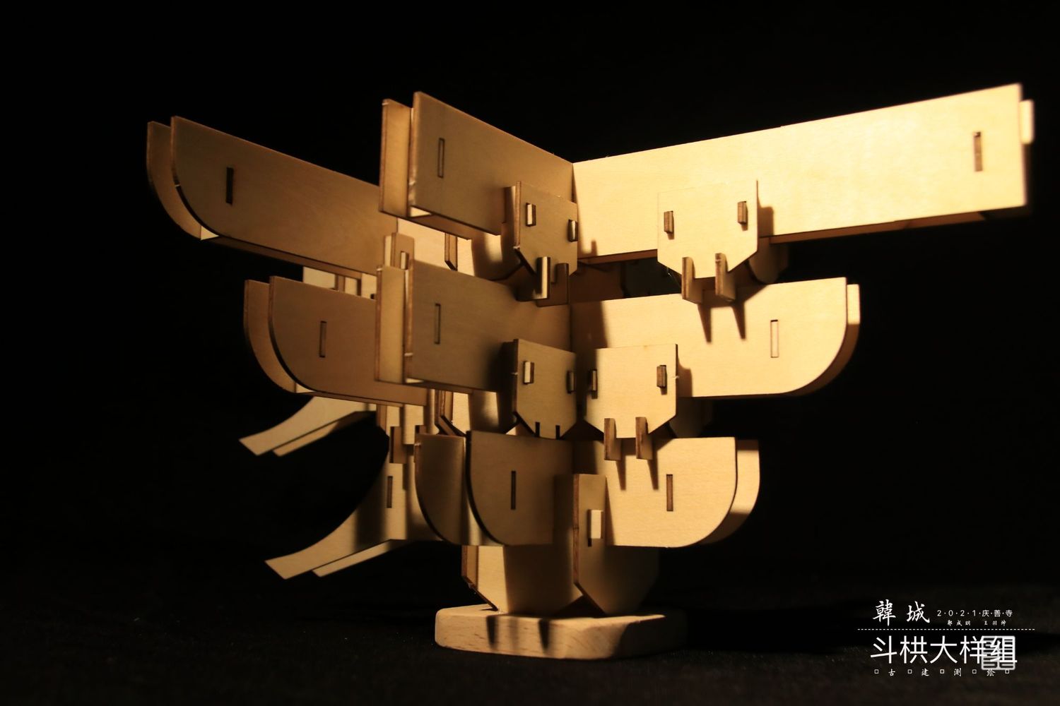 主要以实体模型和文创呈现斗栱样式,模型是以可拆卸木质构建手工制作而成,文创使用两毫米椴木板激光雕刻拼装而成,有成套CAD图纸可以直接打印拼接。