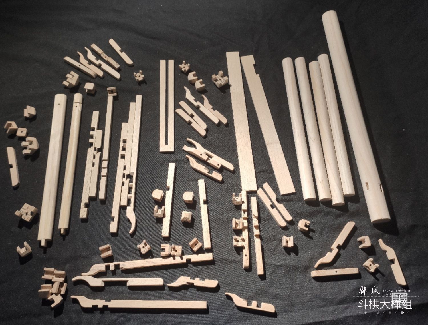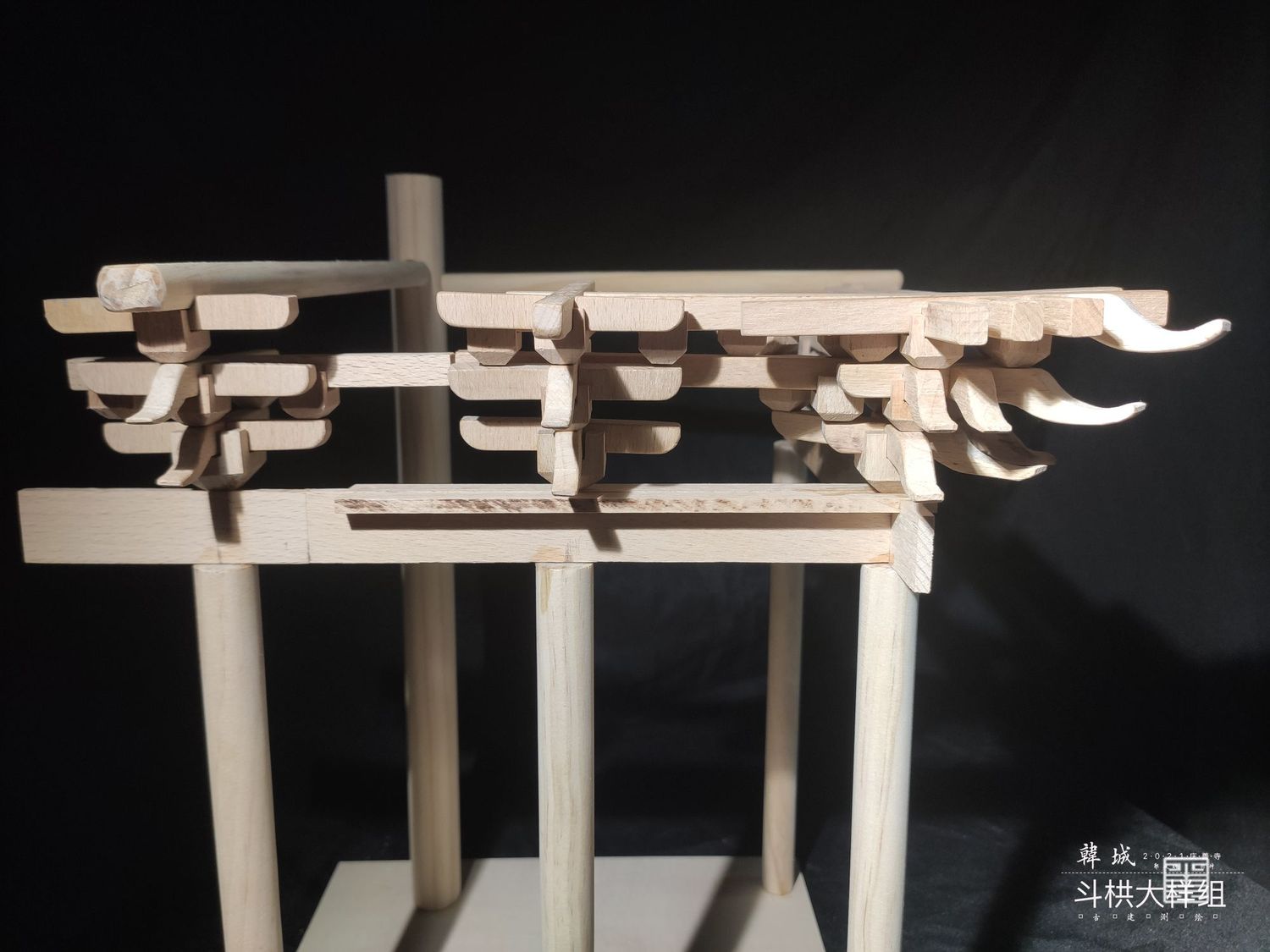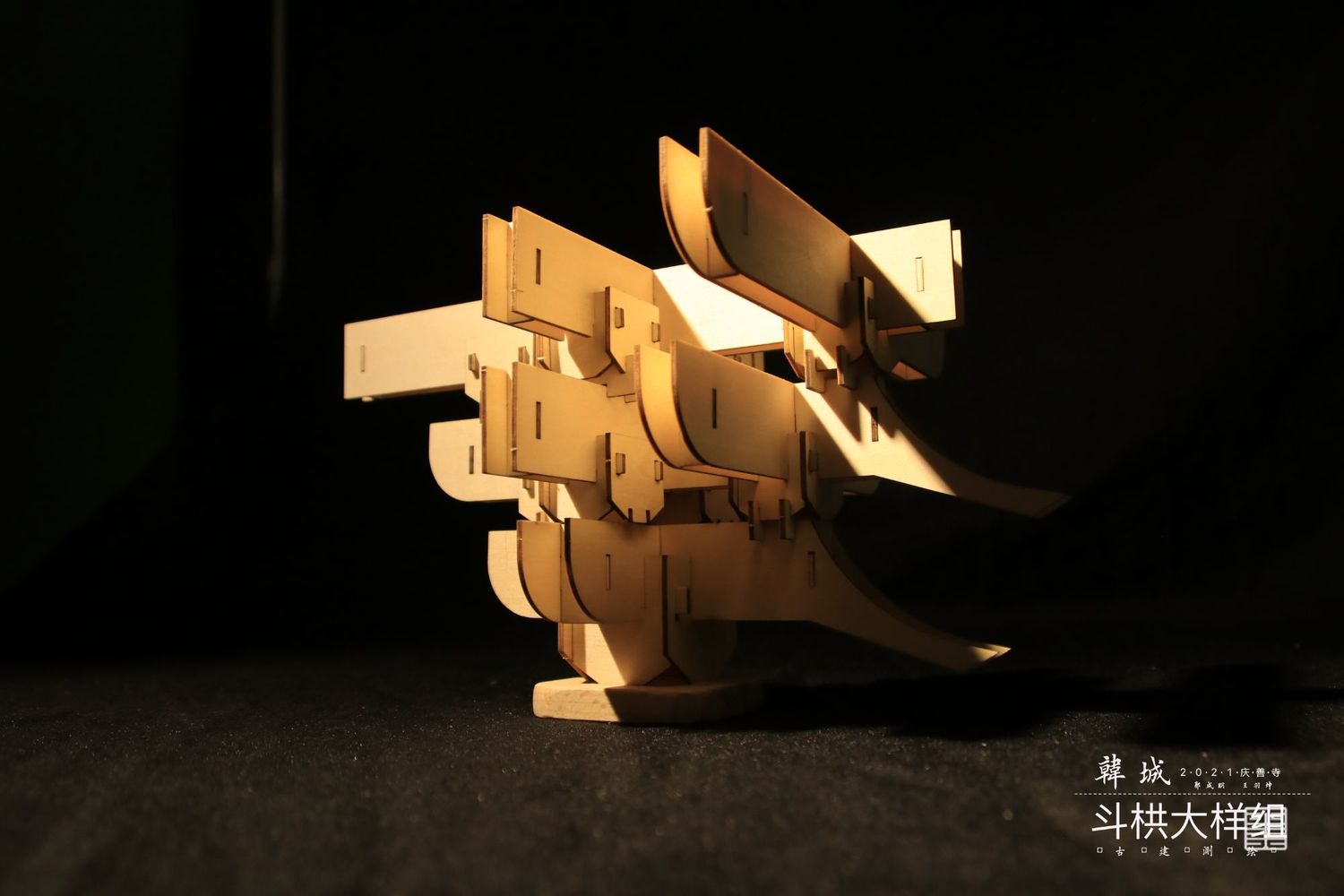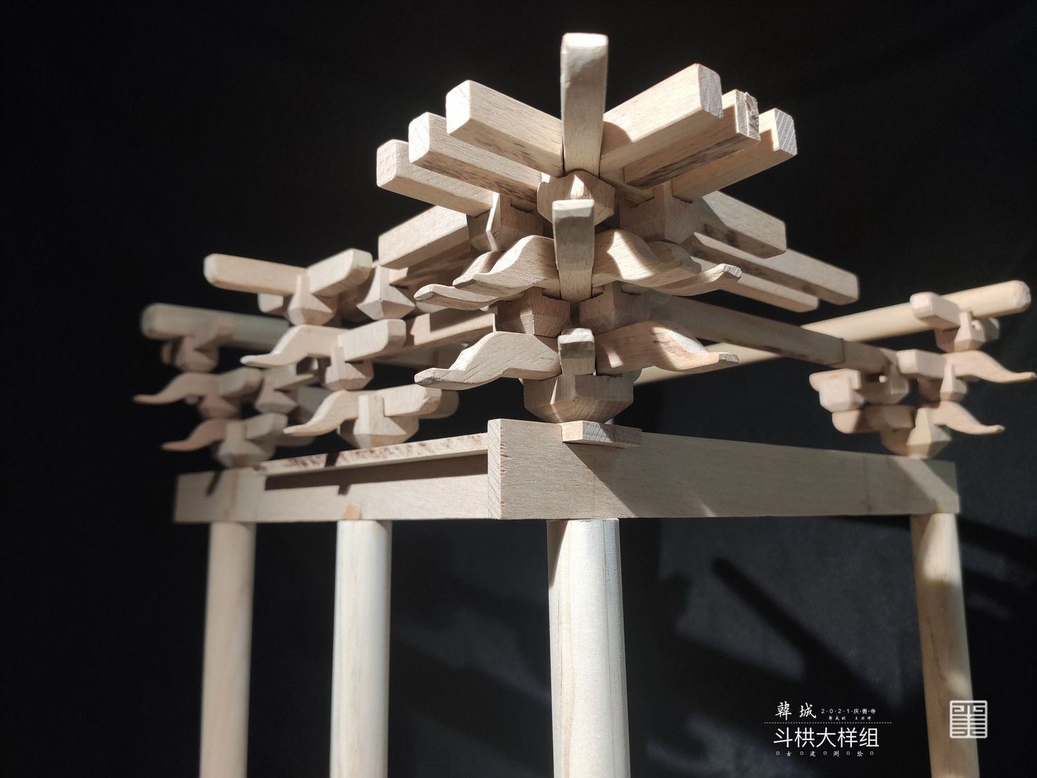 主要以实体模型和文创呈现斗栱样式,模型是以可拆卸木质构建手工制作而成,文创使用两毫米椴木板激光雕刻拼装而成,有成套CAD图纸可以直接打印拼接。