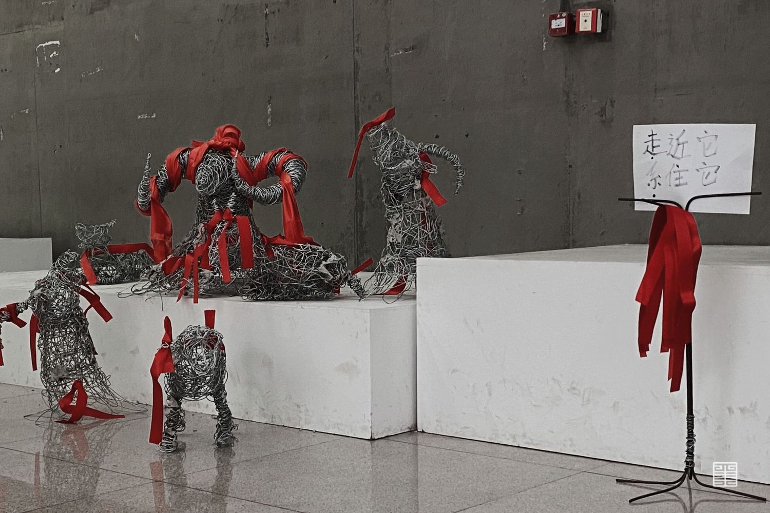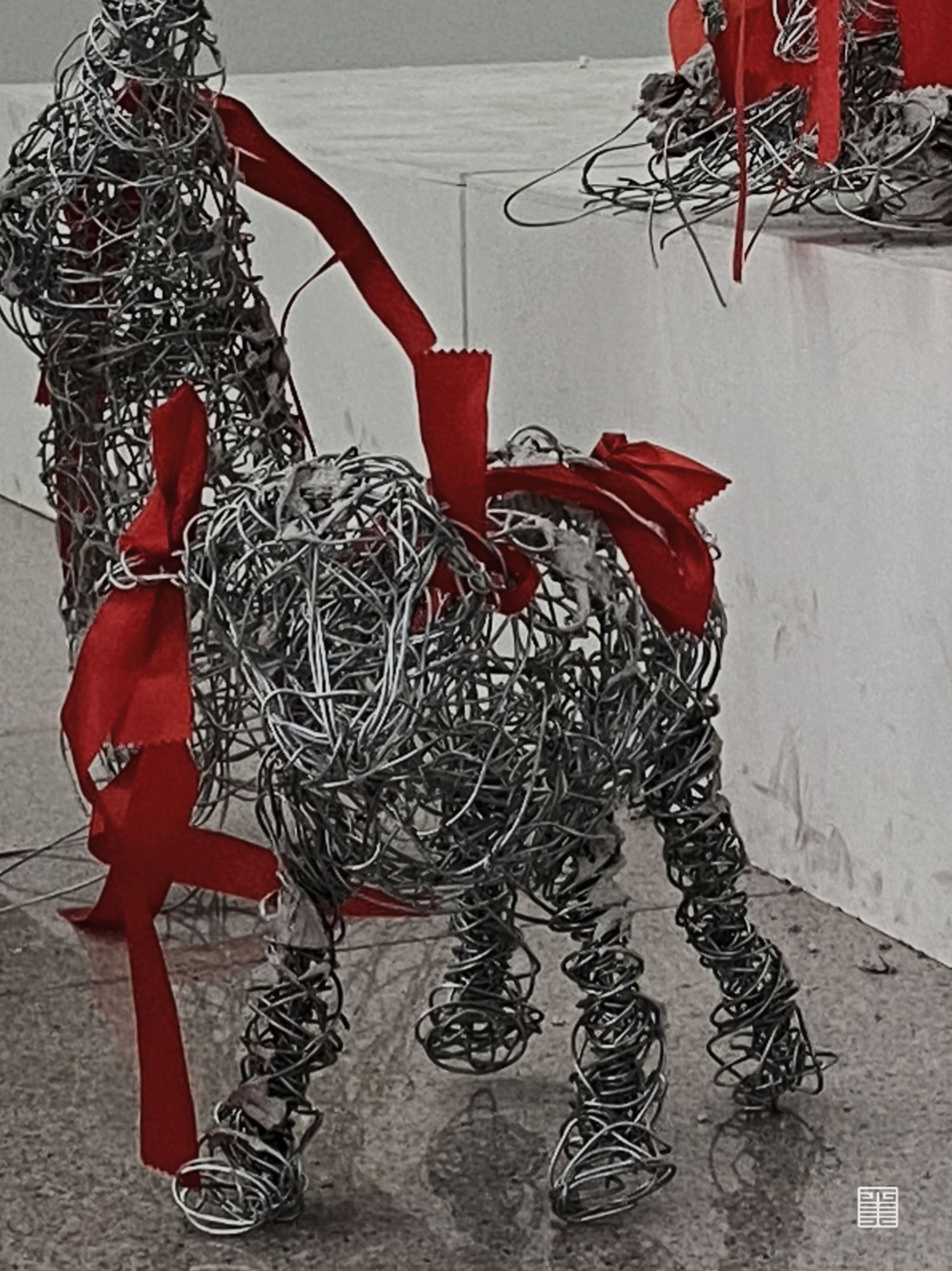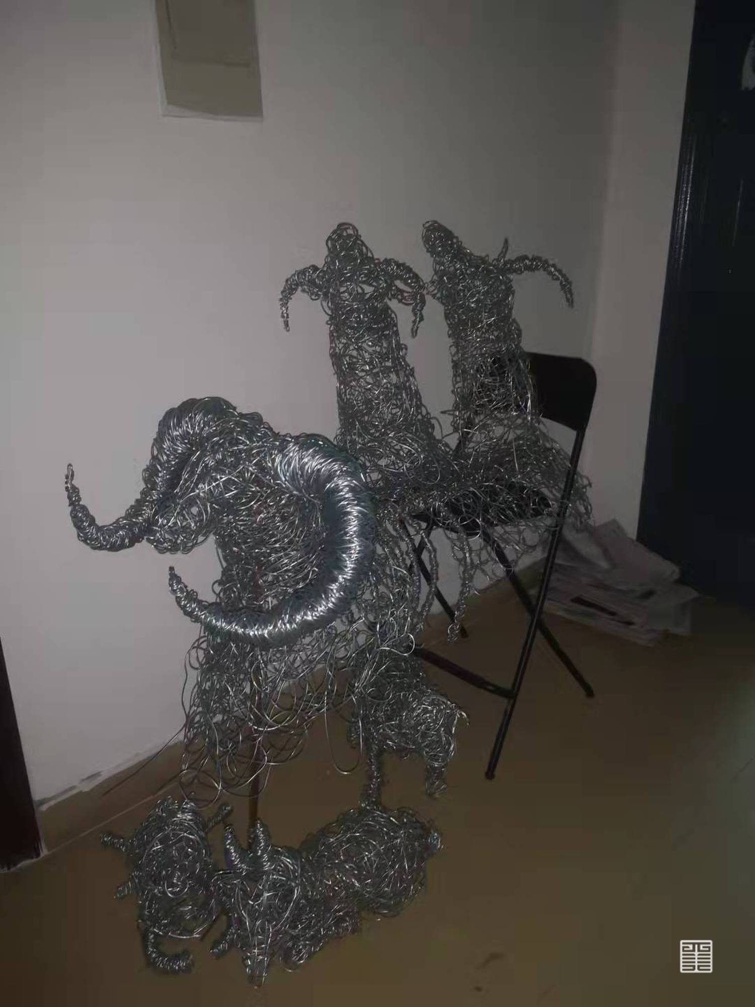 主要运用铁线和水泥进行羊的塑造。 铁线和水泥分别对应钢筋和混凝土,作为现代城市 的缔造主体,突出表现在高速发展的城市建设下,传统的羌族作为牧羊的“云上的民族”如今已经渐渐不在 牧羊,代表民族图腾的盘羊,现在只会以羊头骨的样 貌出现在具有表演意味的祭祀活动中。 作为藏文化的延续,羌族人和藏区人一样对数字的使 用以奇数为吉祥;在偶数中,只有6这个数被视为3 的倍数,所有我们的设定为六只羊,一公三母二小, 姿态各异。在装置上安装红外感应模块,当观赏者进入观看的范围中时,触发红外感应,引发音响放出羊 的叫声。机械的羊叫声一方面代表传统的风俗变得名存实亡,现在仅作为一个象征的形式存在,另一方 面程序化的声音会给人的死板和冷酷的感受,突出社会发展冲击下,对一些传统习俗的忽视。 羊的叫声,也作为一种信号,不仅仅吸引着路过的人群,也呼吁着人们关注