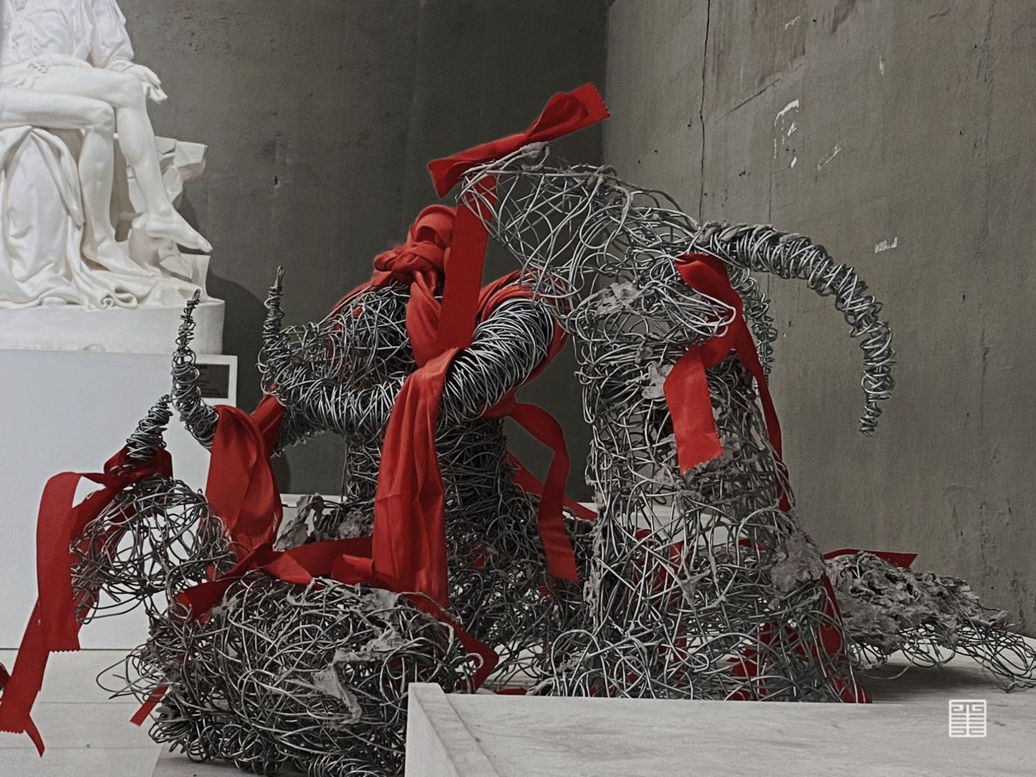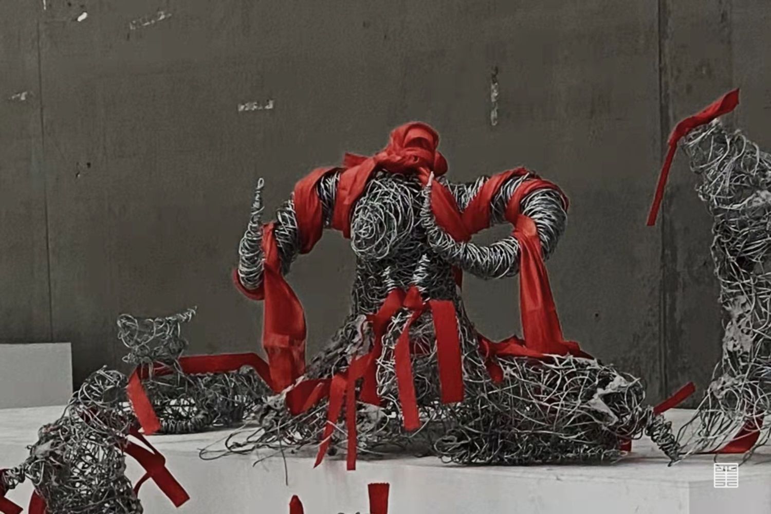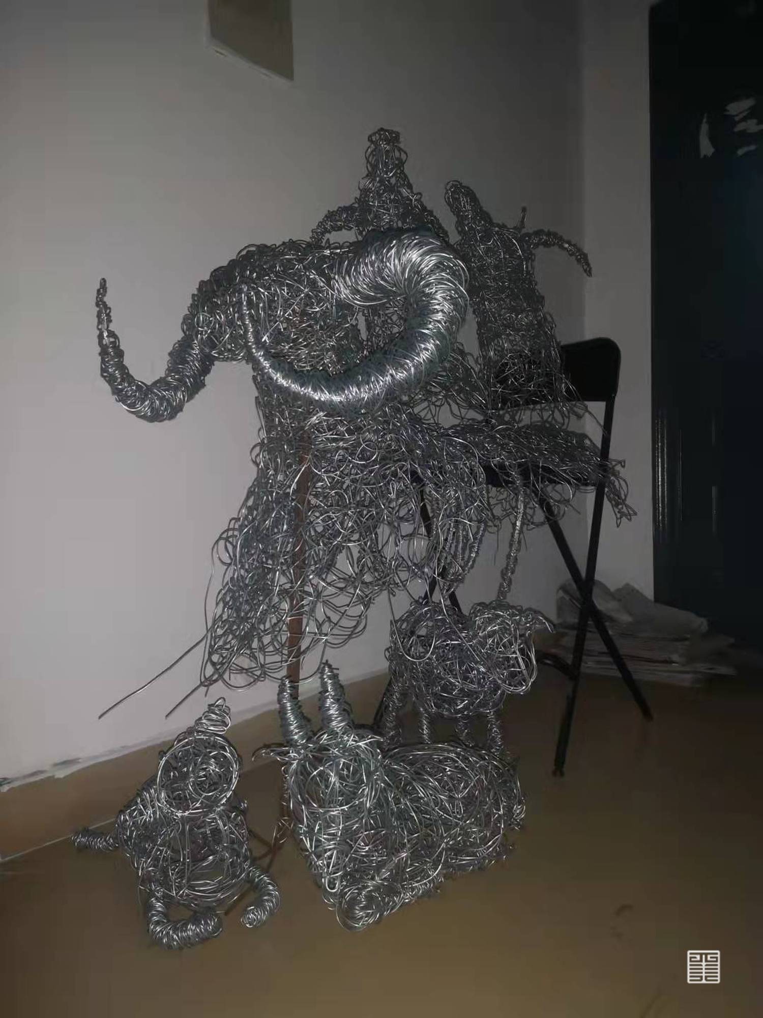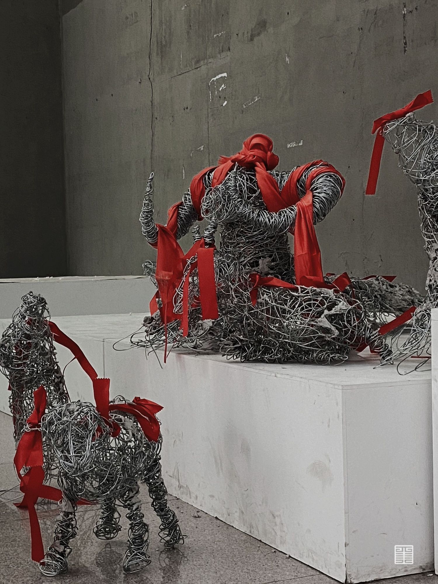 主要运用铁线和水泥进行羊的塑造。 铁线和水泥分别对应钢筋和混凝土,作为现代城市 的缔造主体,突出表现在高速发展的城市建设下,传统的羌族作为牧羊的“云上的民族”如今已经渐渐不在 牧羊,代表民族图腾的盘羊,现在只会以羊头骨的样 貌出现在具有表演意味的祭祀活动中。 作为藏文化的延续,羌族人和藏区人一样对数字的使 用以奇数为吉祥;在偶数中,只有6这个数被视为3 的倍数,所有我们的设定为六只羊,一公三母二小, 姿态各异。在装置上安装红外感应模块,当观赏者进入观看的范围中时,触发红外感应,引发音响放出羊 的叫声。机械的羊叫声一方面代表传统的风俗变得名存实亡,现在仅作为一个象征的形式存在,另一方 面程序化的声音会给人的死板和冷酷的感受,突出社会发展冲击下,对一些传统习俗的忽视。 羊的叫声,也作为一种信号,不仅仅吸引着路过的人群,也呼吁着人们关注