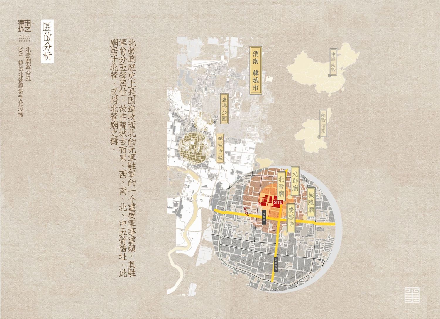 北营庙历史上是因进攻西北的元军驻军的一个重要军事重镇,其驻军曾分五营居住,故在韩城古有东、西、南、北、中五营旧址,此庙居于北营,又得北营庙之称。