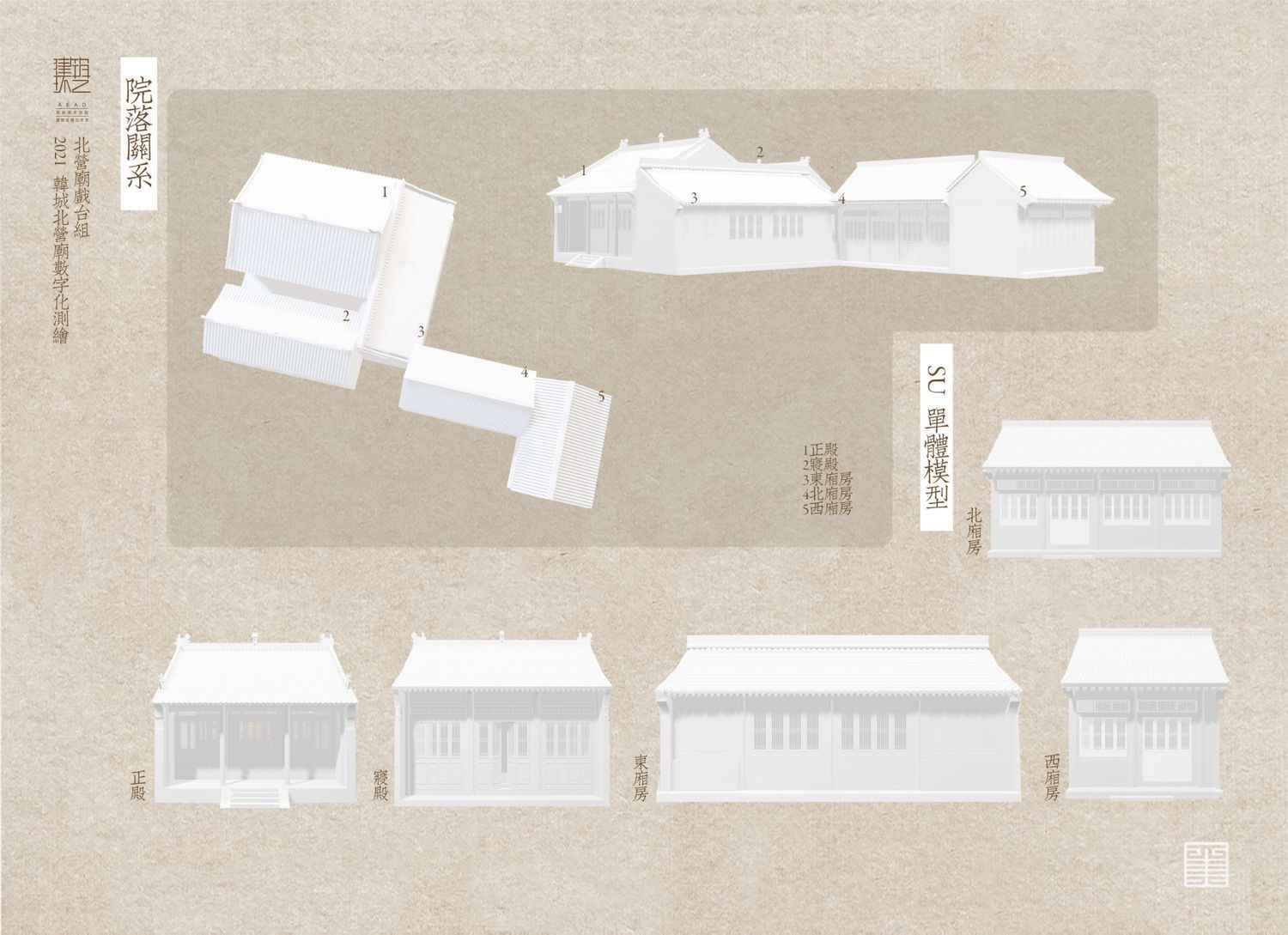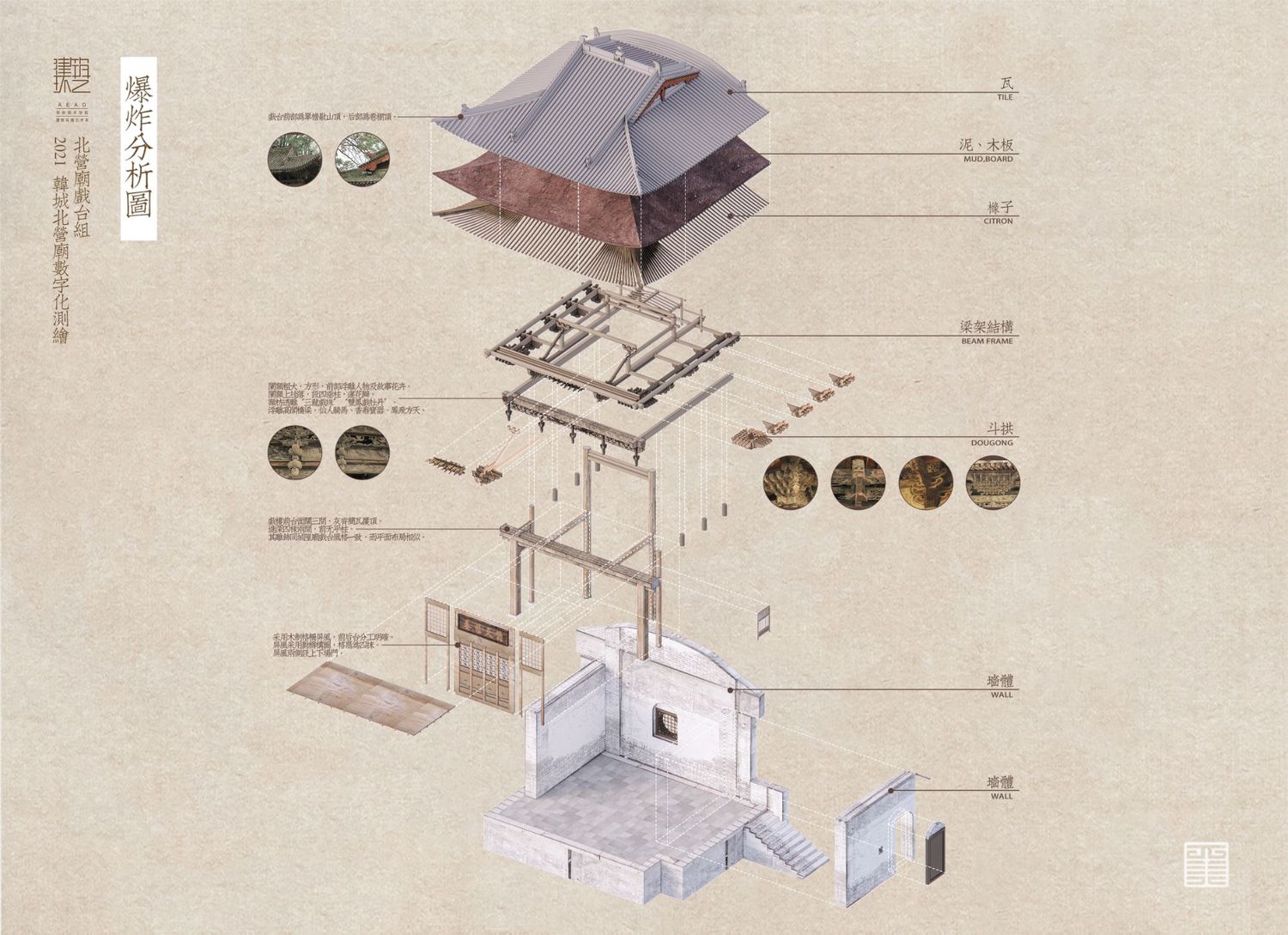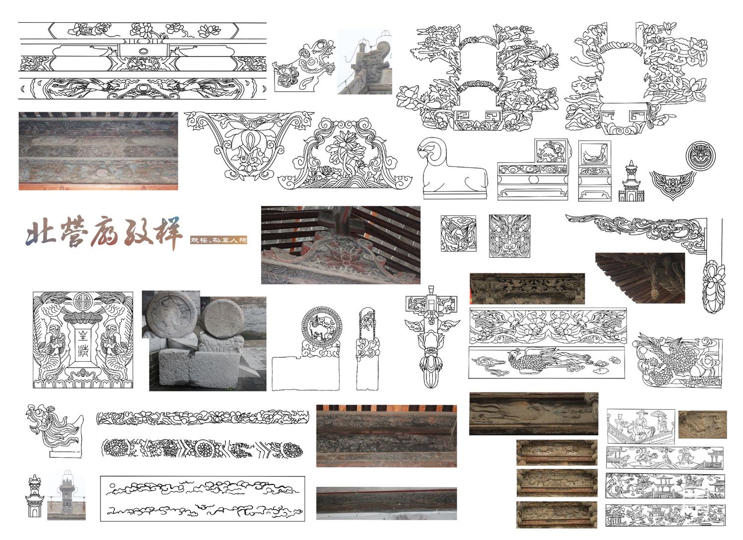 北营庙戏楼方位坐南向北,为三面观戏,以南偏东,45度角偏向供奉关帝的神殿,在其南偏西45度的地方,是“单檐硬山顶布筒瓦殿宇”——药王殿,也就是 “孙真人祠”。孙真人祠建于金代的可能性相当大,正好与其形制、规模十分接近的戏楼遥相呼应,似为一体,反倒是关帝庙的规模过大,似为后创,故戏楼并非专为它而建