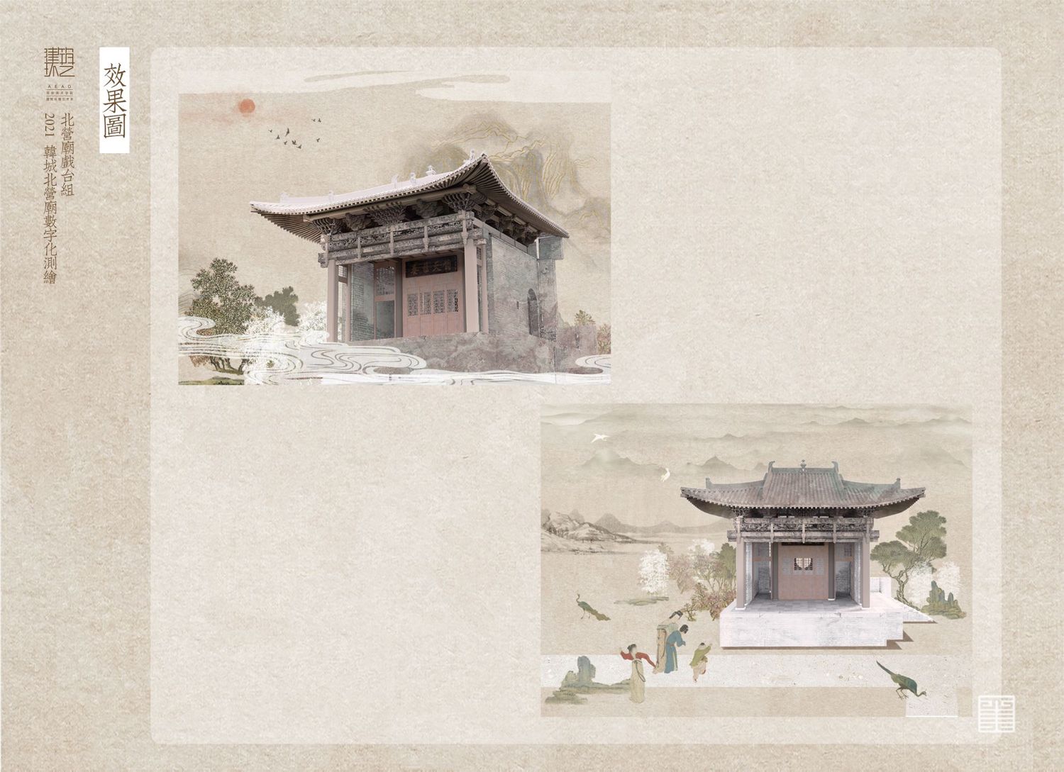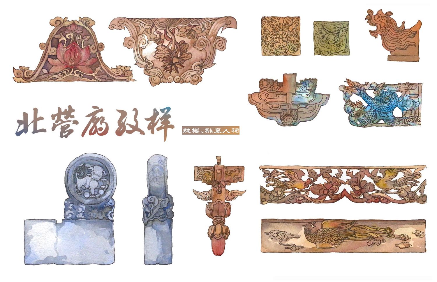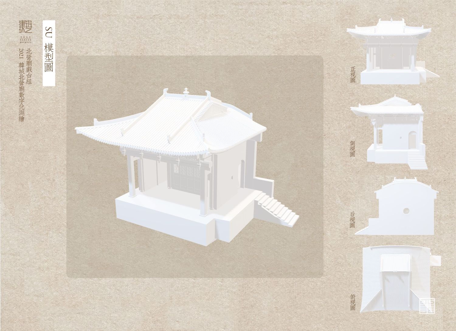 北营庙戏楼方位坐南向北,为三面观戏,以南偏东,45度角偏向供奉关帝的神殿,在其南偏西45度的地方,是“单檐硬山顶布筒瓦殿宇”——药王殿,也就是 “孙真人祠”。孙真人祠建于金代的可能性相当大,正好与其形制、规模十分接近的戏楼遥相呼应,似为一体,反倒是关帝庙的规模过大,似为后创,故戏楼并非专为它而建