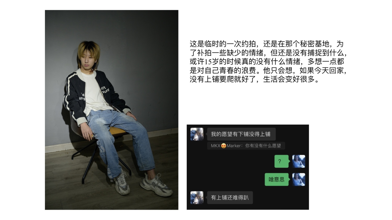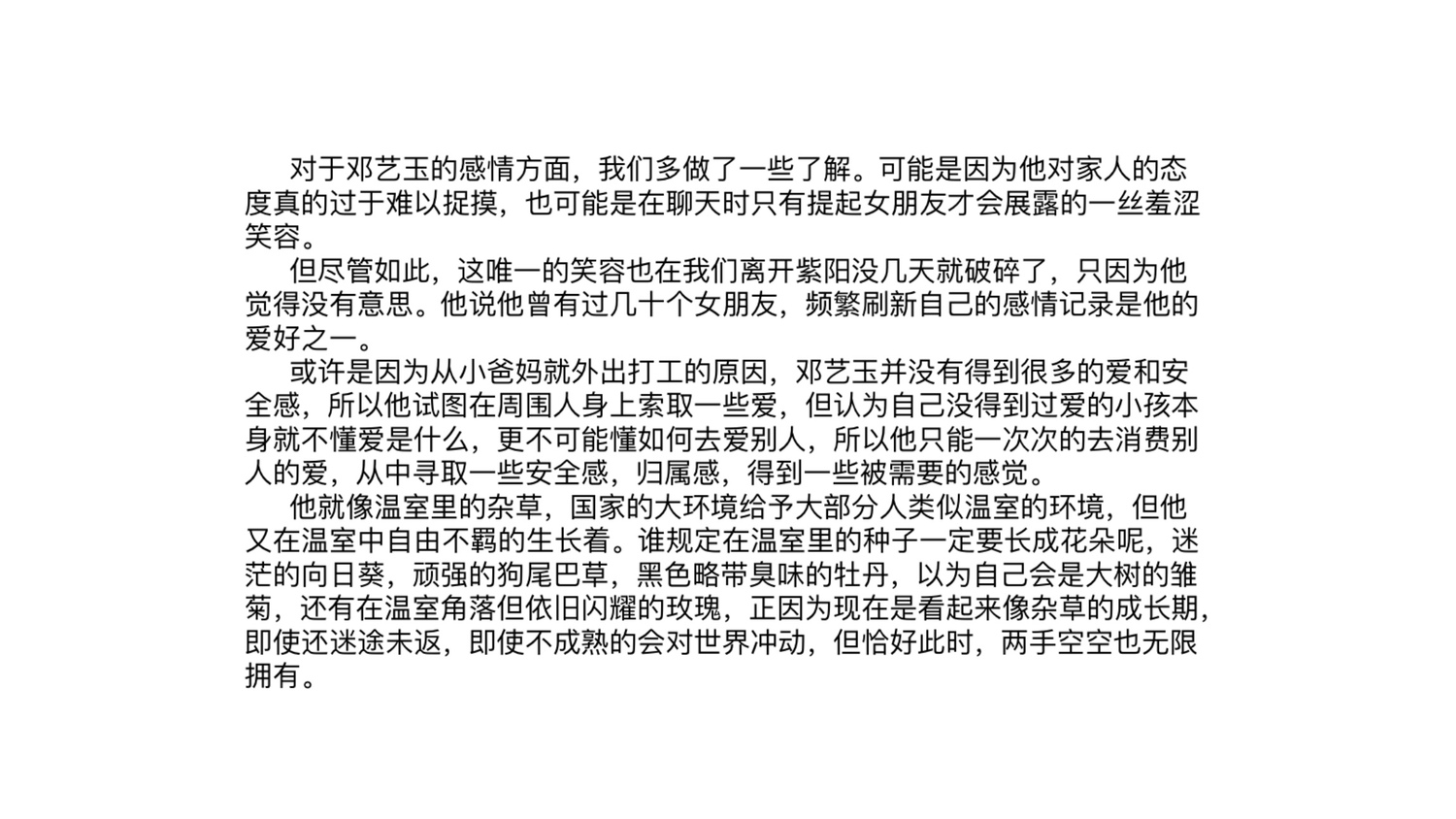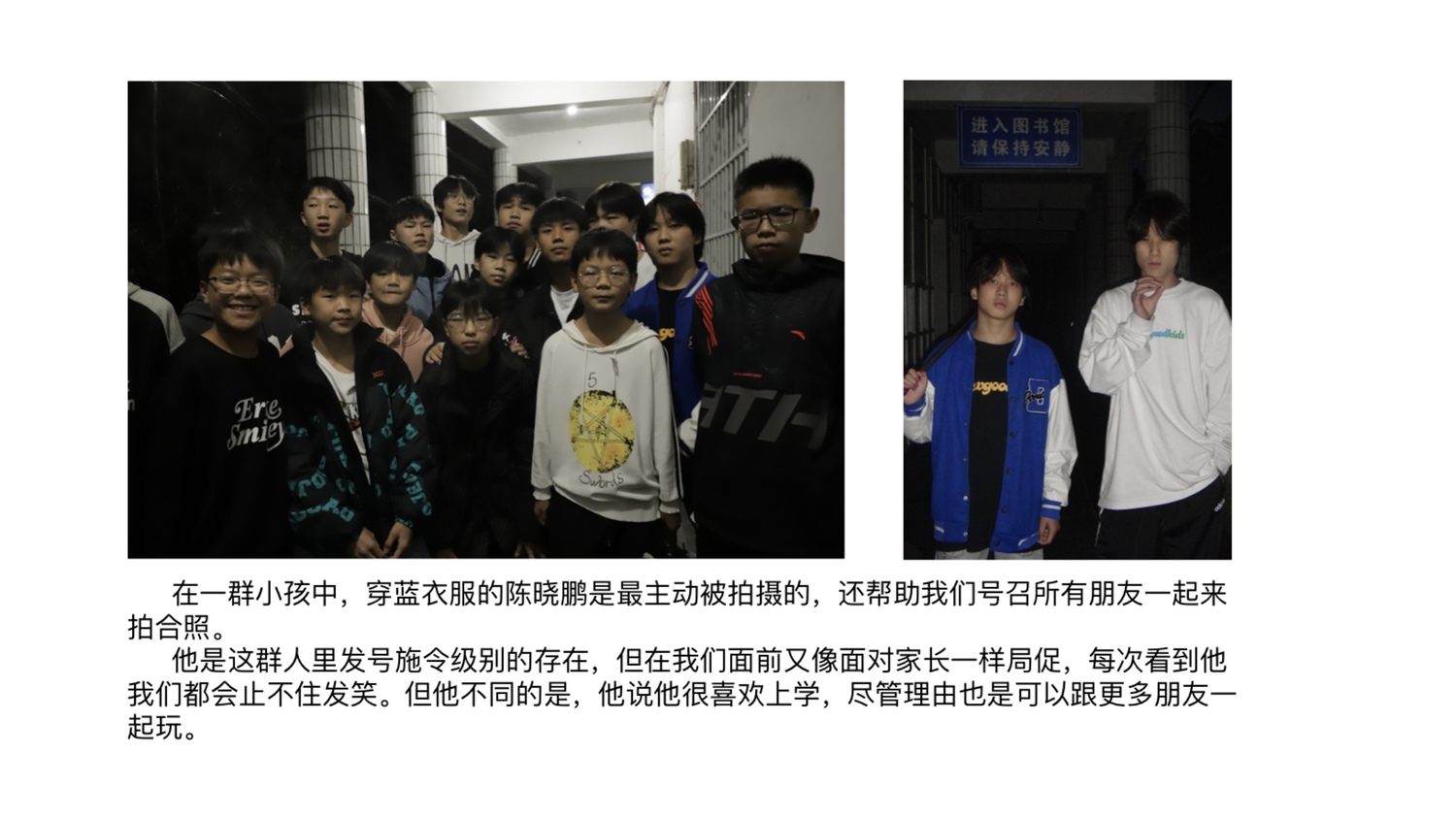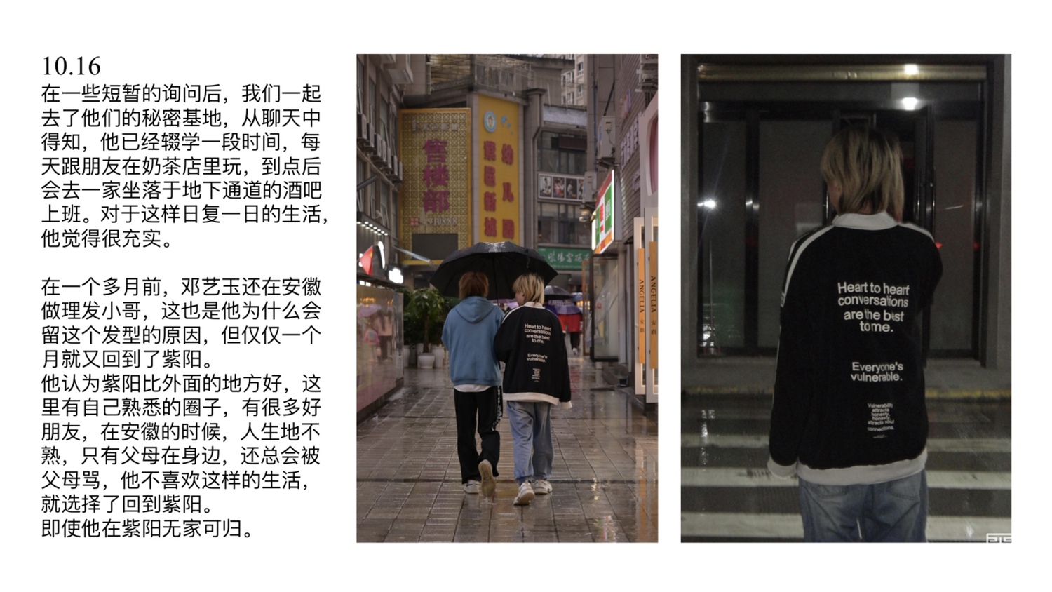 我们在紫阳县认识认识到了一位15岁辍学少年,最初他带给我们的印象是自由的、叛逆的、散漫的,连他的朋友也是和他几乎一样的状态,好像叛逆期的少年都是给人差不多这样类似的印象。但在我们短短几天时间的接触下来,我们发现他其实是很好的小孩,但确实对生活很迷茫,他不喜欢家人,不爱上学,只想跟朋友在一起玩,也只喜欢谈恋爱,很少有人关注他的心里在想什么。国家的大环境给予大部分人类似于温室的环境,而他就像温室里的杂草,但他又在温室中自由不羁地生长着。
