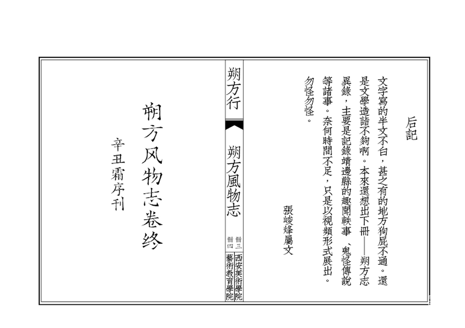 靖边,古称朔方。历史悠久,文化丰富。选取一些典型的记录成为一本书。由于时间限制,《朔方行》系列仿线状古籍只完成了上册《朔方风物志》,下册《朔方志异录》未能完成。本来呢,志异录是有一部分道观搜集鬼怪传说的视频的,然而b站未能过审,只得剪掉。可惜可惜。又不能印刷装订成书,效果打了些折扣。。。