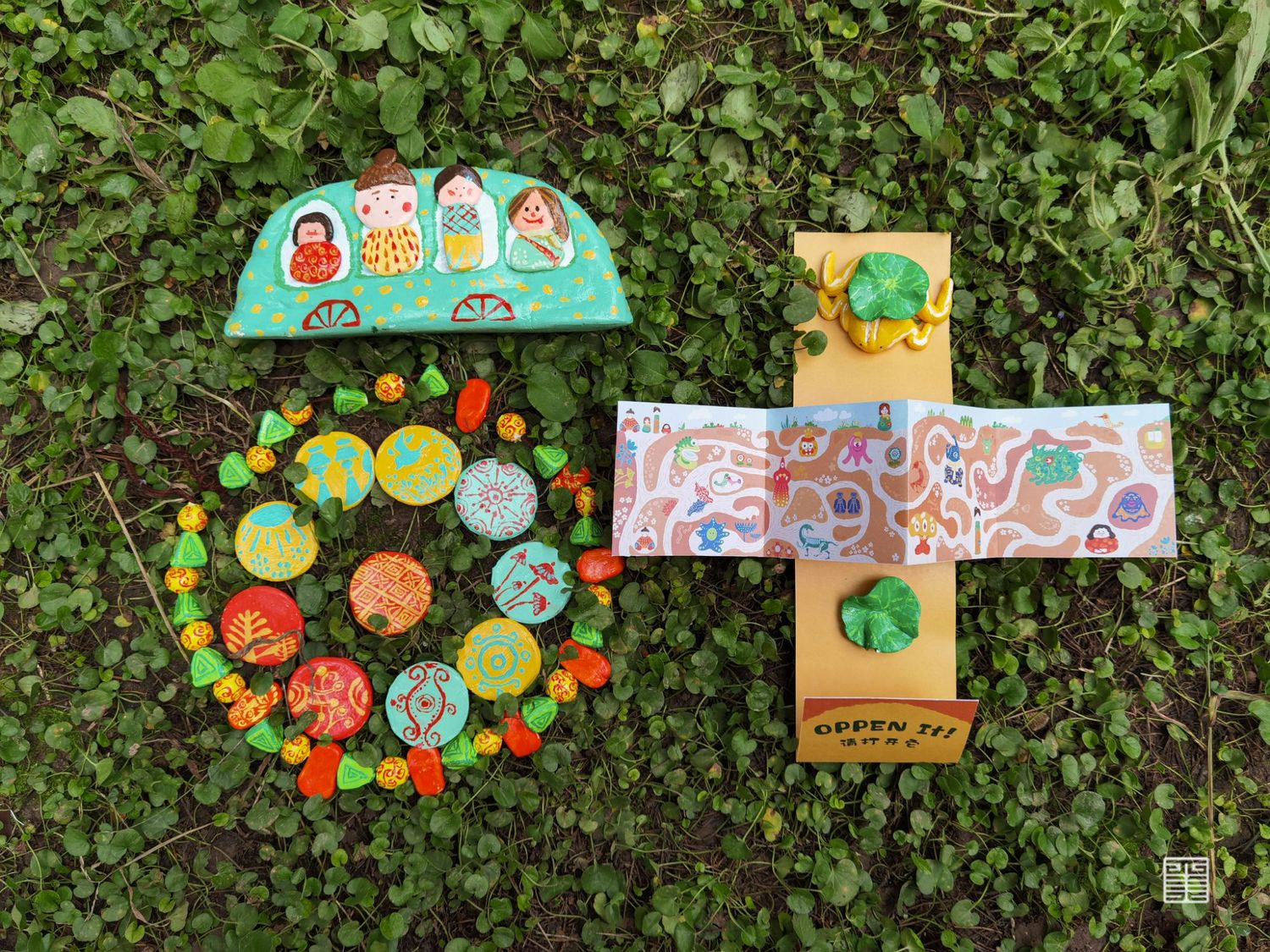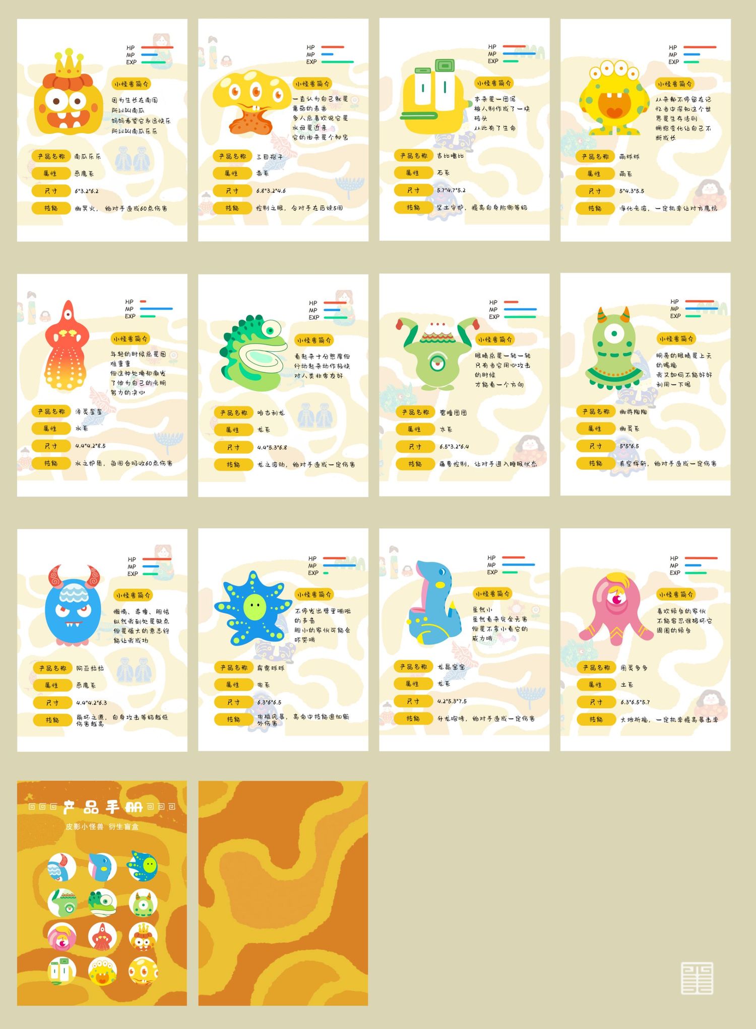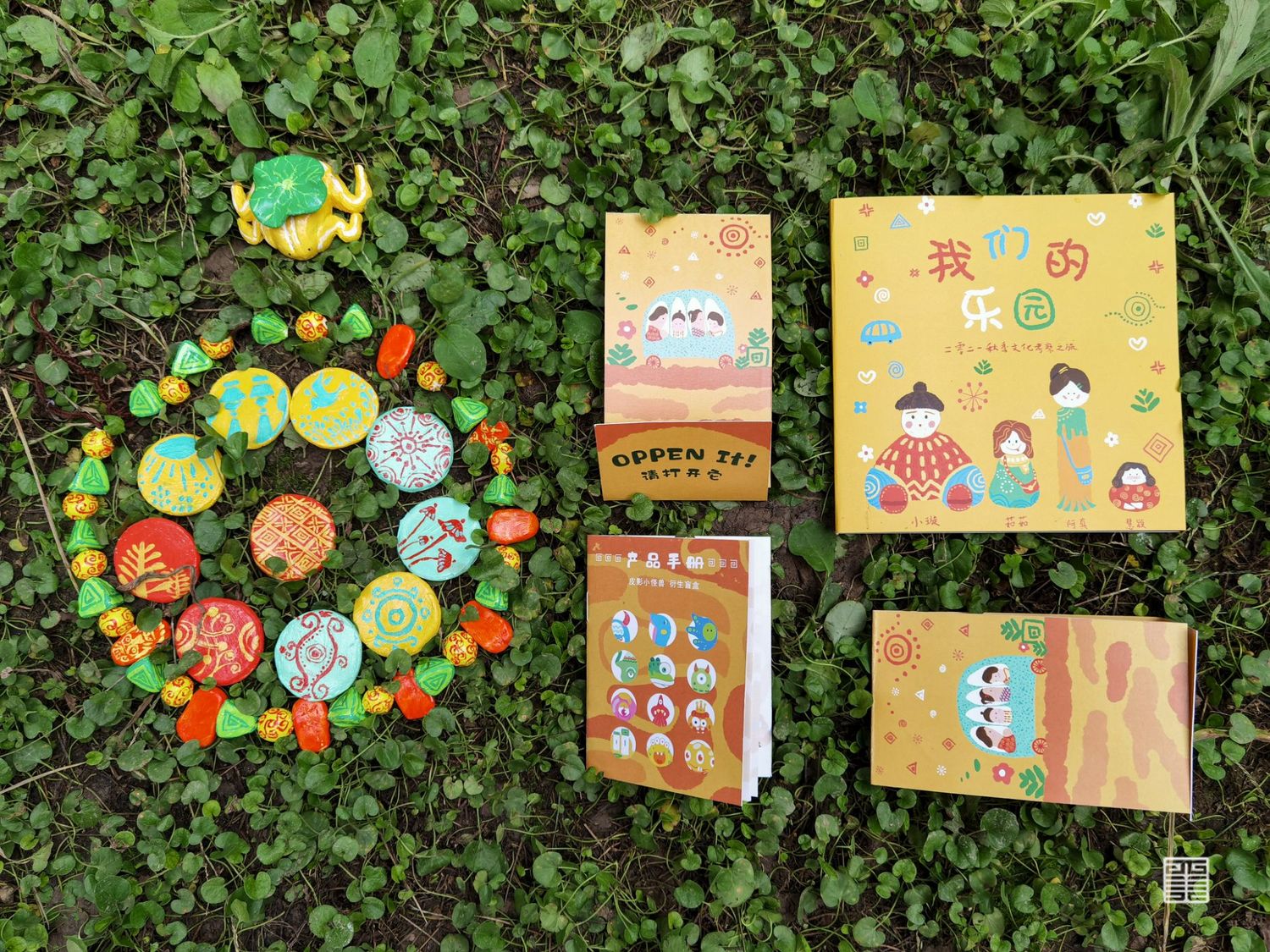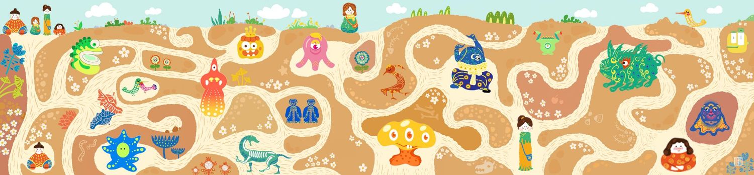 我们用泥塑制作出我们团队四人的形象,并将泥塑形象平面化,把四人探洞游历转化成手绘地图。首先进入艺术家卜桦奇迹般的花草世界,探寻一颗种子如何成为最灿烂的花,将花草元素应用至游记地图、衍生首饰产品中。随后在瓦当的世界获取纹样素材,将瓦当上的装饰元素再设计。随后将陕西皮影中的小怪兽衍生成为盲盒系列产品,再设计出一批新的IP形象,并制作出了盲盒产品手册。我们还通过手绘书将我们的游记经历串联起来,用插画的方式描绘具有童真意趣的游记经历。最后将我们的乐园通过实物摄影的方式,设计出系列海报作品。《我们的乐园》是我们用心打造的、专属于我们的乐园。