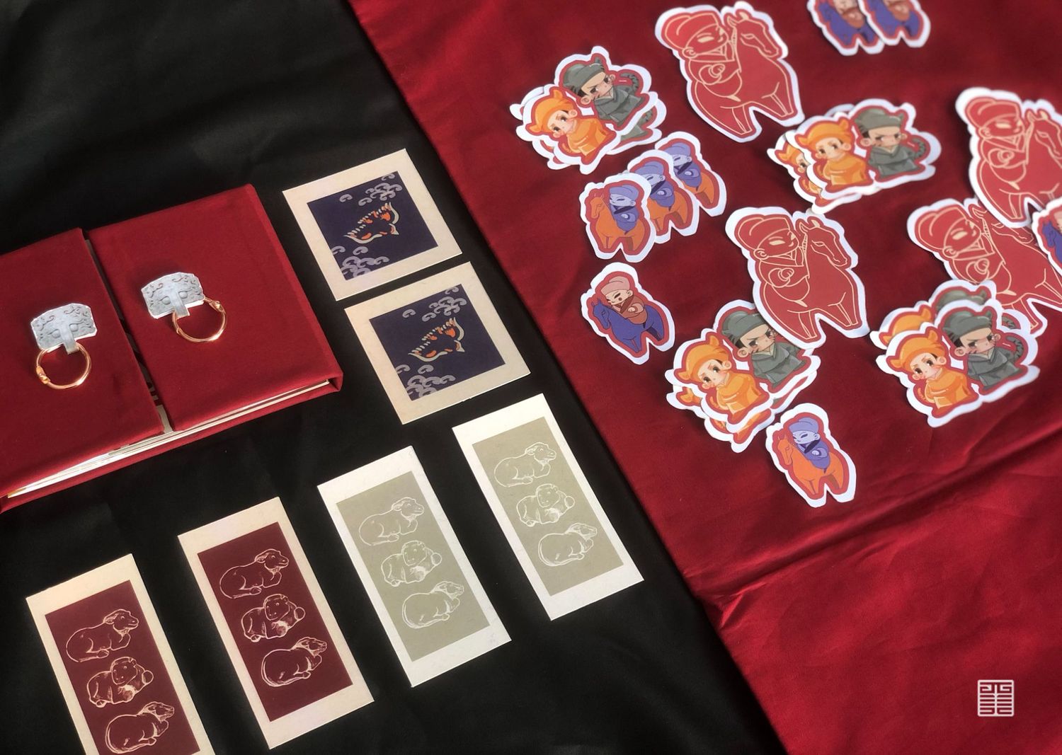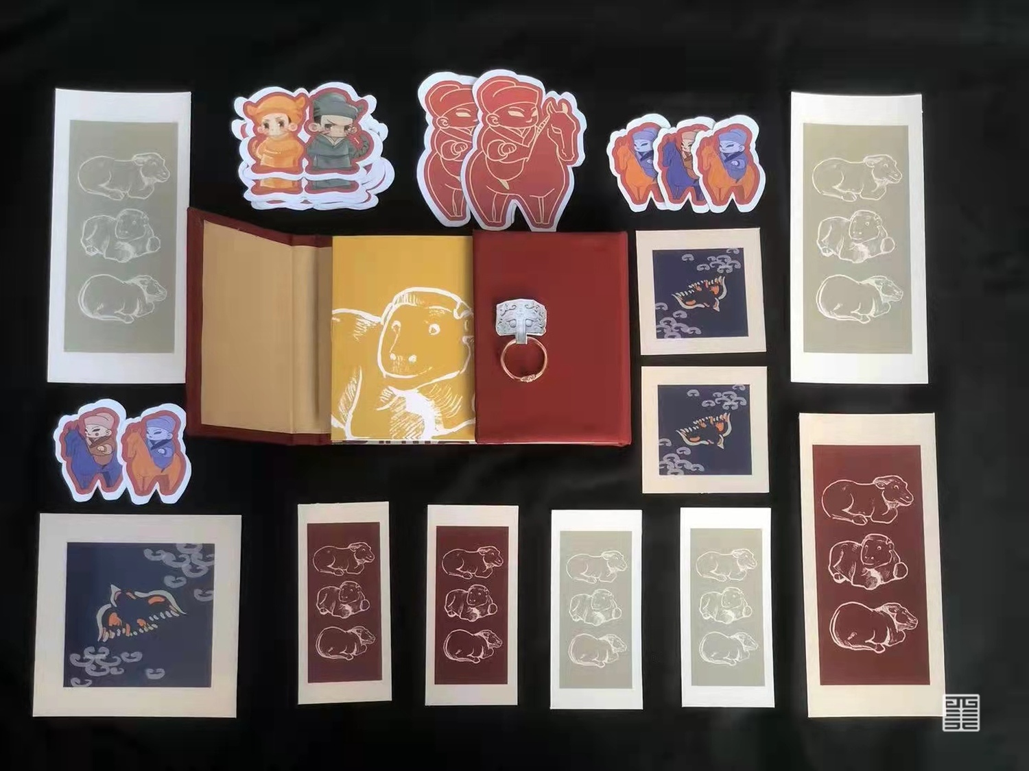 作品材质:飘金特种纸(主体书册),丝绵纸(书签&藏书卡),pvc板(书函),牛皮纸(书函),棉布(书函),金属环(书函),哑光不干胶(贴纸)