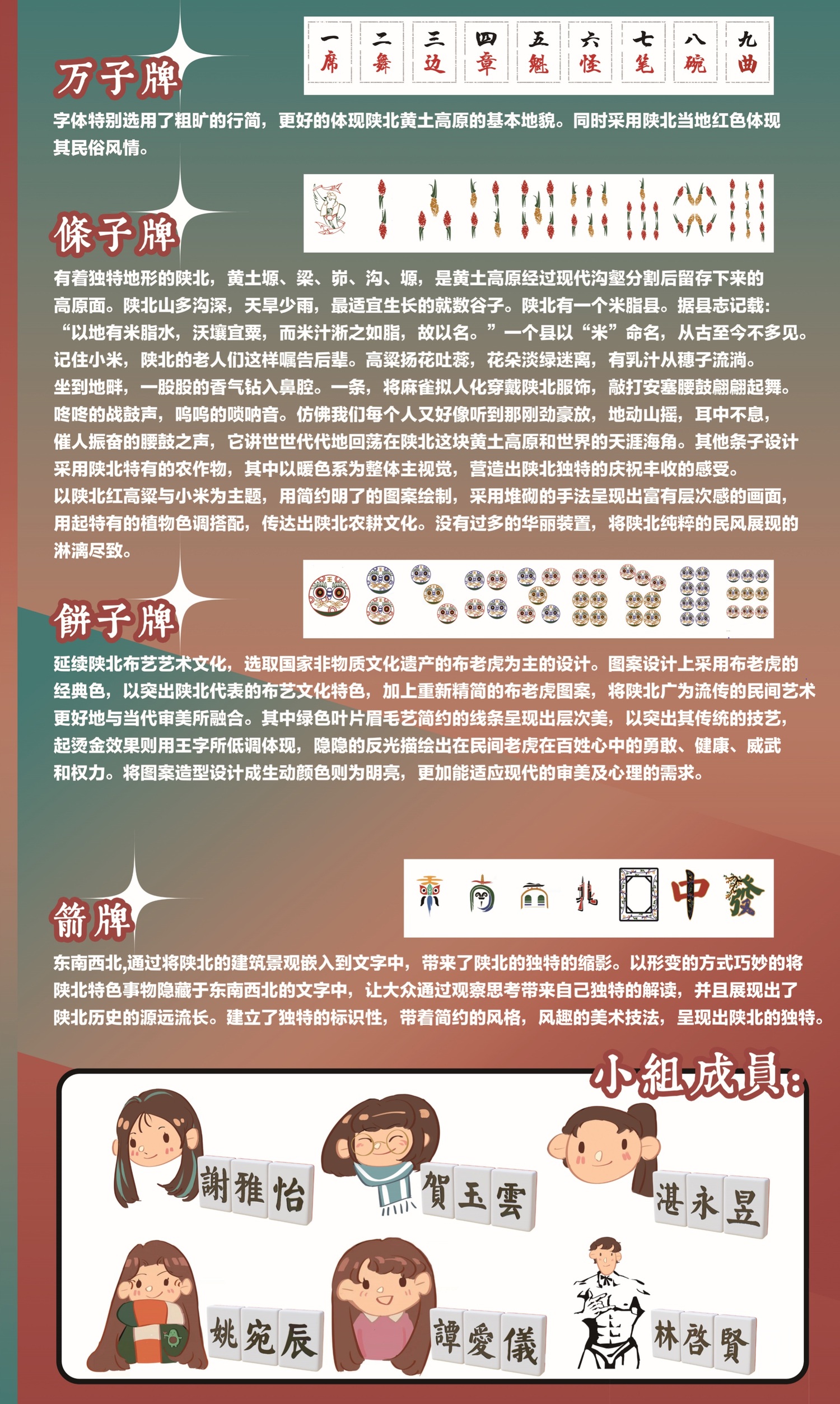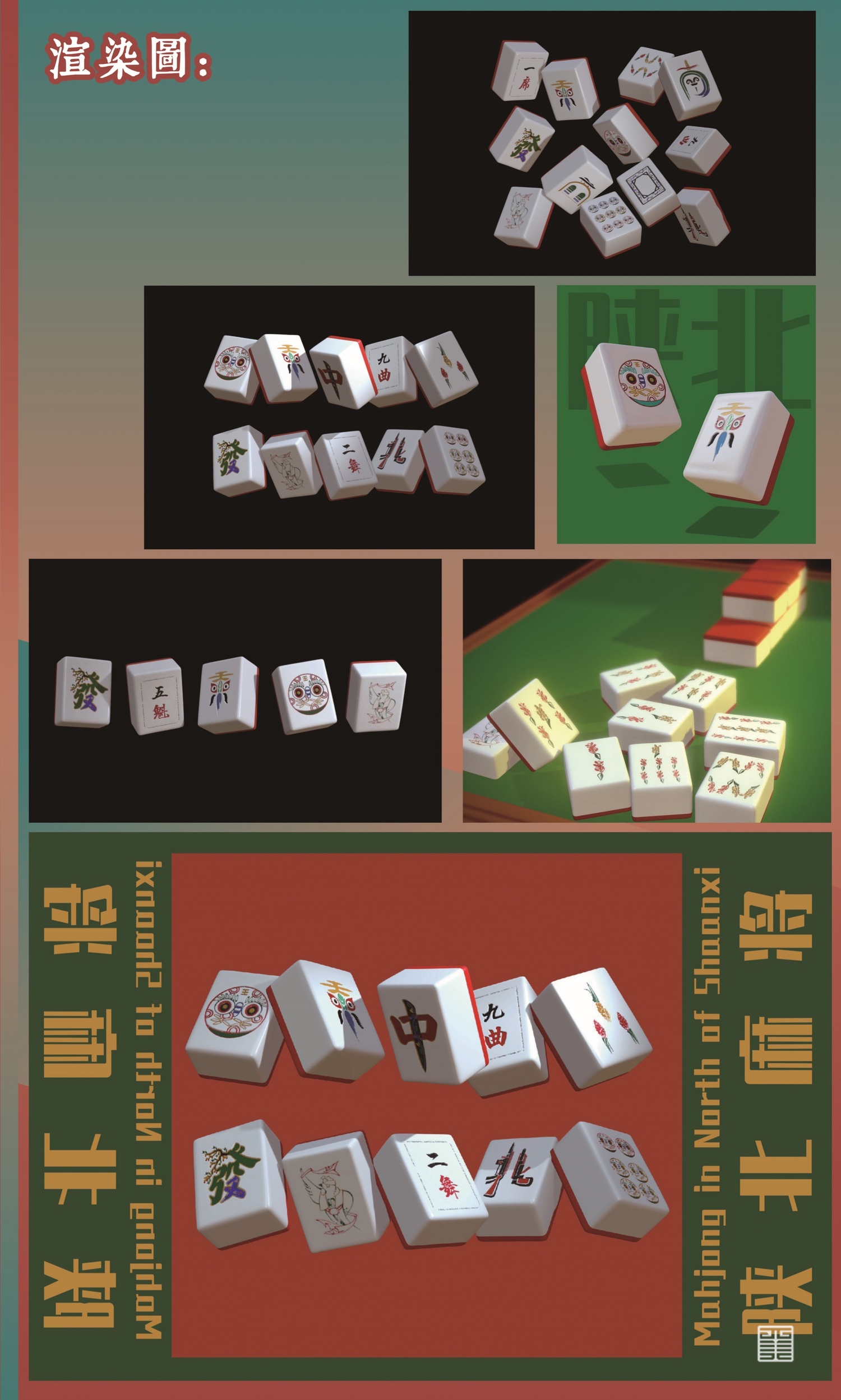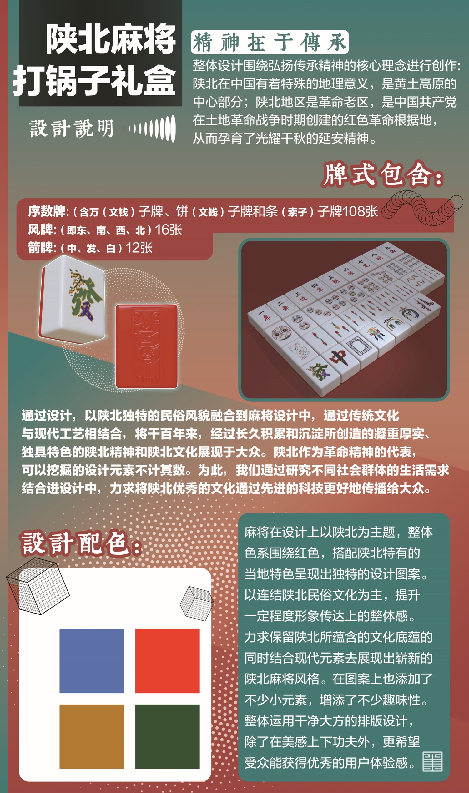 本次设计,以陕北独特的民俗风貌融合到麻将设计中,通过传统文化与现代工艺相结合,将千百年来,经过长久的积累和沉淀所创造的凝重厚实、独具特色的陕北精神和陕北文化展现于大众。陕北作为革命精神的代表,可以挖掘的设计元素不计其数。为此,我们通过研究不同社会群体的生活需求结合进行设计,从而更好的将陕北优秀的文化通过先进的科技传播于大众。