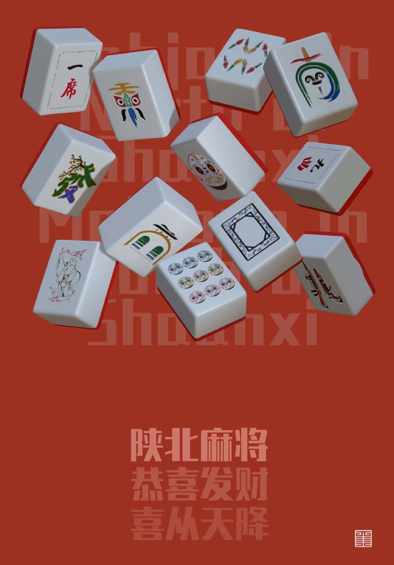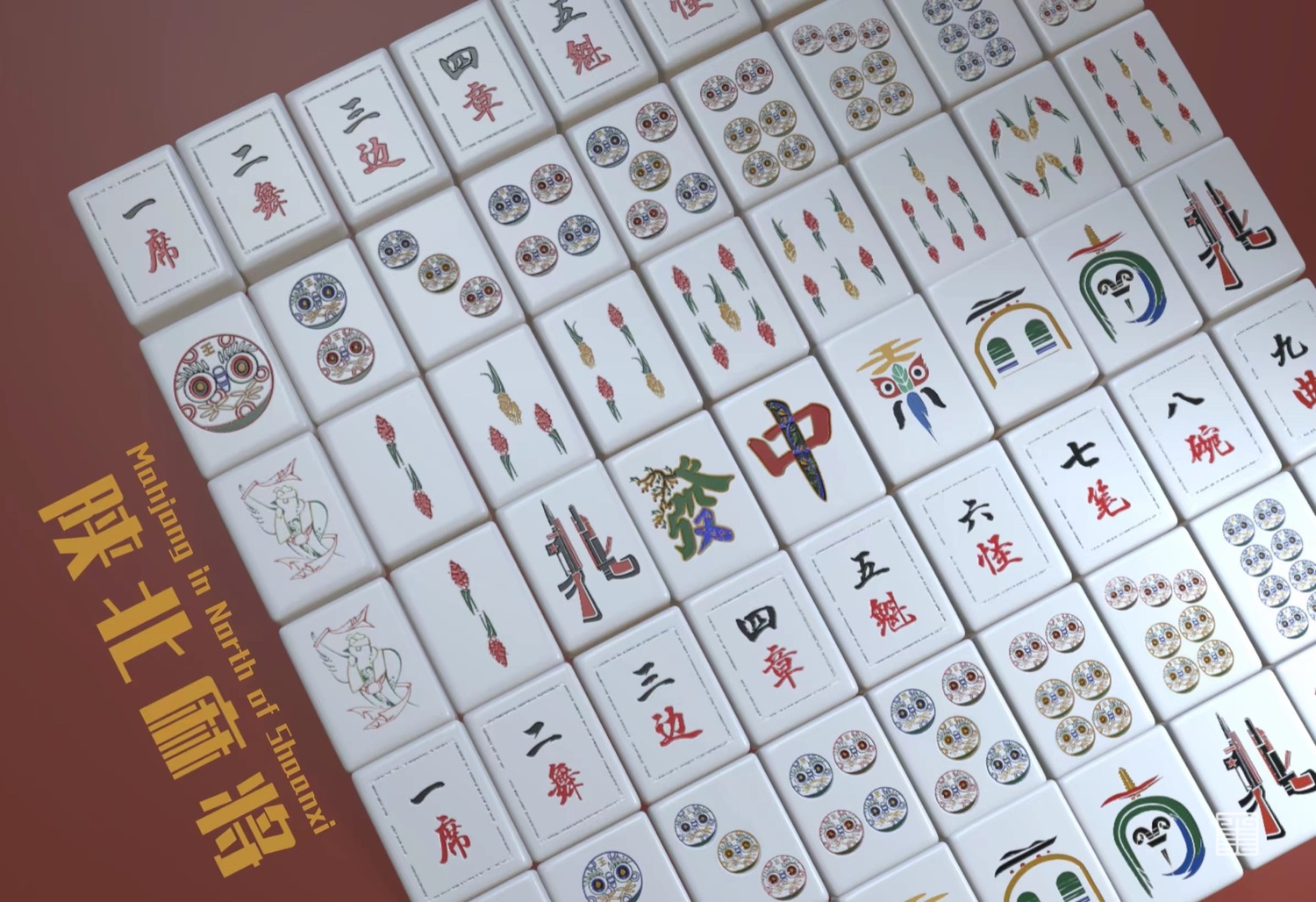 麻将在设计上以陕北为主题,整体色系围绕红色,搭配陕北特有的当地特色呈现出麻将独特的设计图案。以连结陕北民俗文化为主,提升一定程度形象传达上的整体感。力求保留陕北所蕴含的文化底蕴的同时更能结合现代元素展现出崭新的陕北麻将风格。在图案上也添加了不少小元素,增添起趣味性。整体运用干净大方的排版设计,除了在美感上下功夫外,更希望受众能获得优秀的用户体验感。