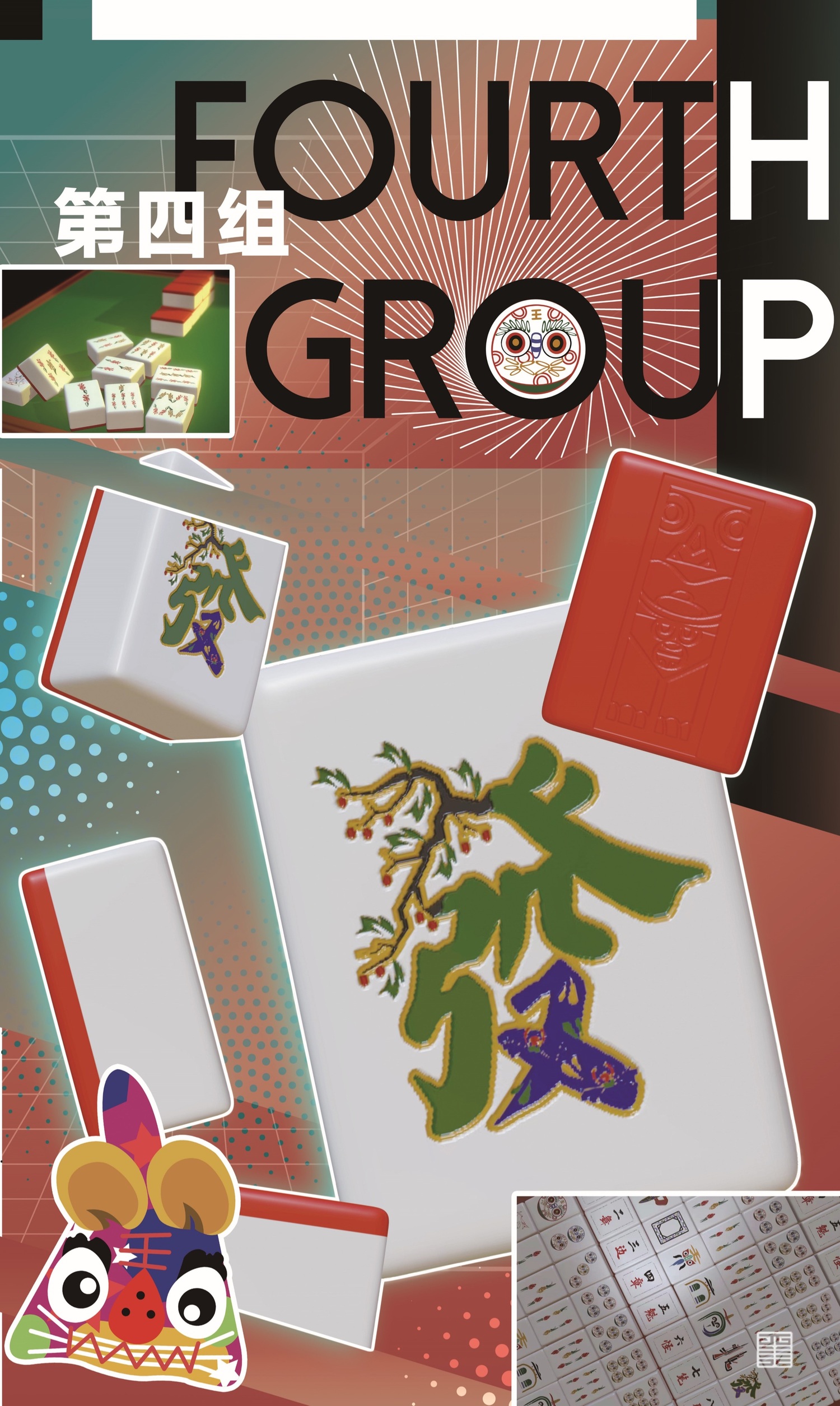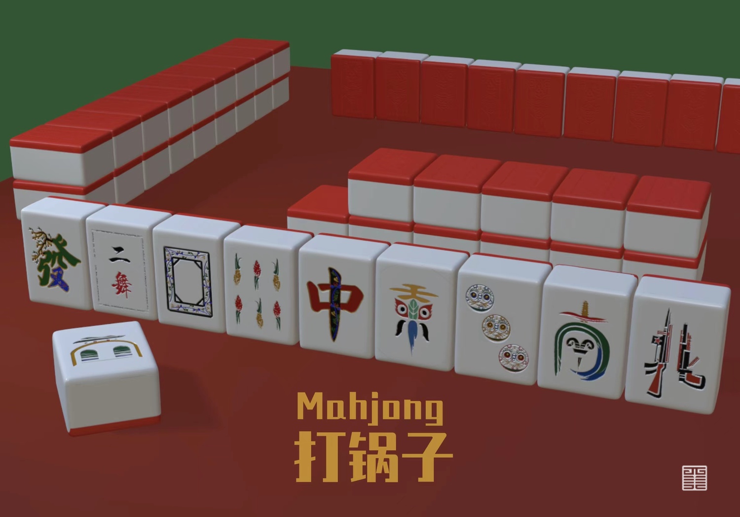 箭牌:中,发,白。三款麻将以陕北文化为主题,结合代表陕北剪纸艺术风格的图腾纹样,将陕北朴实无华的民土风情融入其中。温润的底色搭配简单的文字及图案,采用低调的描边烫金更好的识别出文字让用户更容易识别牌式。以富有独特魅力的纹样与中国文字做结合,刻意的将纹样隐藏于文字中,更好的呼应了陕北特色与中国文化之间的连结。通过图腾的再转换,将三款麻将排面更为统一。