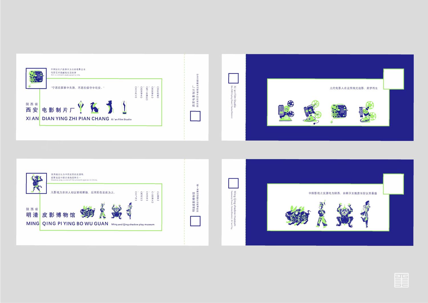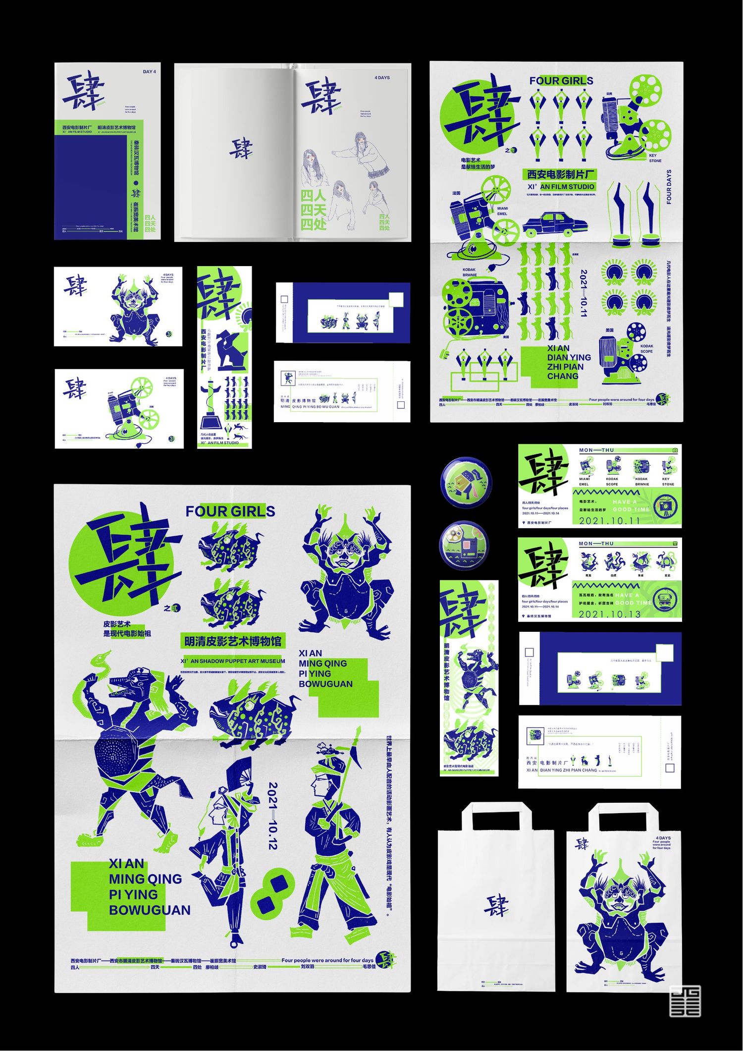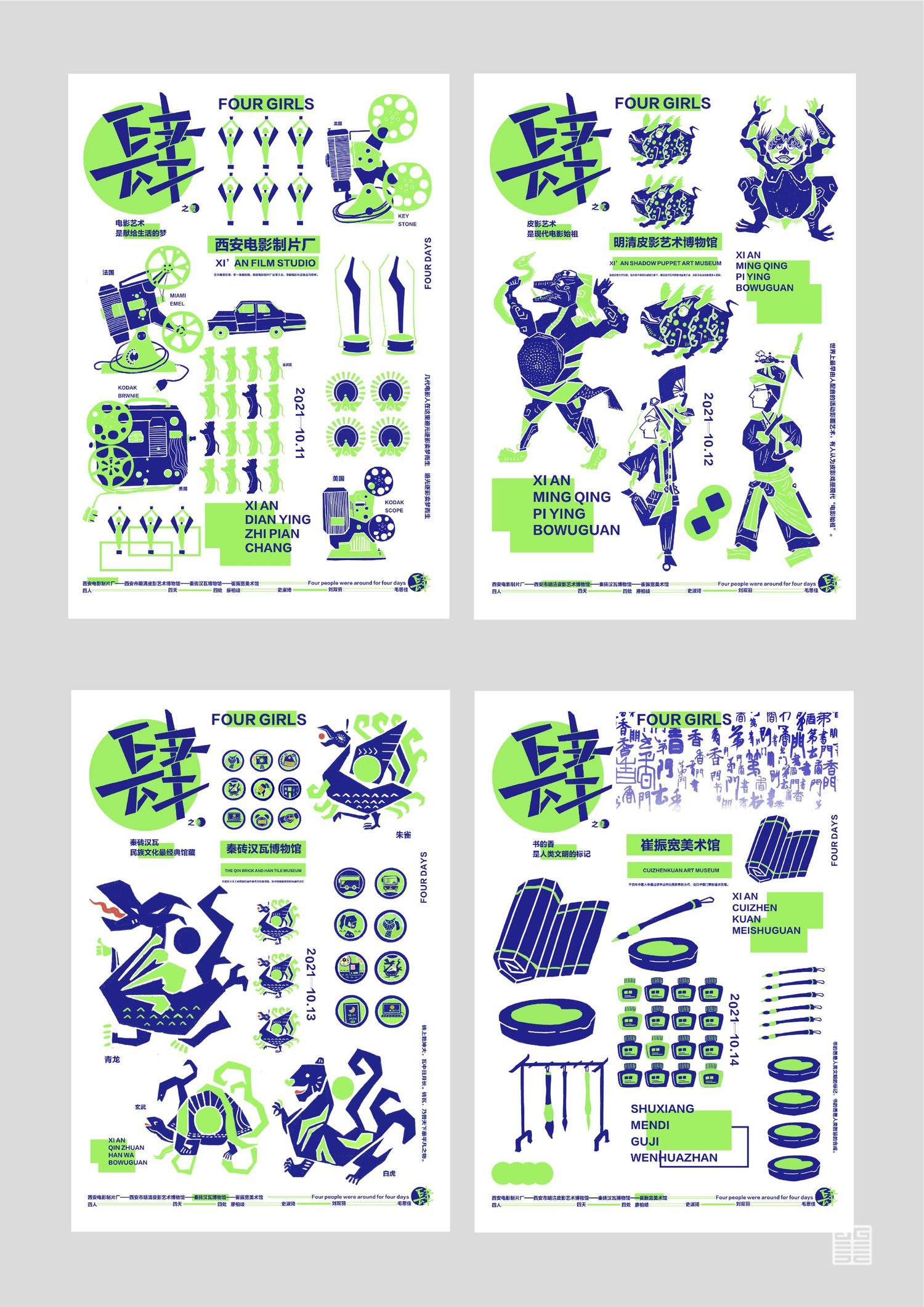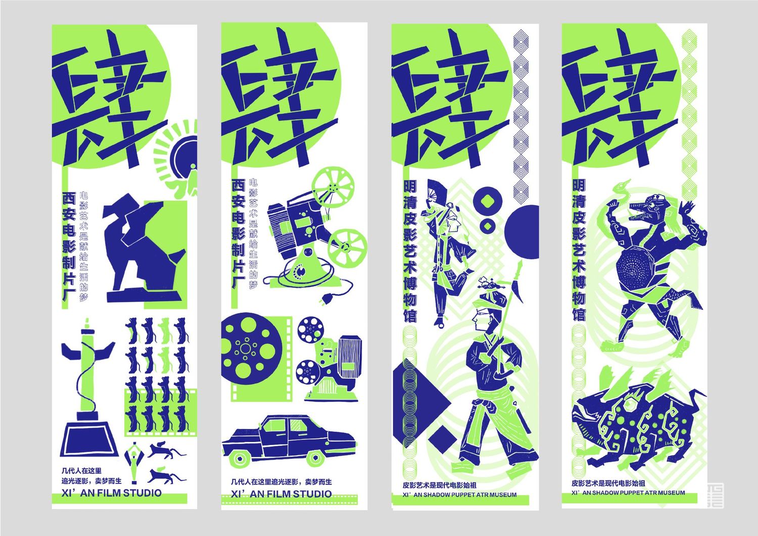作品源自写生考察中的所见所闻所想。写生四天分别去到西安电影制片厂、秦砖汉瓦博物馆、明清皮影艺术博物馆、崔振宽美术馆这四个地方,通过设计手法几何提炼出带有设计感的图案,运用色彩构成平面构成等所学知识,赋予了这些带有厚重历史意味的地点以全新的形象和意义,使这段旅途变得更具仪式感,也使得这四天成为一段独家回忆。作品主体为四张海报和一本手册,衍生出明信片、书签、徽章等文创产品,旨在做出一套属于我们自己的品牌。值得一提的是,册中别出心裁地设计了许多小机关,可以和观看的人进行互动,增强趣味性。