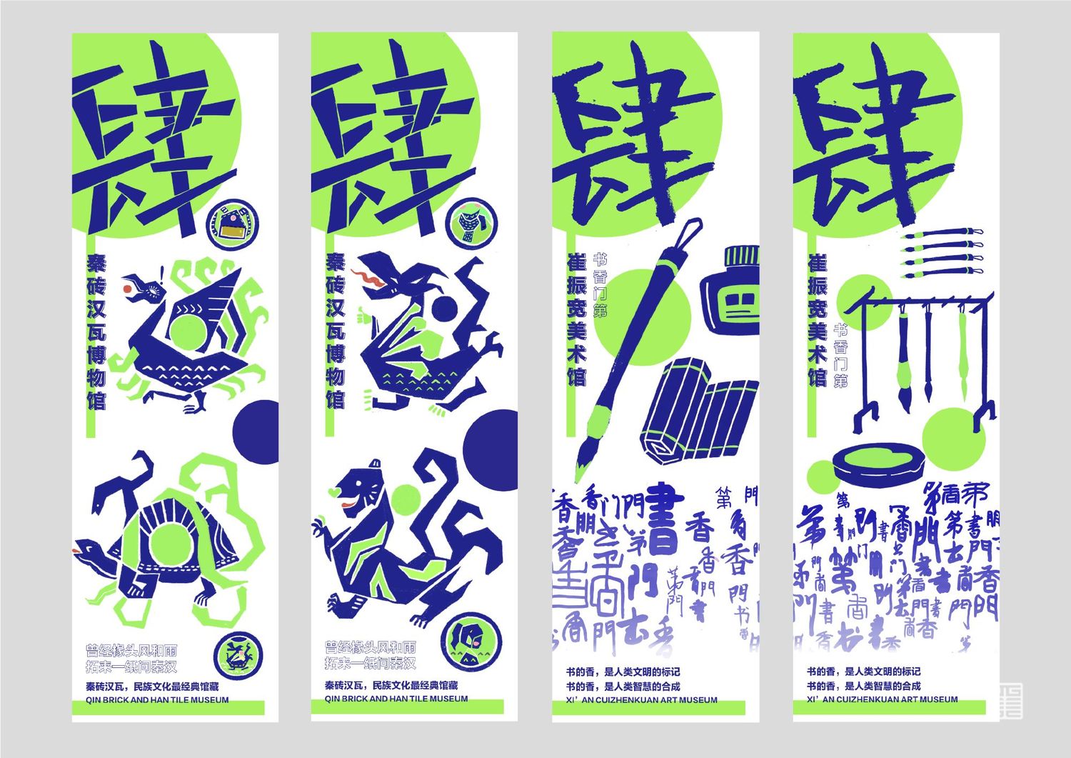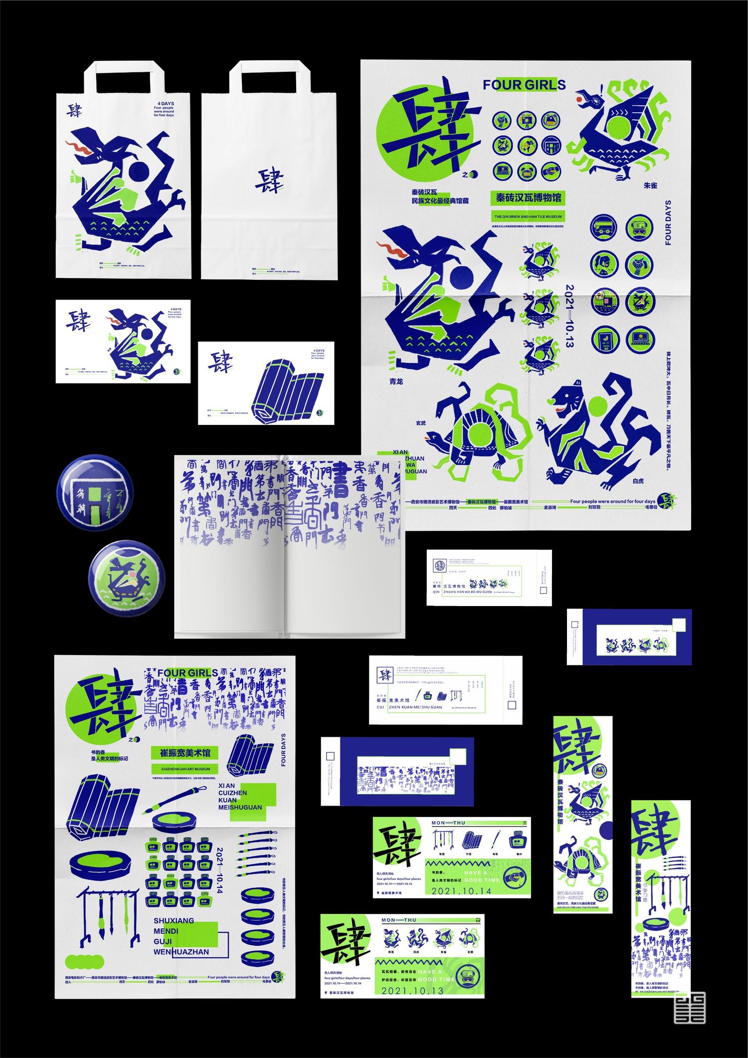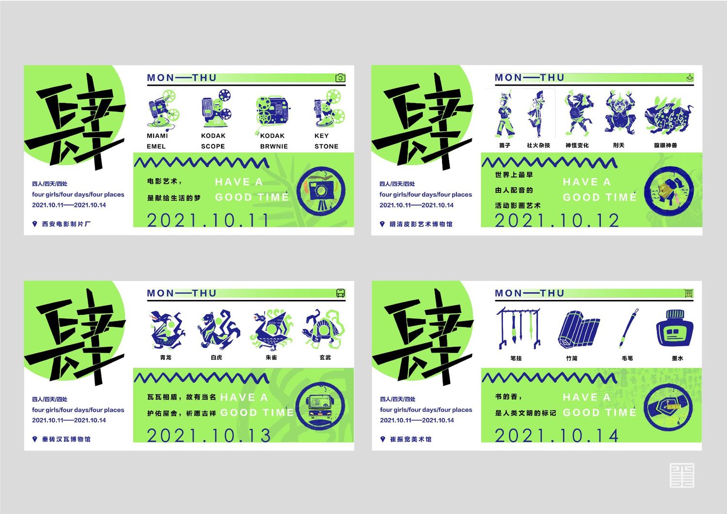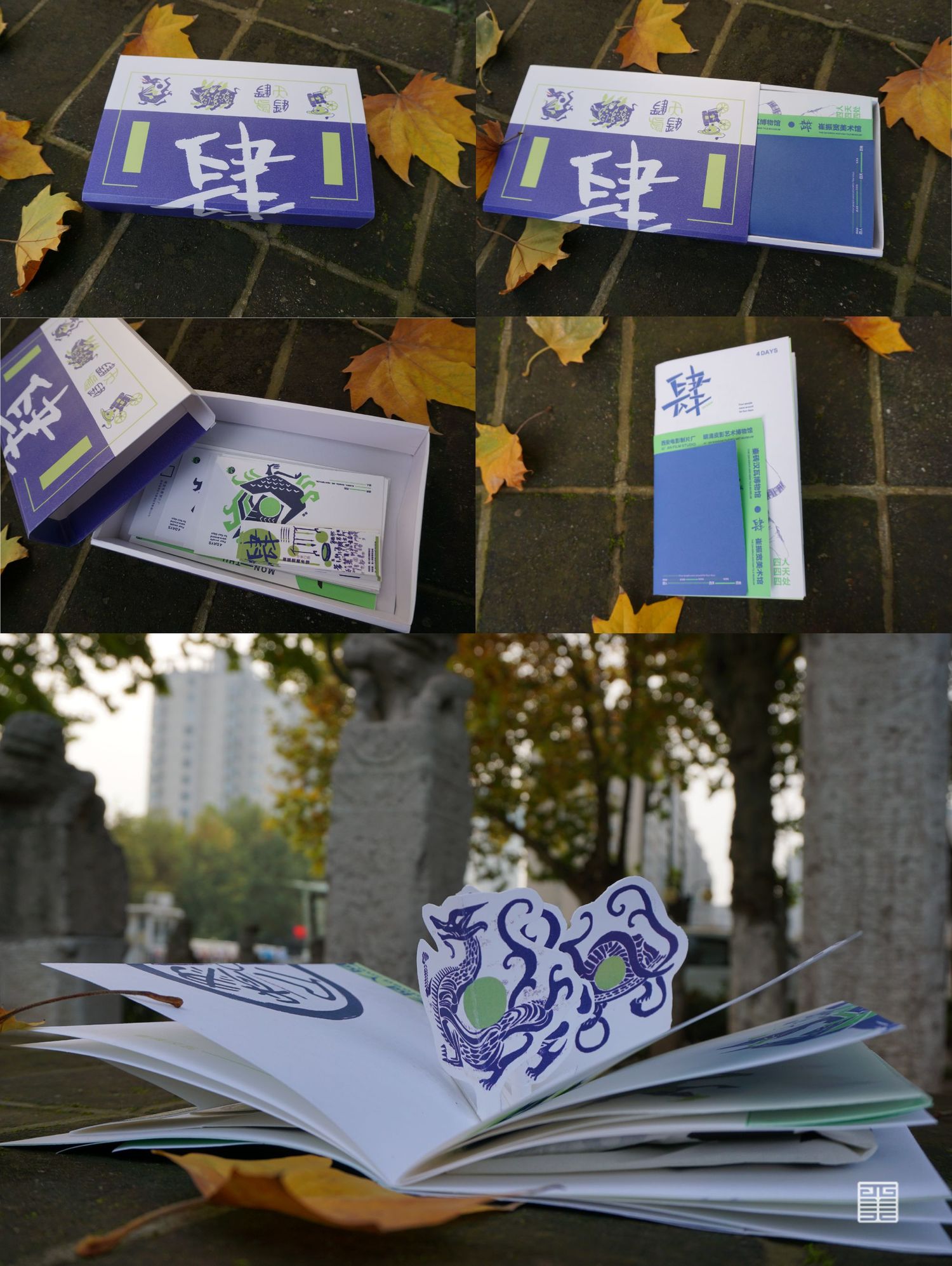 作品源自写生考察中的所见所闻所想。写生四天分别去到西安电影制片厂、秦砖汉瓦博物馆、明清皮影艺术博物馆、崔振宽美术馆这四个地方,通过设计手法几何提炼出带有设计感的图案,运用色彩构成平面构成等所学知识,赋予了这些带有厚重历史意味的地点以全新的形象和意义,使这段旅途变得更具仪式感,也使得这四天成为一段独家回忆。作品主体为四张海报和一本手册,衍生出明信片、书签、徽章等文创产品,旨在做出一套属于我们自己的品牌。值得一提的是,册中别出心裁地设计了许多小机关,可以和观看的人进行互动,增强趣味性。