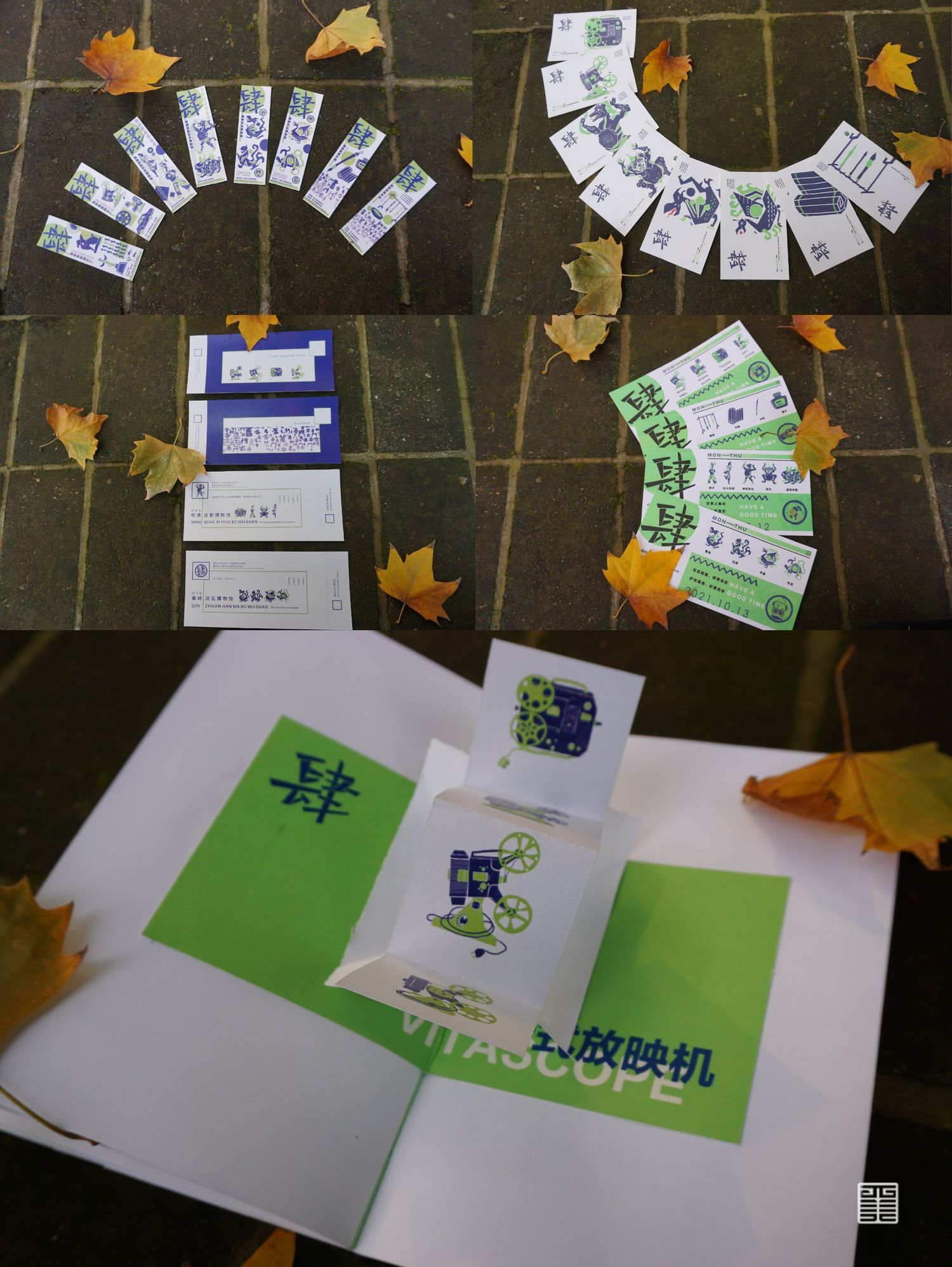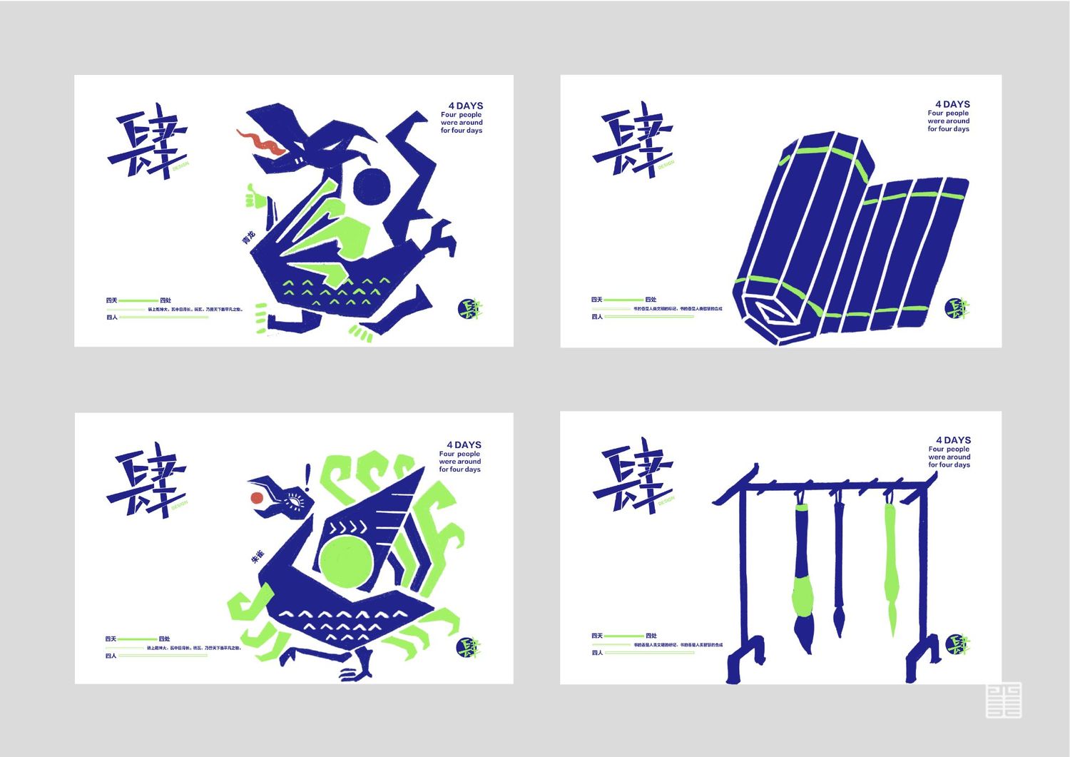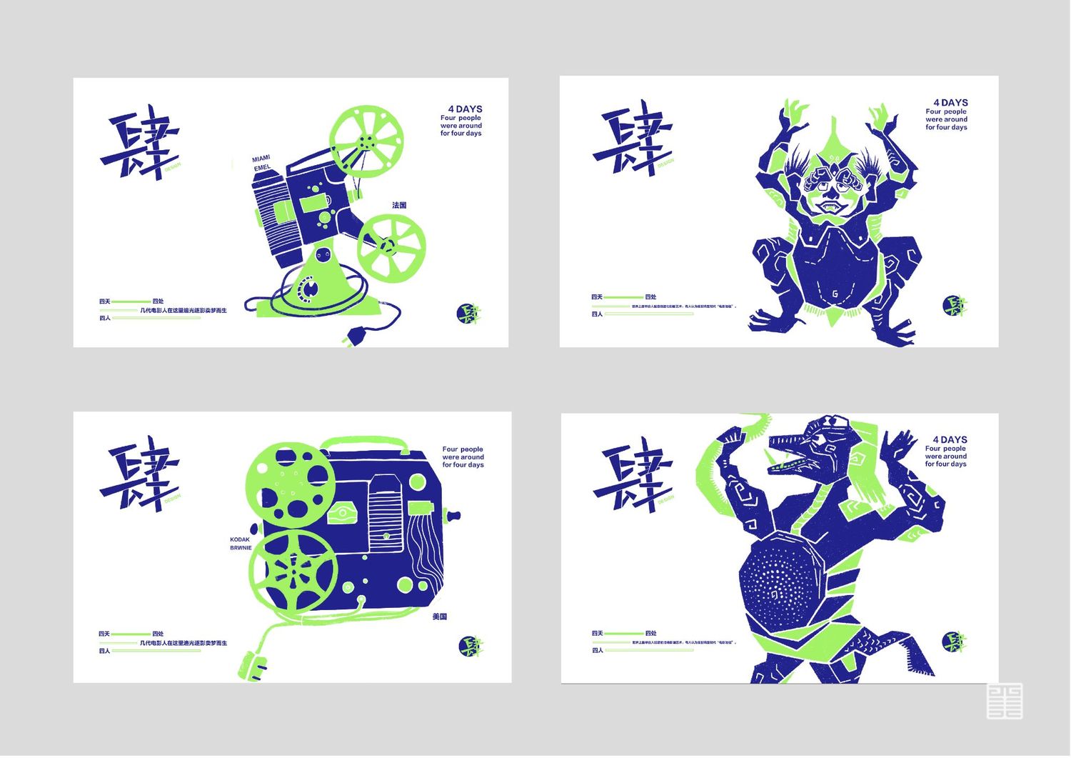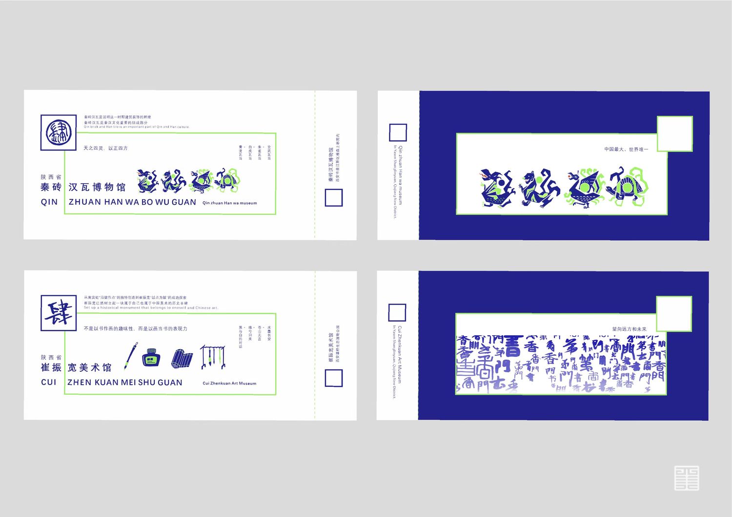 作品源自写生考察中的所见所闻所想。写生四天分别去到西安电影制片厂、秦砖汉瓦博物馆、明清皮影艺术博物馆、崔振宽美术馆这四个地方,通过设计手法几何提炼出带有设计感的图案,运用色彩构成平面构成等所学知识,赋予了这些带有厚重历史意味的地点以全新的形象和意义,使这段旅途变得更具仪式感,也使得这四天成为一段独家回忆。作品主体为四张海报和一本手册,衍生出明信片、书签、徽章等文创产品,旨在做出一套属于我们自己的品牌。值得一提的是,册中别出心裁地设计了许多小机关,可以和观看的人进行互动,增强趣味性。
