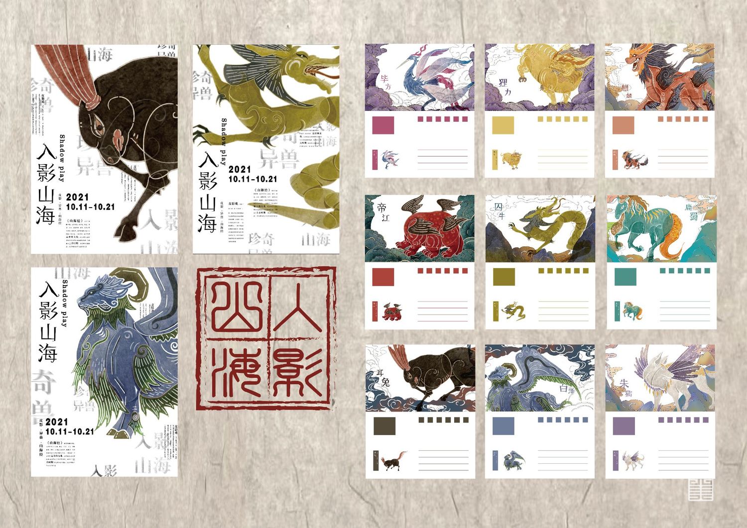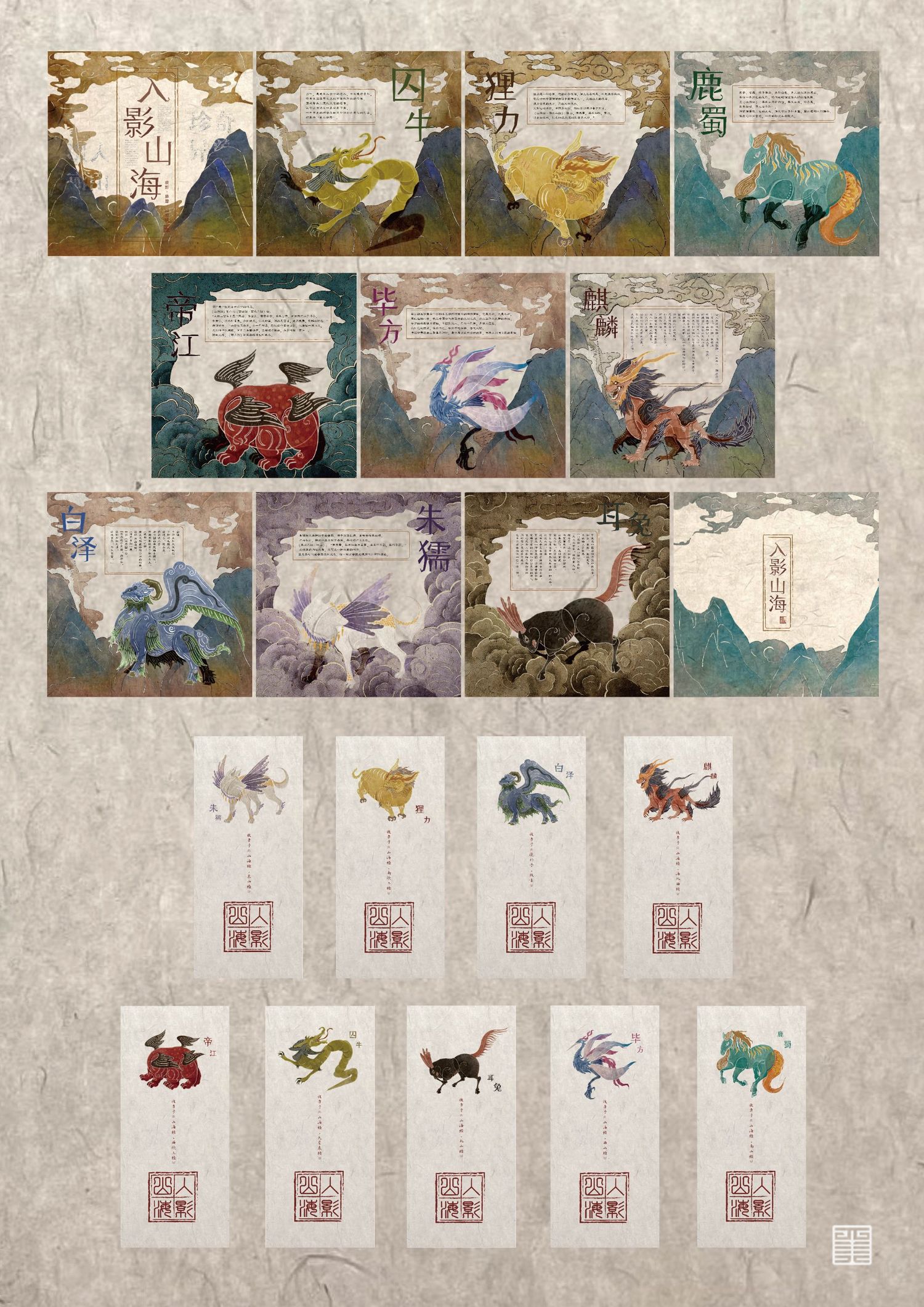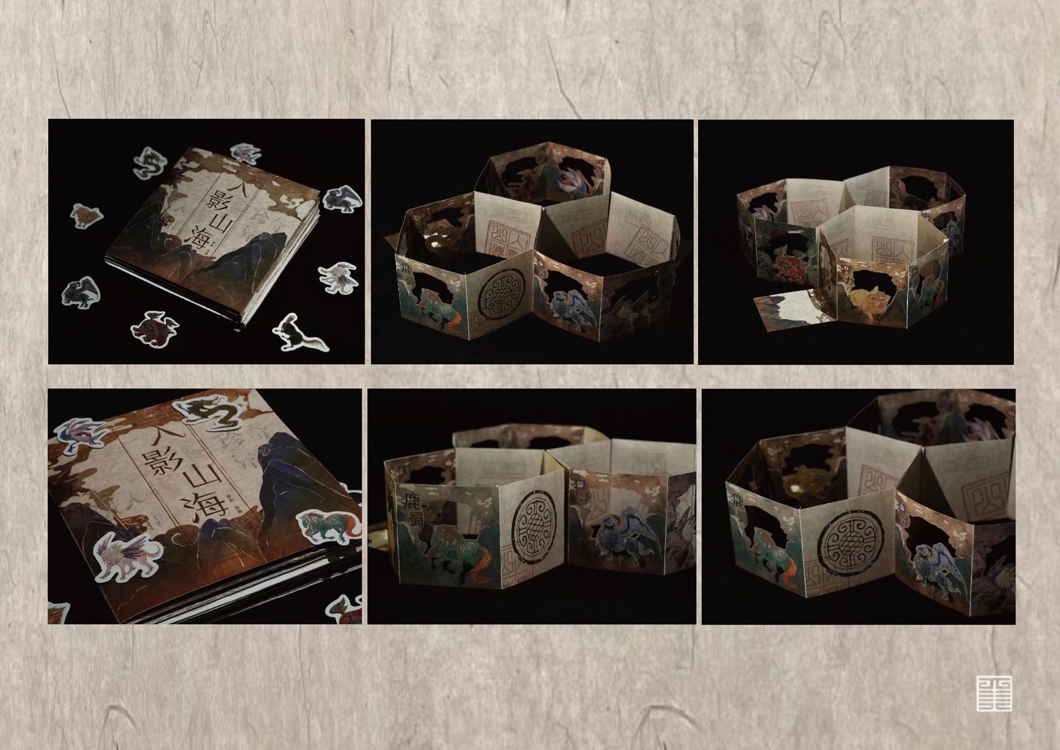 此作品是由本组成员结合在考察期间所观所感所学,通过思考最后选取皮影部分为主视觉进行创作。作品的灵感来源主要是我们在陕西皮影馆中所见的奇特小怪,通过联想,延伸至《山海经》中的九只异兽,以插画的形式,吸收陕西皮影的特点,再加以创新的色彩,设计出主形象以及背景,点缀以从秦砖汉瓦中提取出的瓦当纹样的元素,融合字体设计、版式编排等专业知识,将这些元素进行结合、设计、创作。作品最终以立体册子、海报、动画视频的形式呈现,辅助以书签、明信片等衍生品。本作品旨在向观众展示陕西皮影的文化魅力,传播中华传统文化。