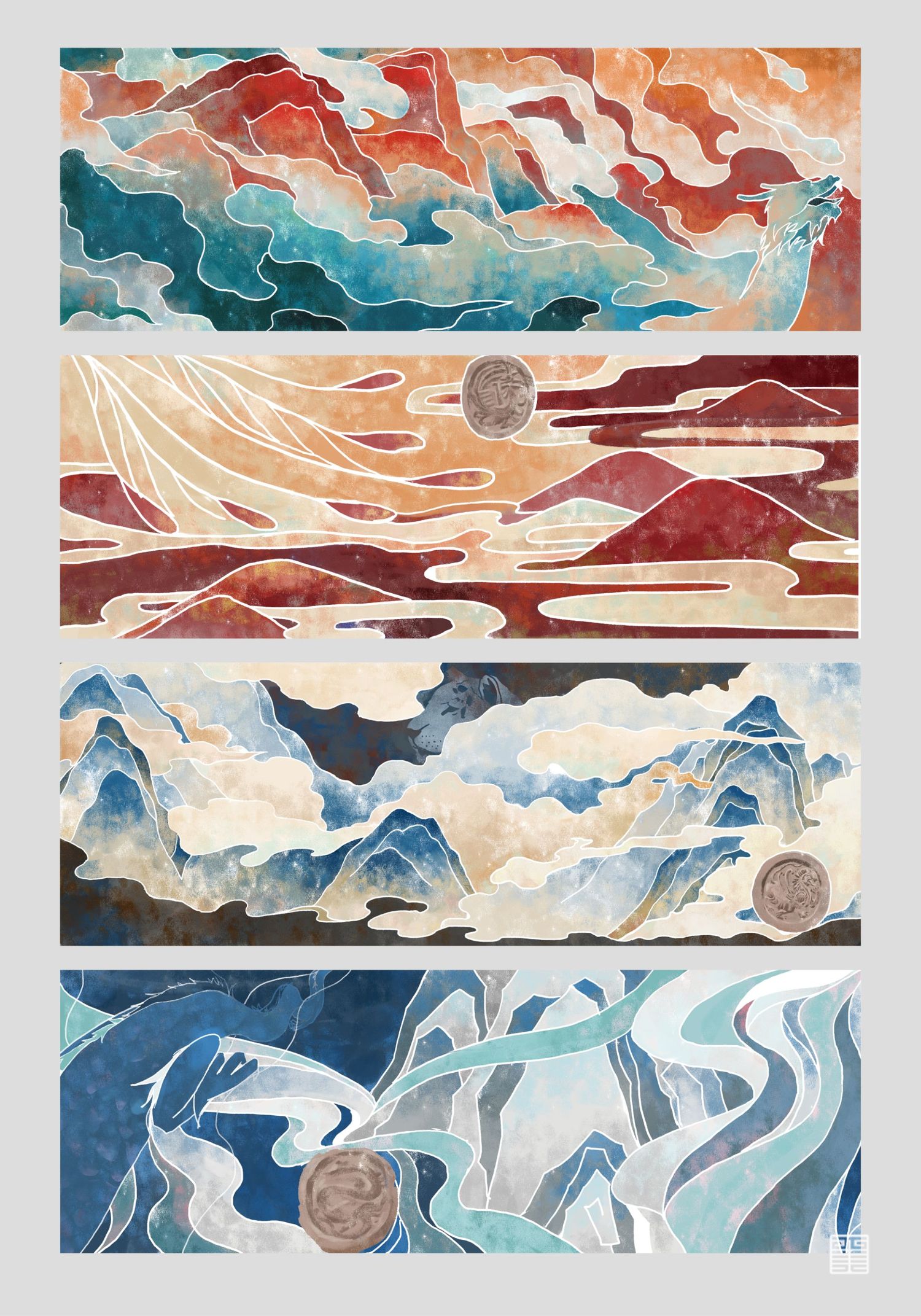 屋檐最前端的瓦当,鲜有人留意。自然也就少有人知“秦砖汉瓦”中的“瓦”,其实指秦汉建筑艺术中的精髓——瓦当。本作品包含海报、折页、插画、卡片等多种形式,将纹样更好的融入到现代,甚至进行演化、变动,将四神的故事完美地融合进作品中: