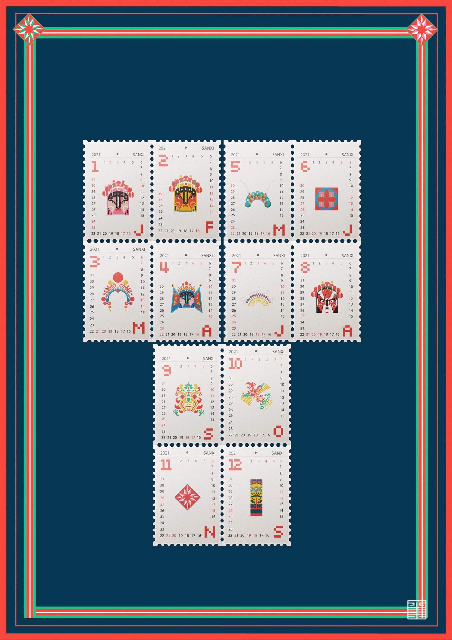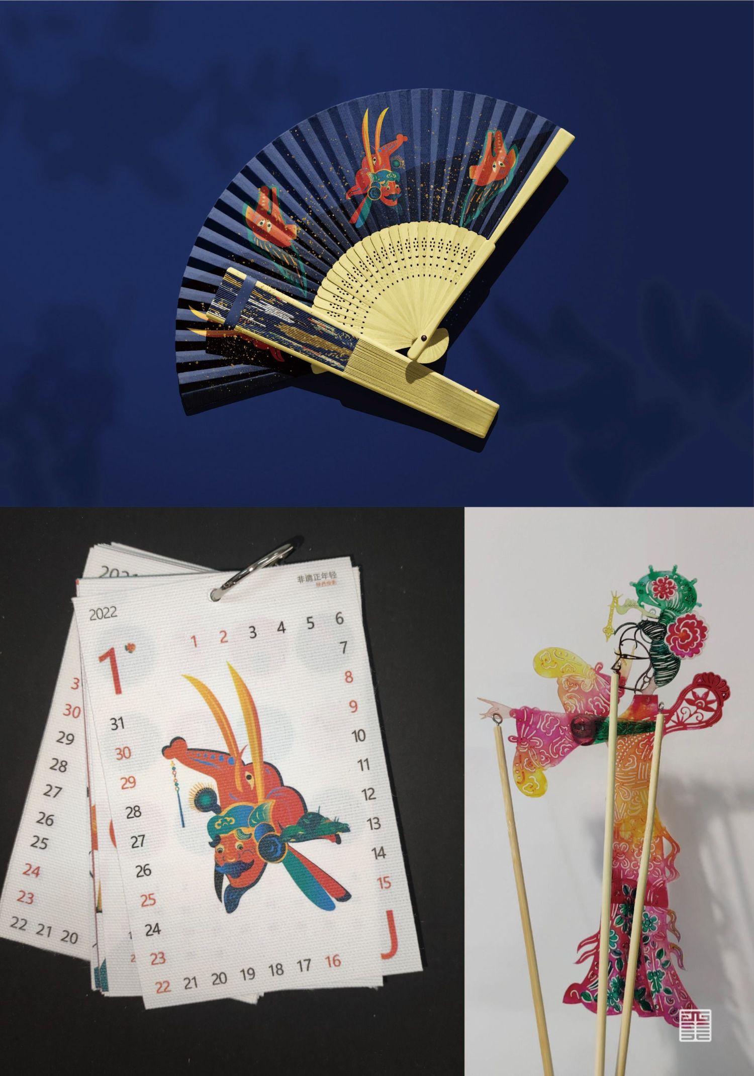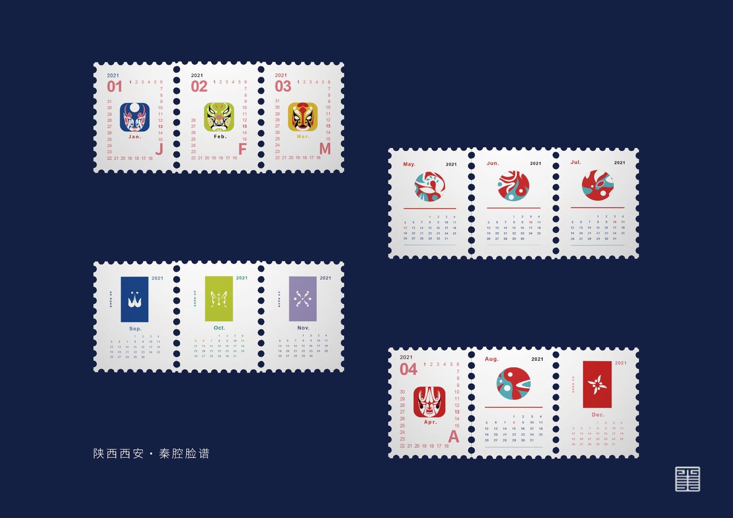 这次的创作形式有海报、日历、邮票、扇子、贴纸以及自己参与涂色制作的皮影,这次作品不只是学校的一次考察课作业,也让我们小组近距离体会到了非物质文化遗产的魅力,主要的创作方式是对于陕西皮影、秦腔、京剧(脸谱)的一些代表或者突出性特征进行整理、解构再用相对前卫的语言表达出来,希望能够倡导年轻人给予非物质文化遗产关注并积极的去发展。