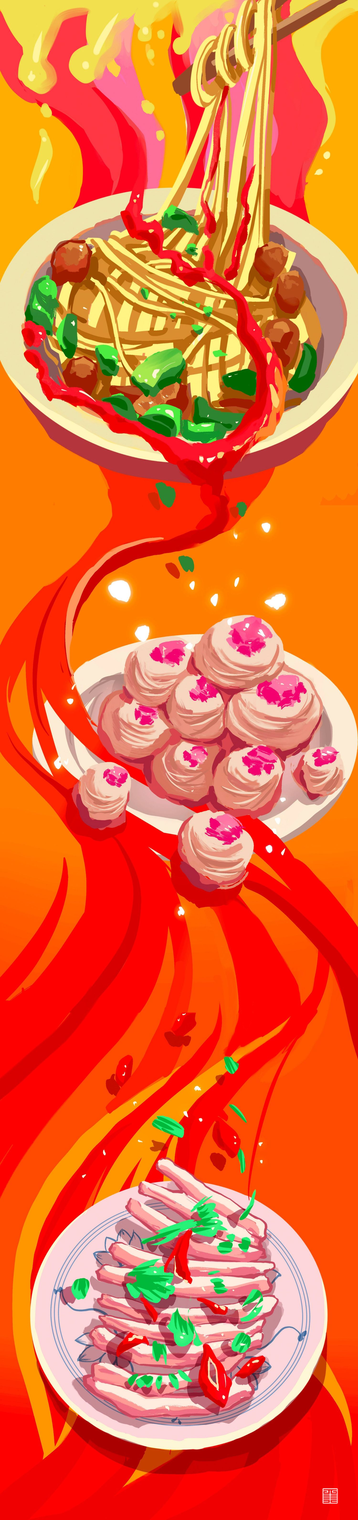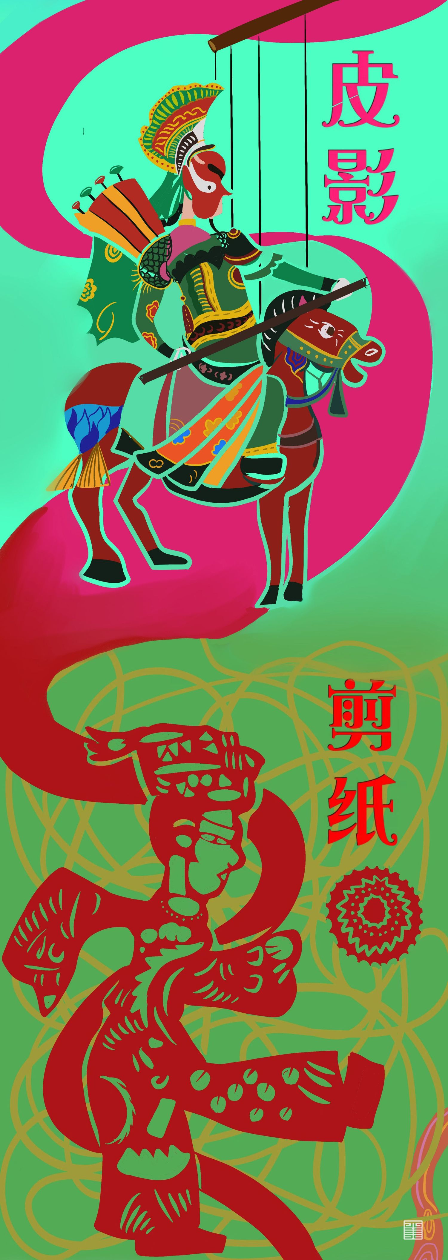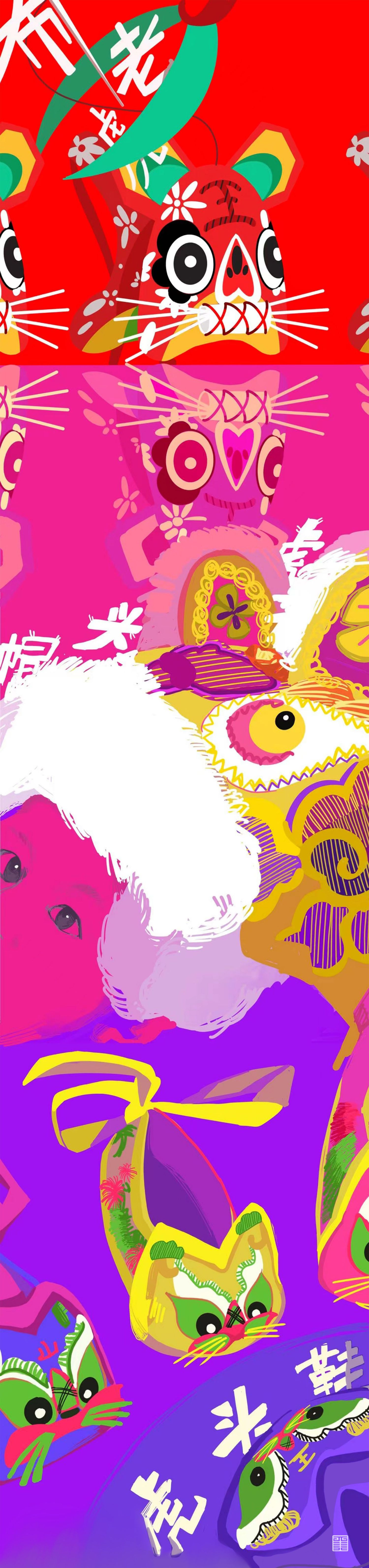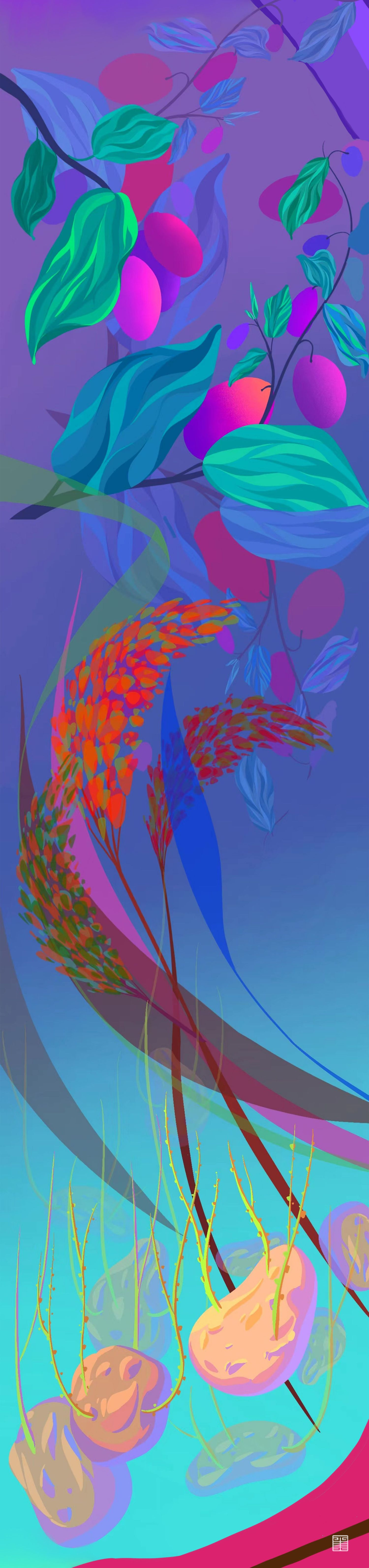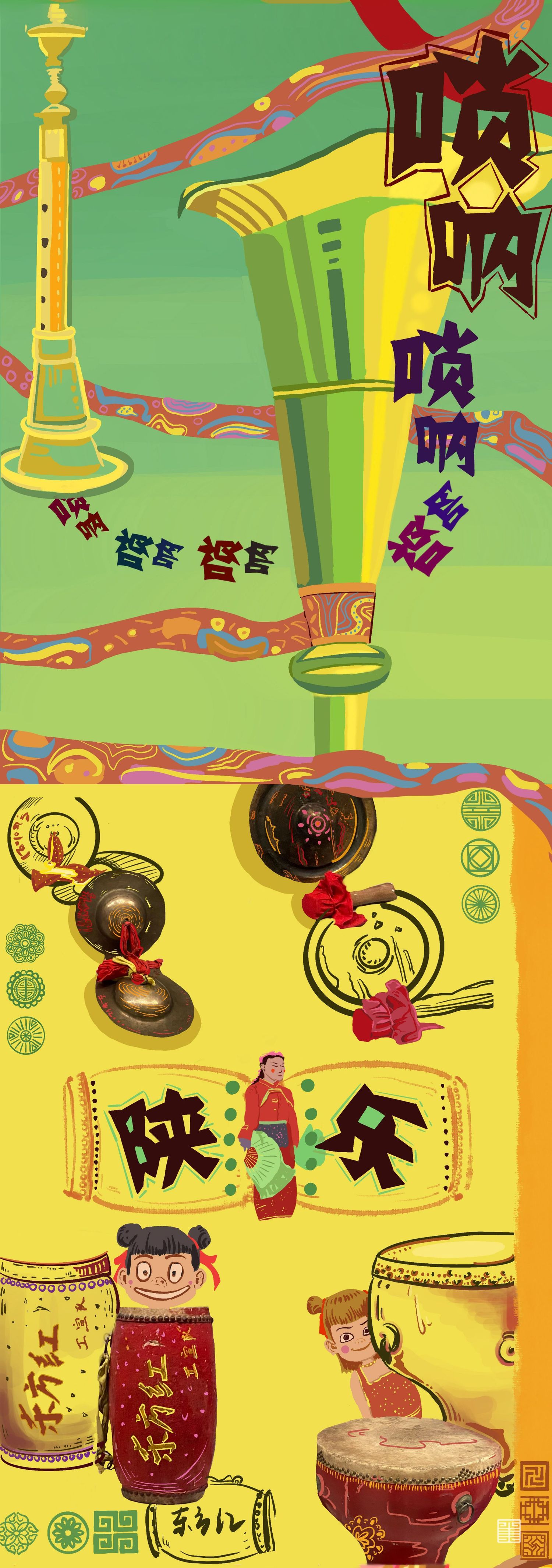 作品使用了长条作画颜色渐变的手法,通过颜色的冷暖,色相变化表现了陕北的特色人文民俗、庄稼、乐器、文化和美食。