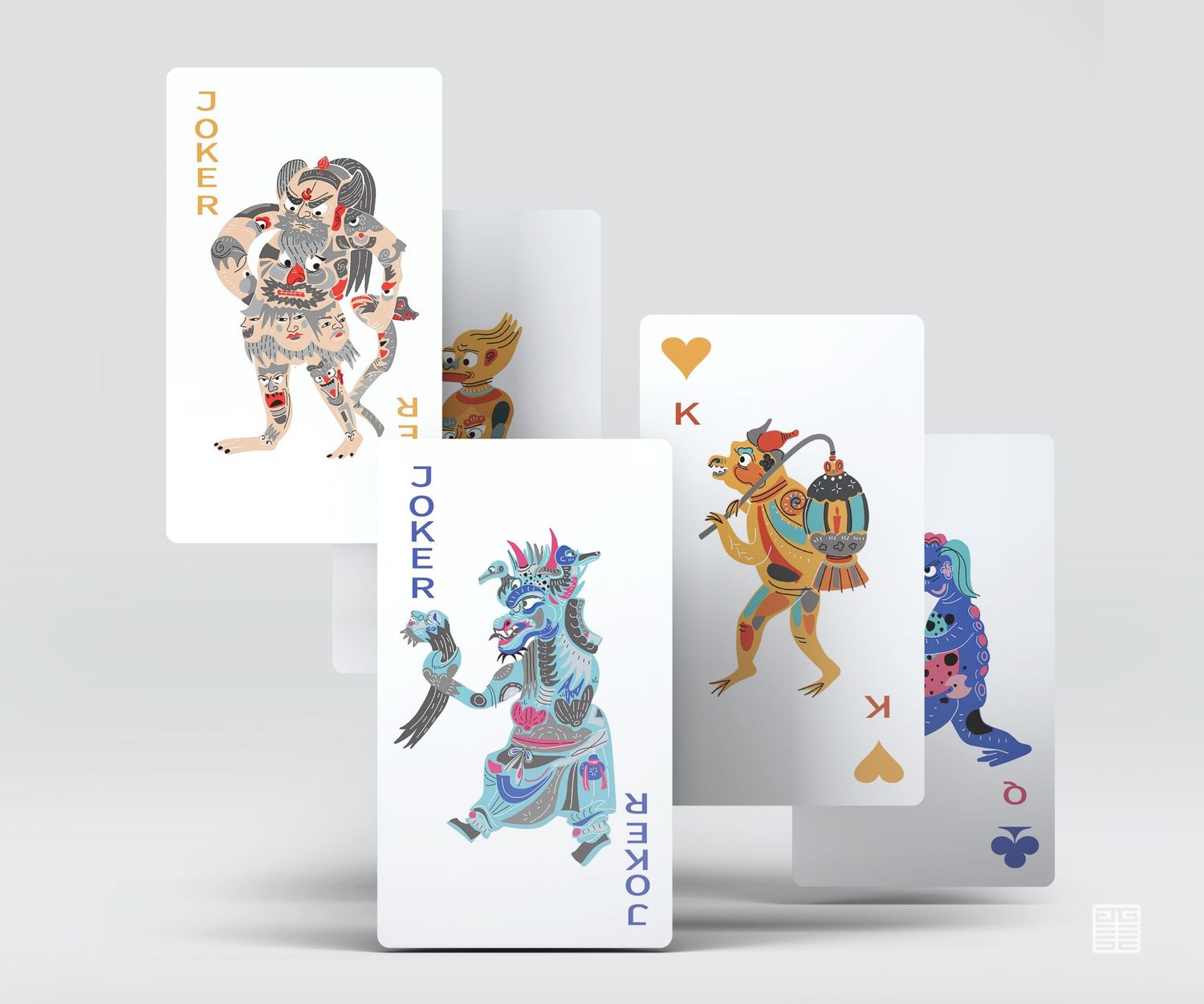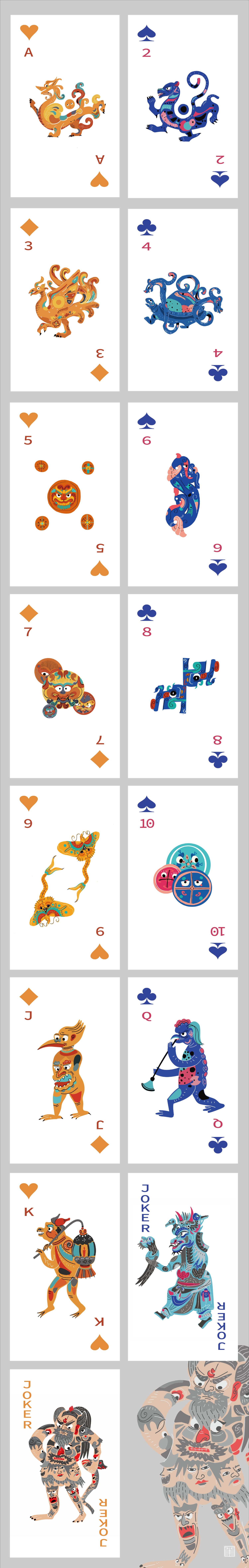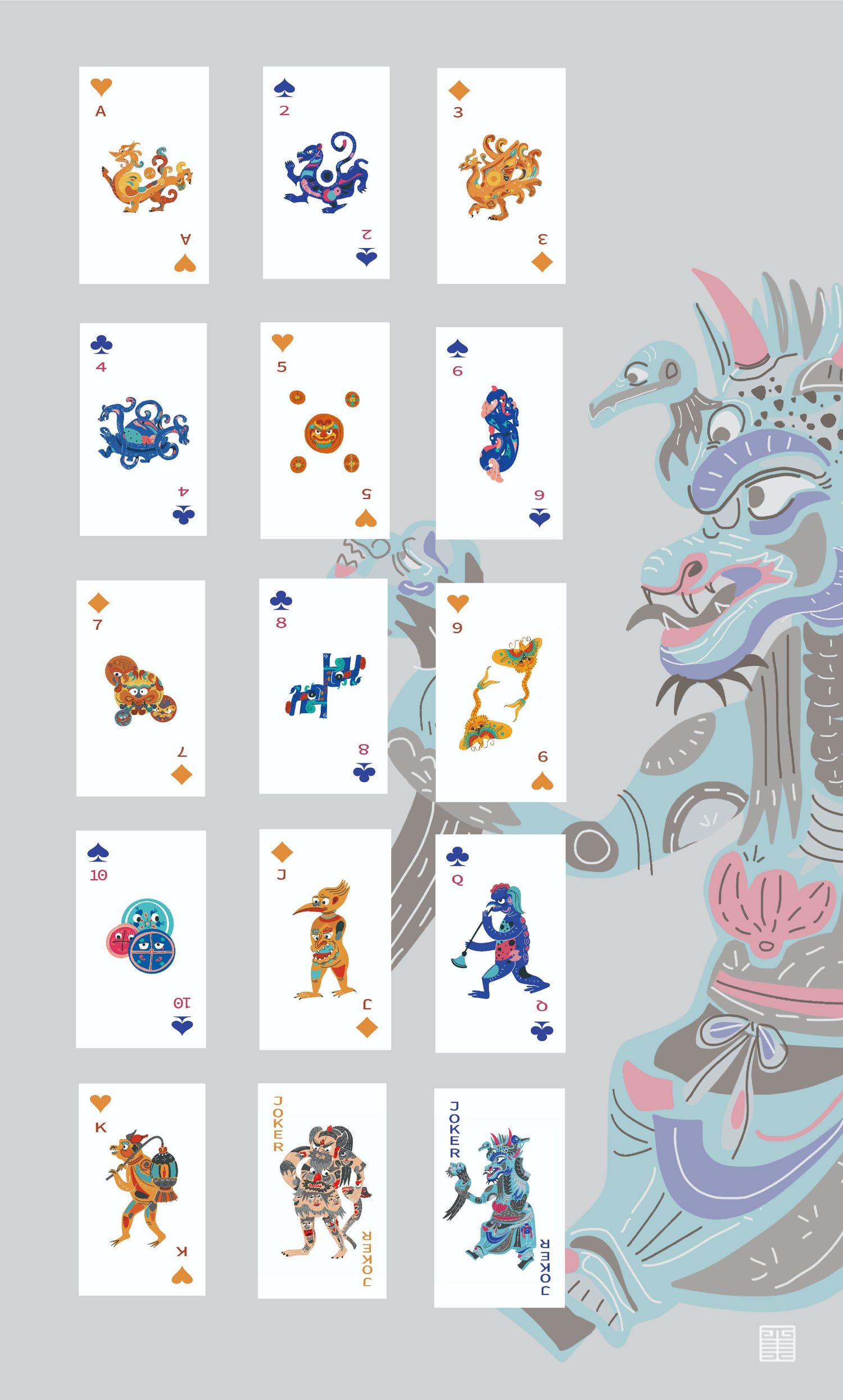 以扑克牌为载体,秦砖汉瓦博物馆及西安明清皮影艺术博物馆中生动的造型为原型创作。有趣的形态,结合以往课程提供的构成基础,提炼相关元素加以创作,制作出以“怪”为题的小插画文创。