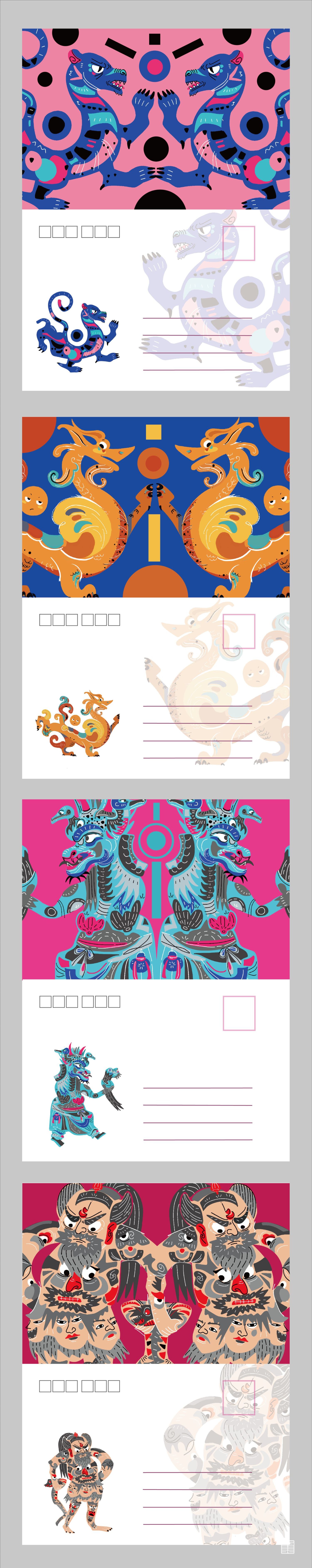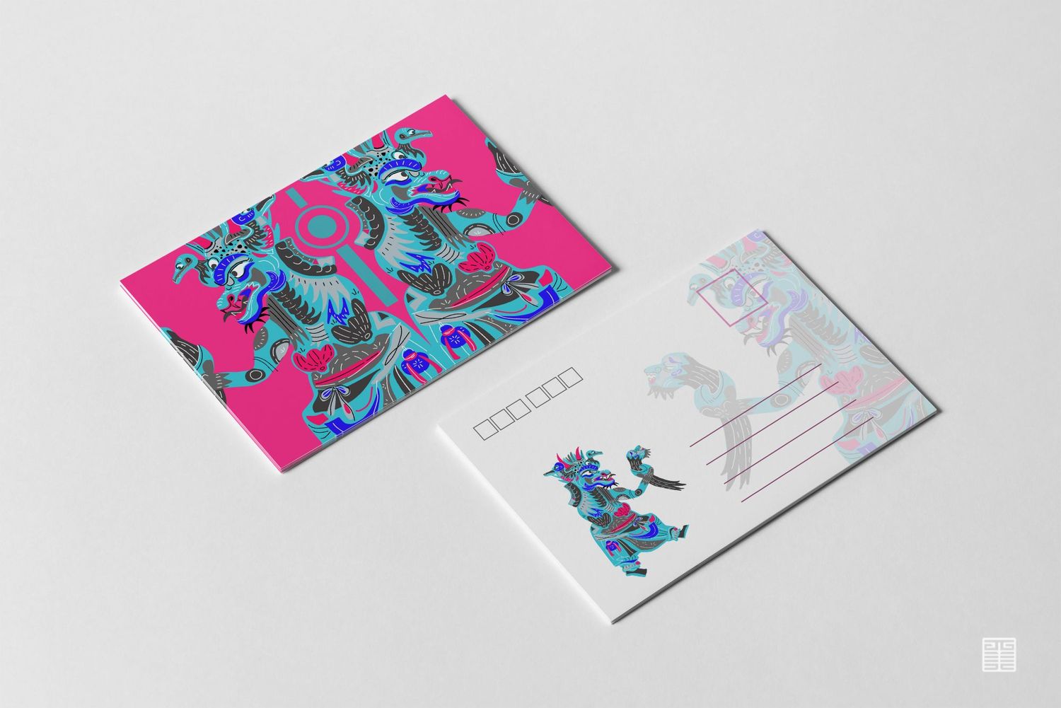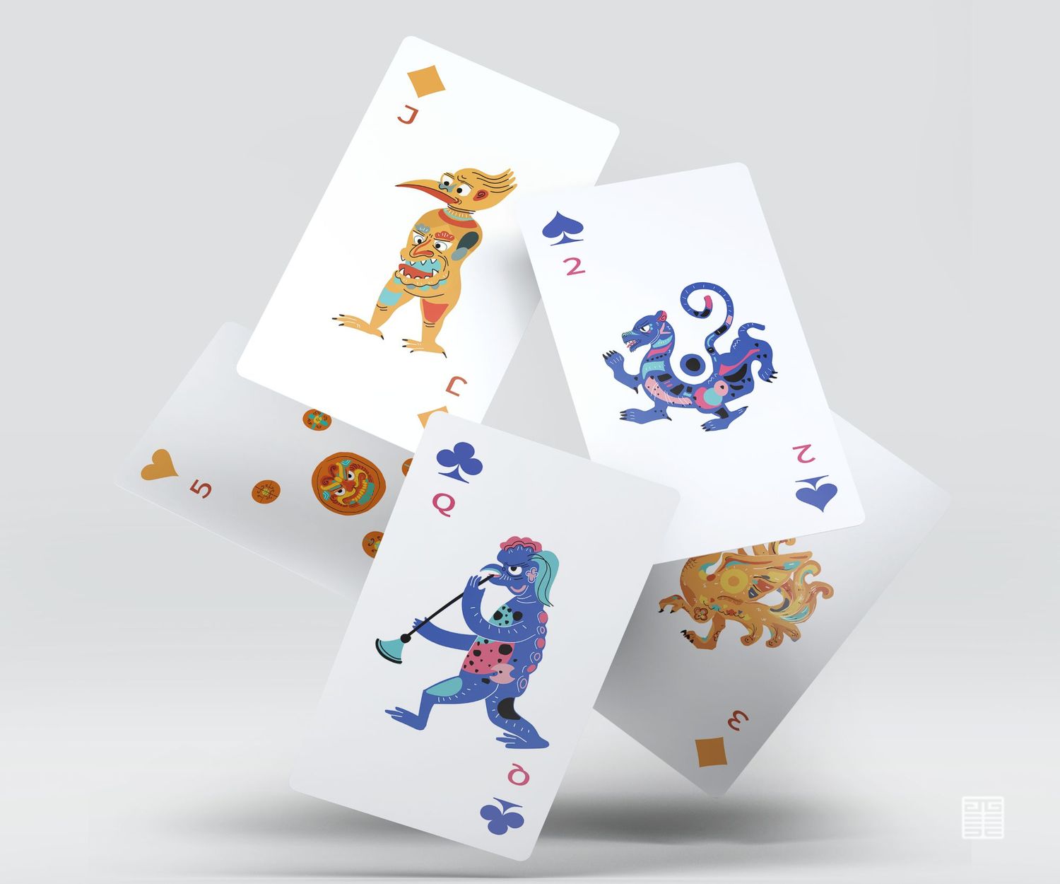 以扑克牌为载体,秦砖汉瓦博物馆及西安明清皮影艺术博物馆中生动的造型为原型创作。有趣的形态,结合以往课程提供的构成基础,提炼相关元素加以创作,制作出以“怪”为题的小插画文创。
