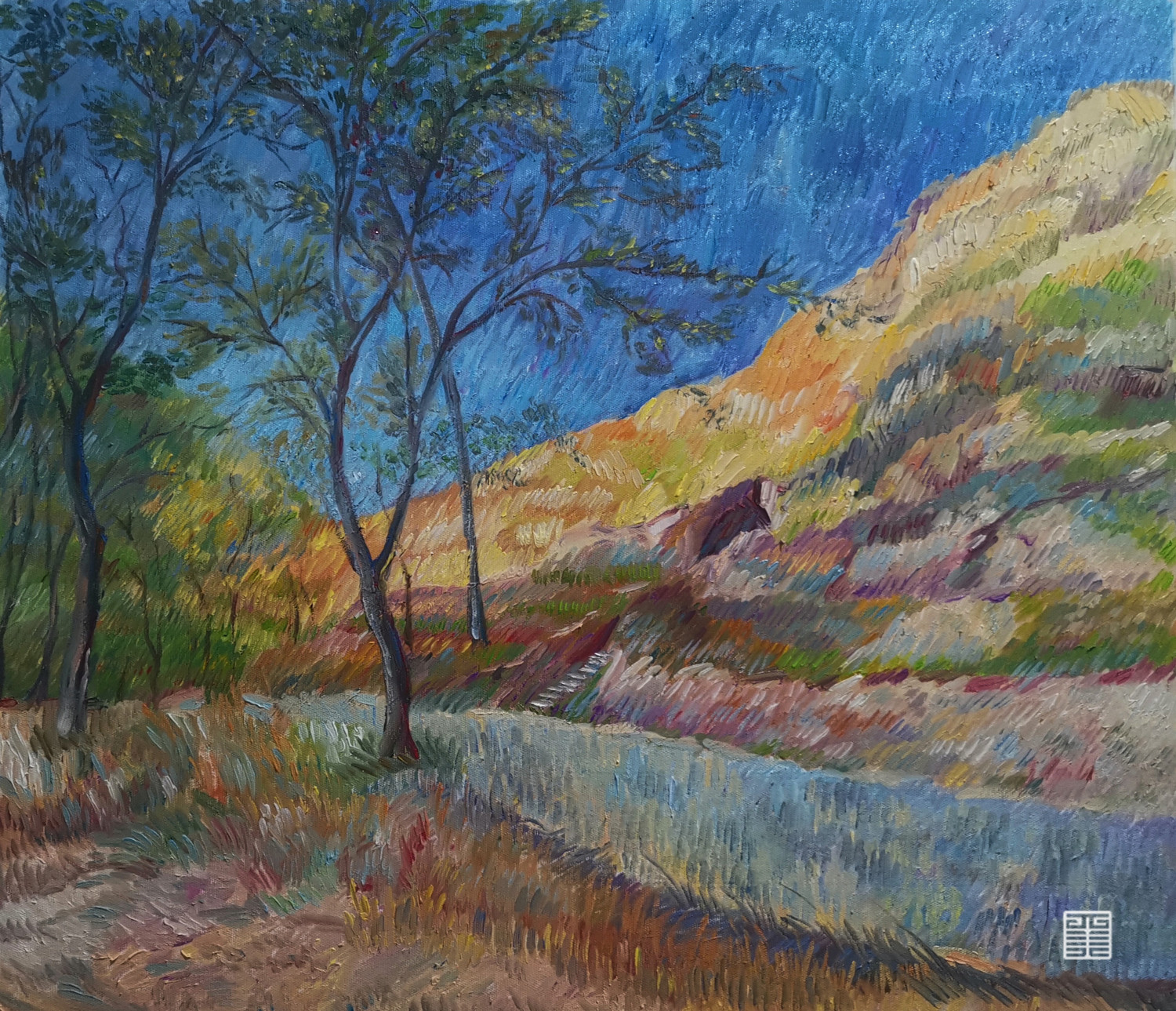 太阳快落时的一副景,那一束光照亮的远山,颜色特别好看,就像是黑暗中的希望。