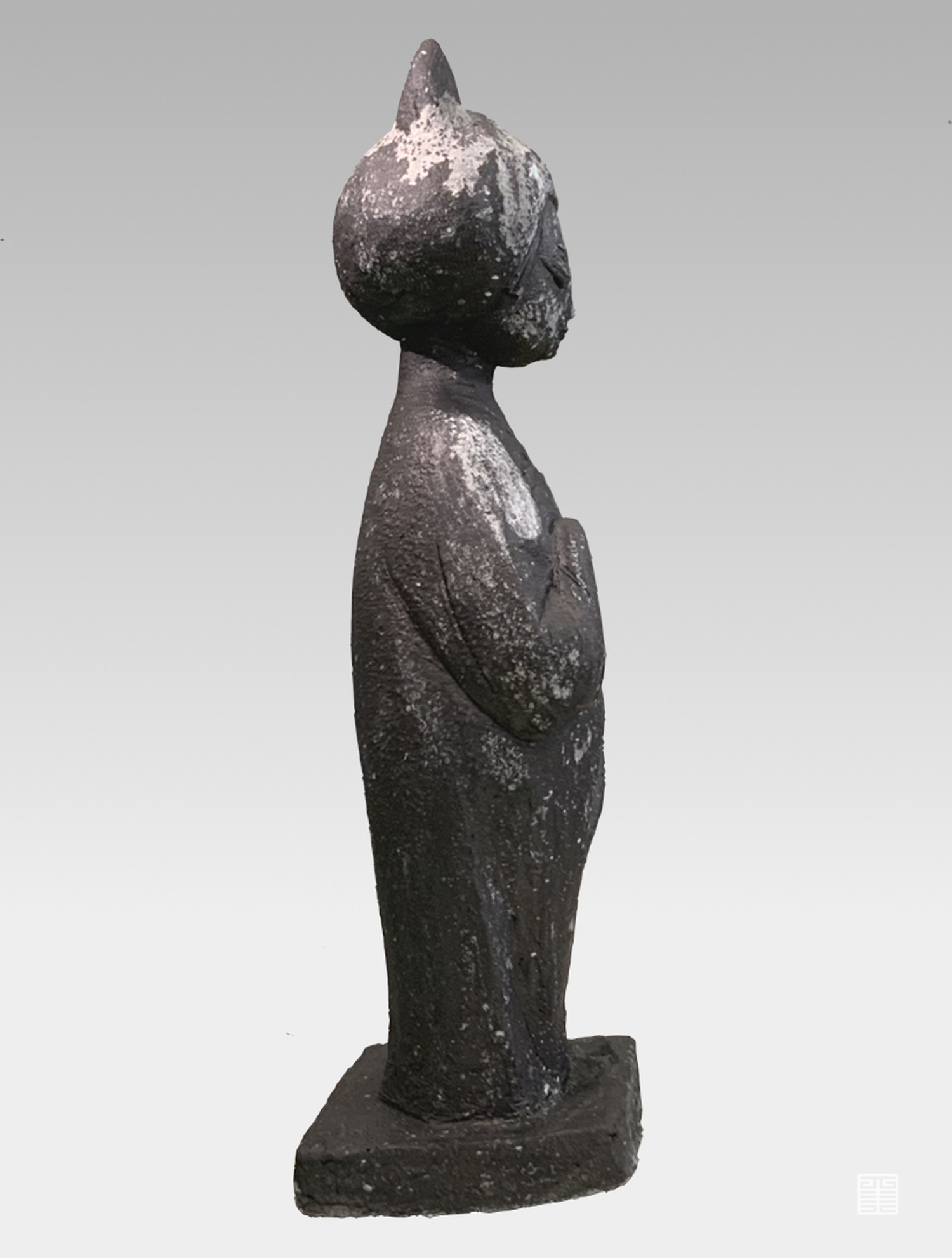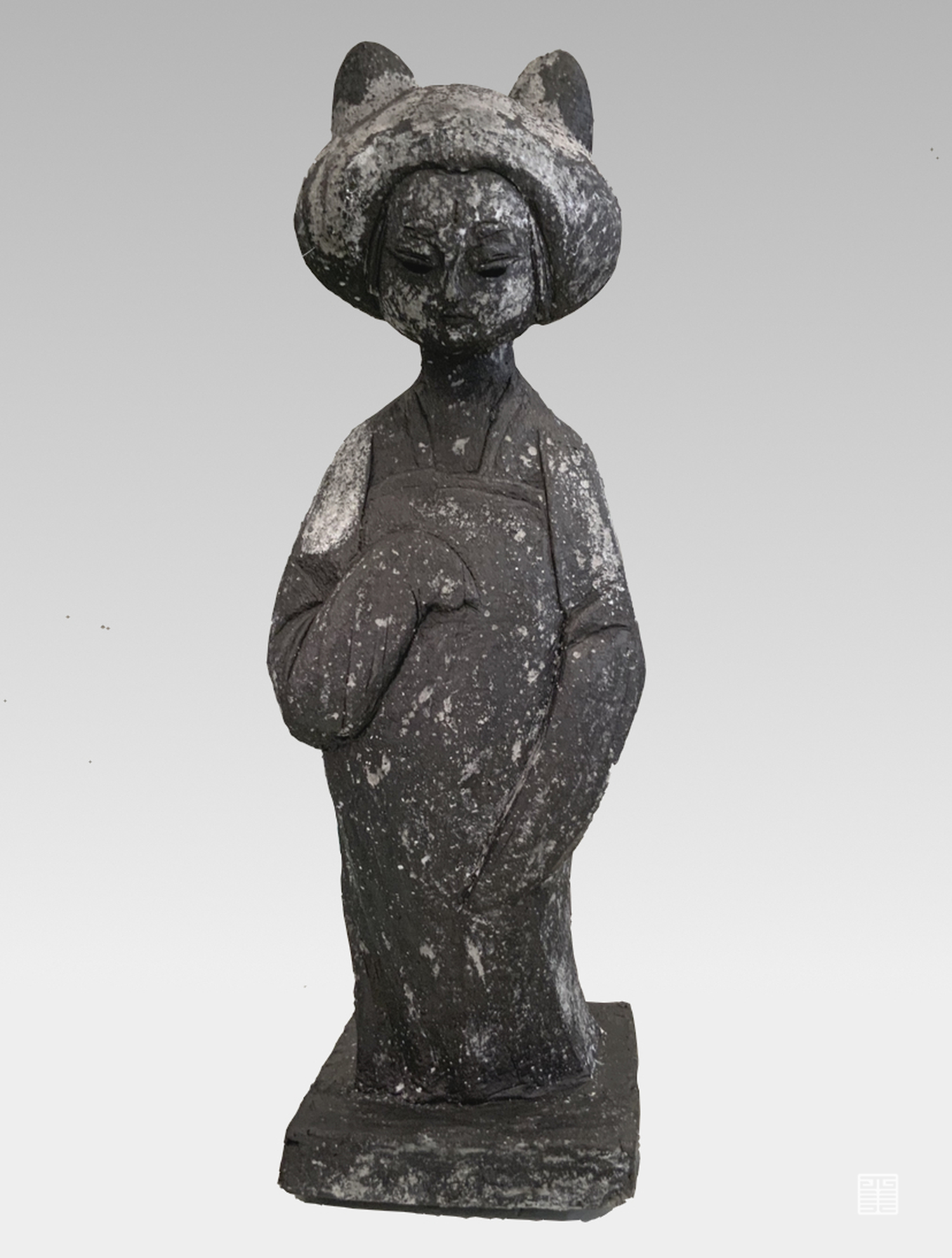 参考了唐代仕女的妆发和服饰,同时融合了中国神话山海经中的瓷娃娃形象,在头上加了一对猫耳,有了妖的元素更添一丝魅惑感。