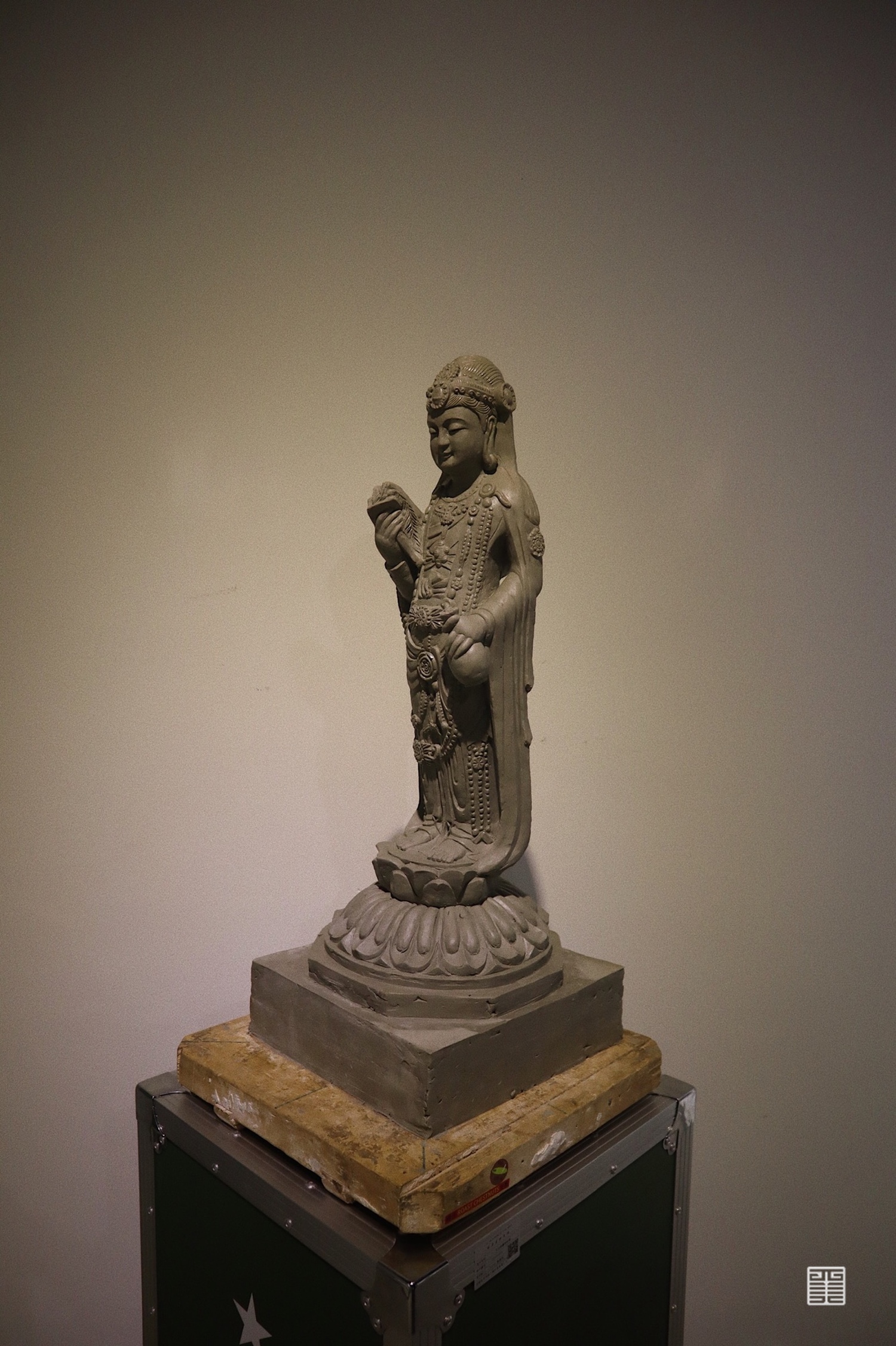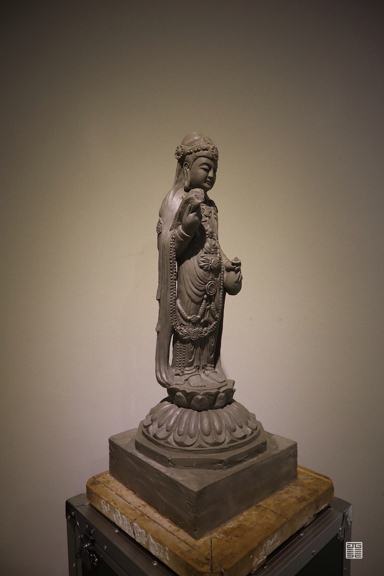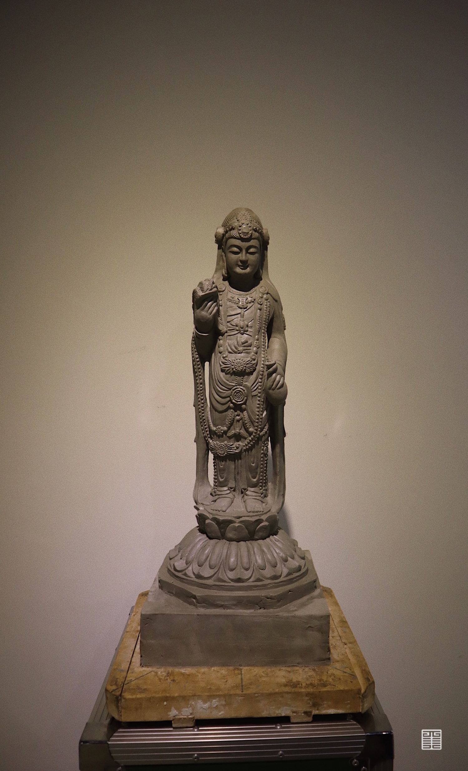 观音下着长裙,腰束裙带,臂着莲花纹钏,腕戴双条形镯。右臂从肘部上屈,手执柳枝,左臂微屈于腹,手提净瓶,跣足立于仰莲花座上,座下有高2厘米的榫。仰莲花座下方有方形青石覆莲花座。