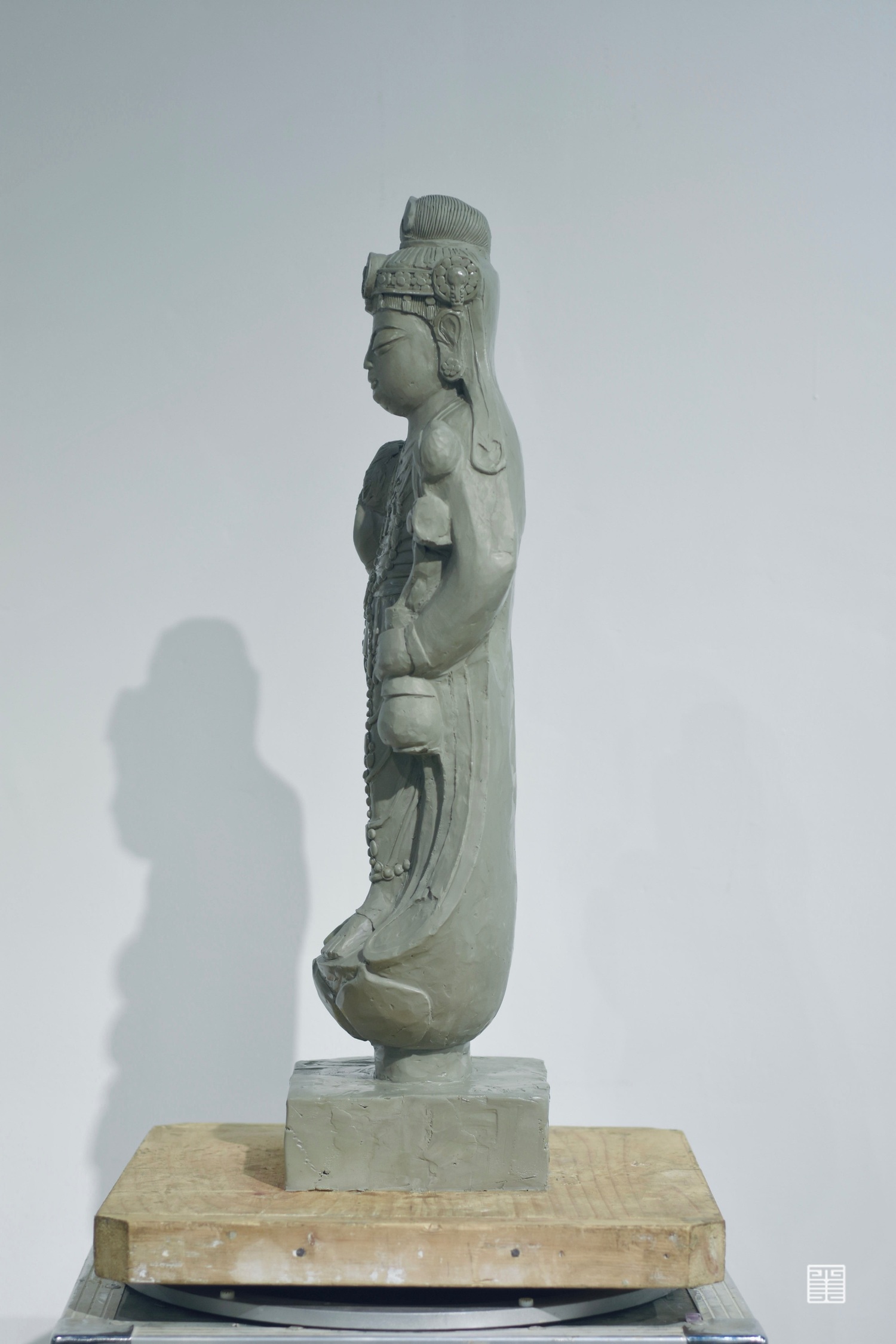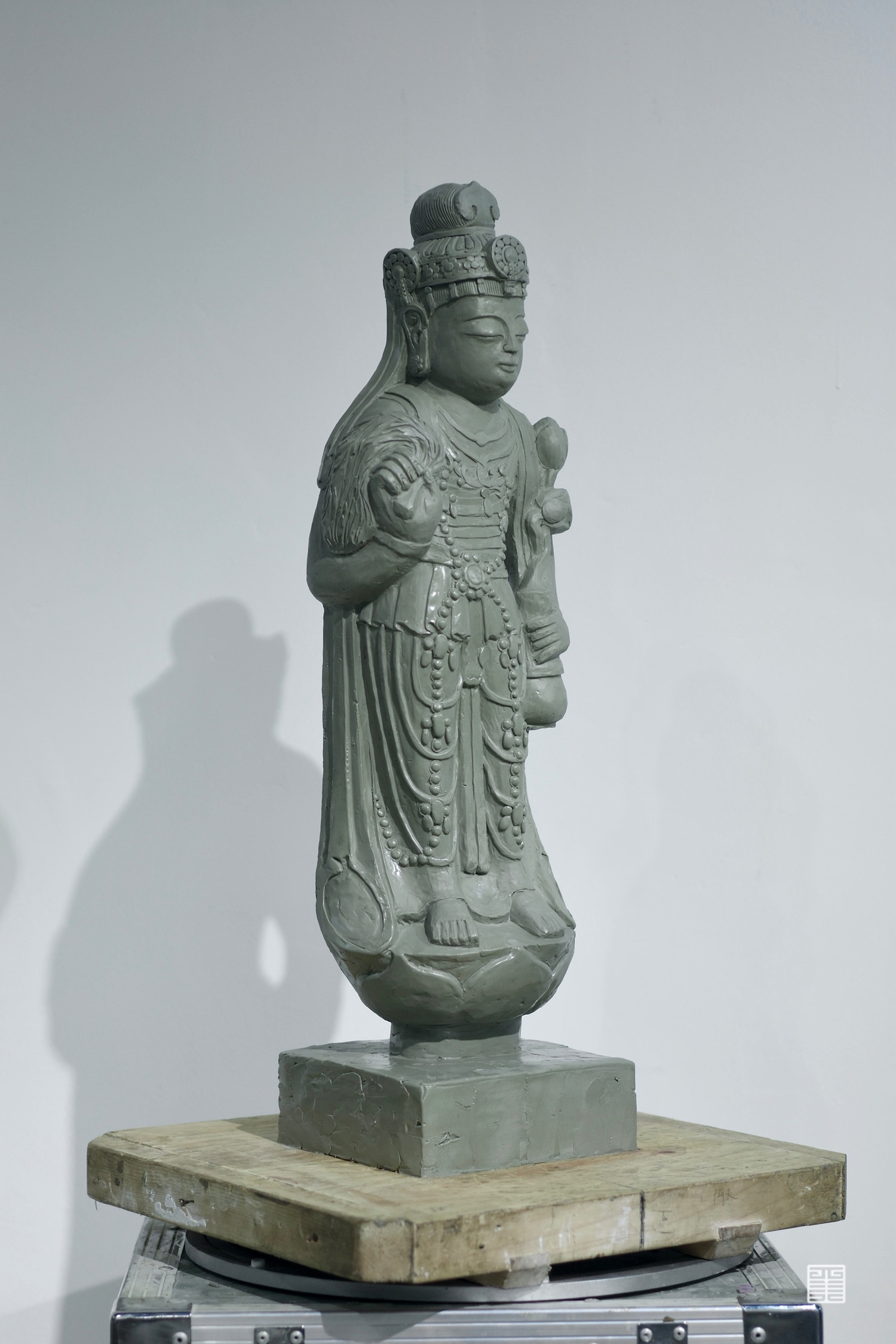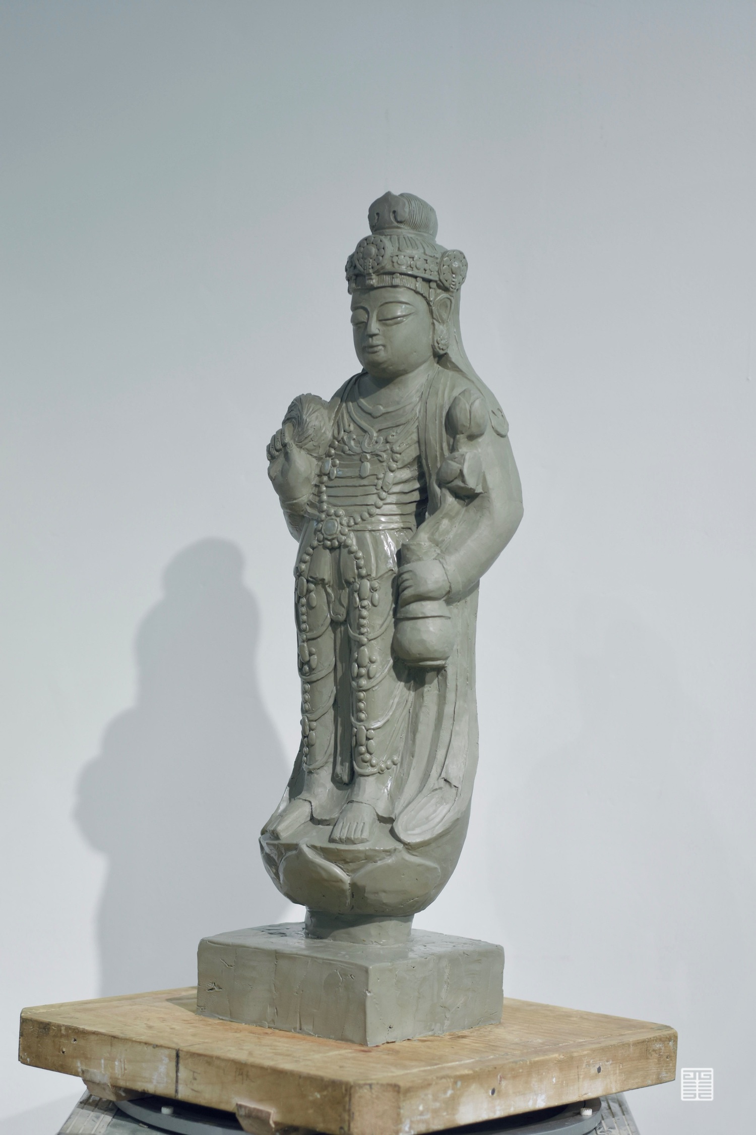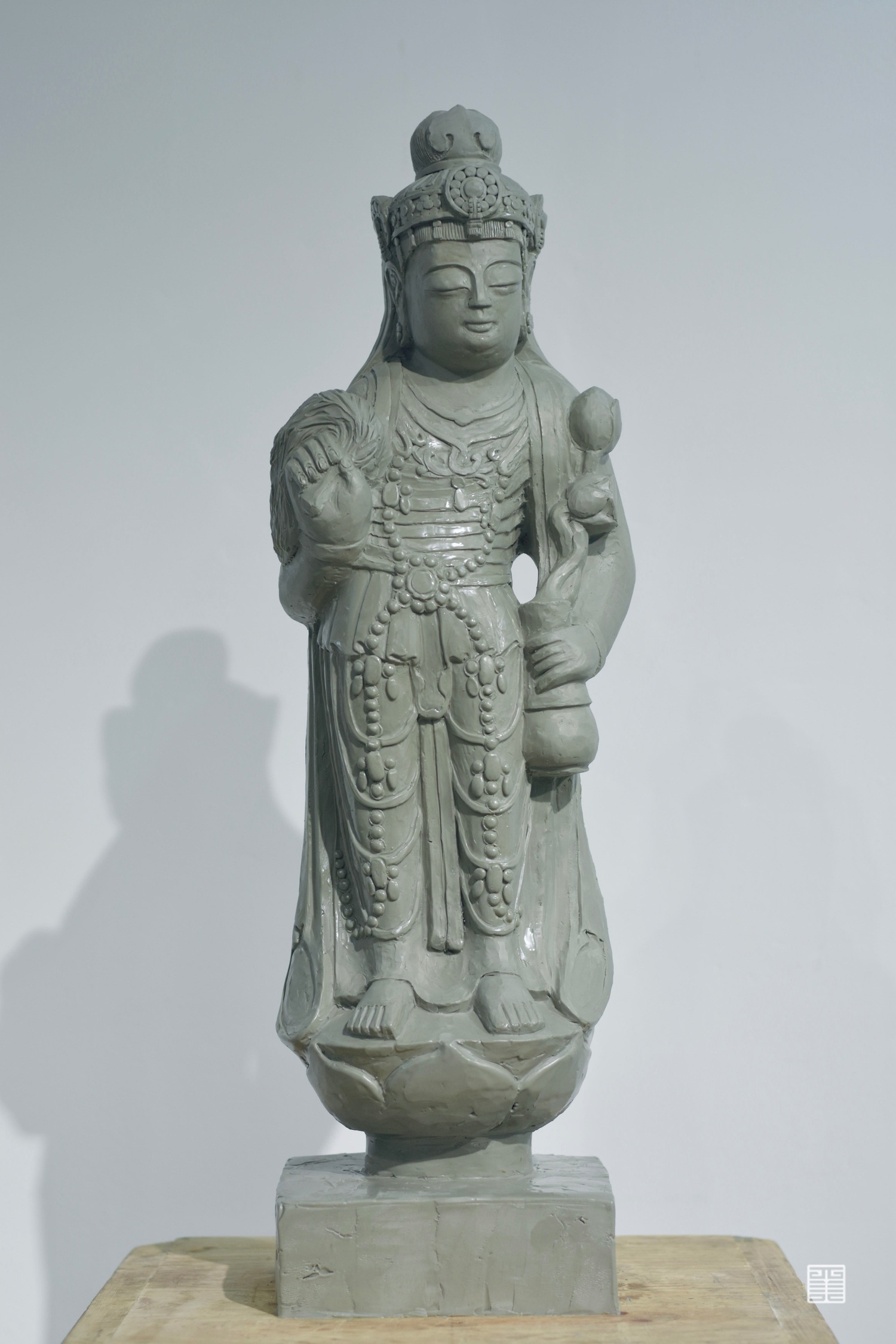 右臂半举,手执柳枝,左臂屈于腹侧执法器。身躯魁伟,体魄健壮,装饰华丽,跣足立于重辦仰莲花座上。座下有凸起榫头,可与基座相连,但基座己佚。
